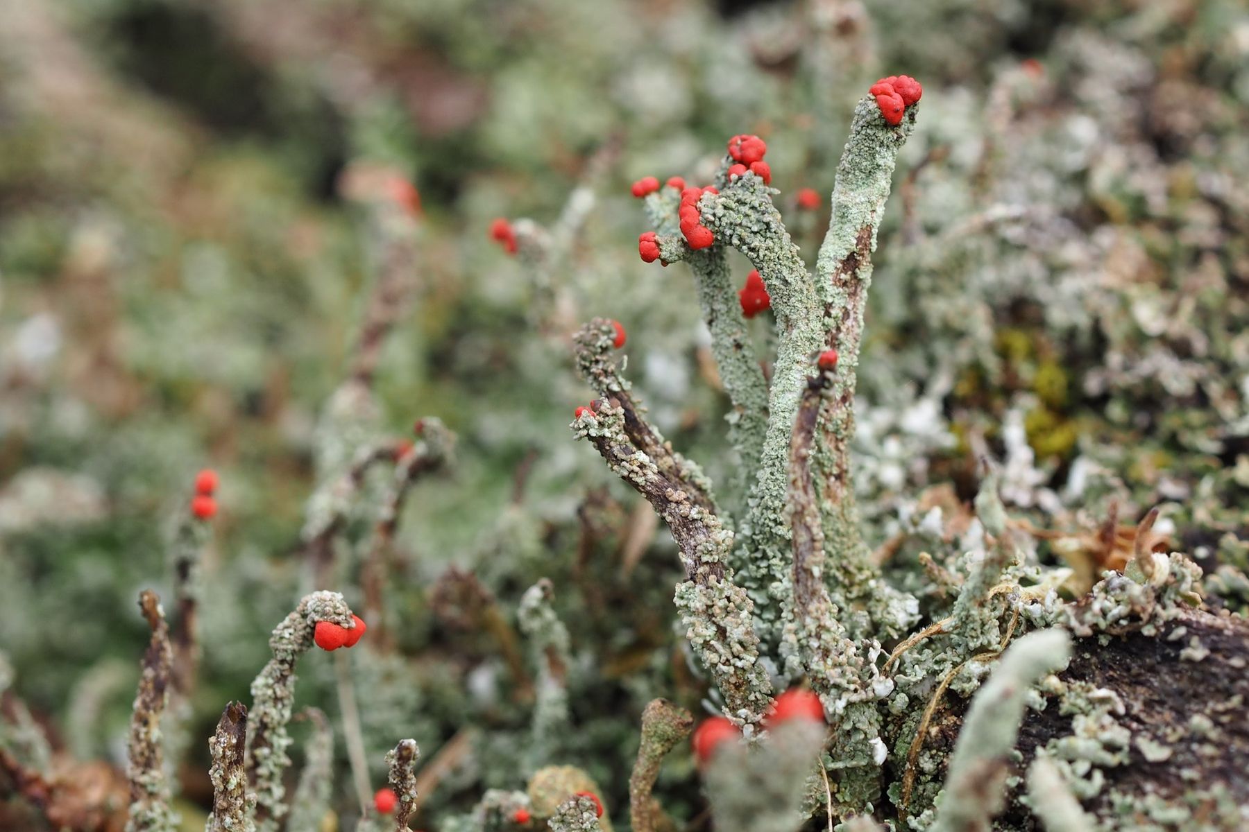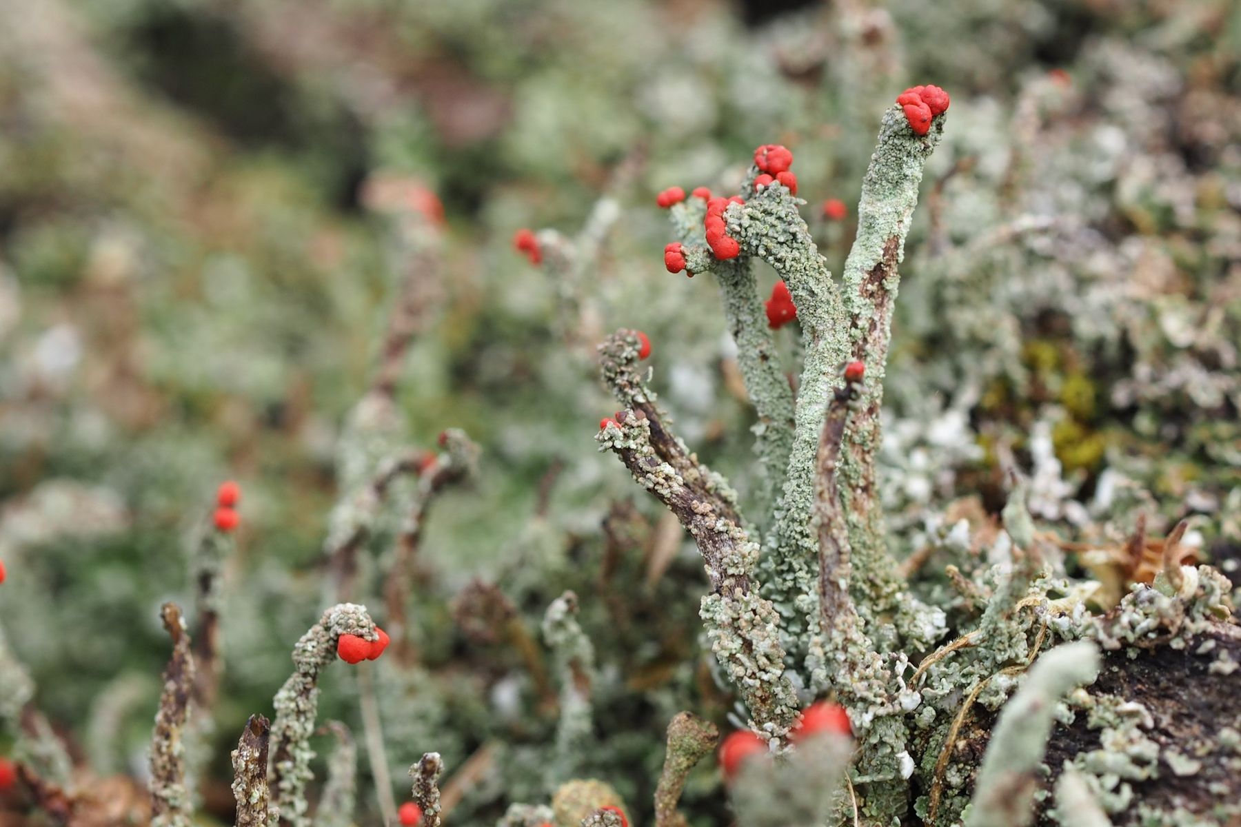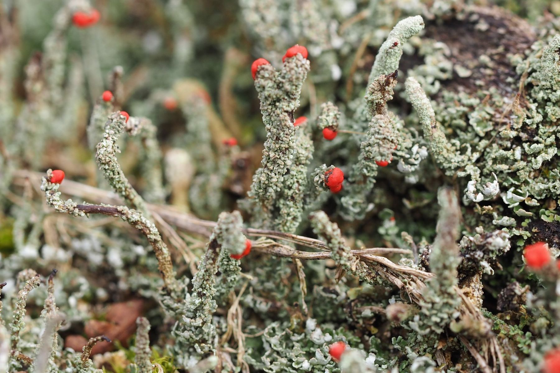 Bei 123pilze habe ich mal unter Flechten nachgeschaut und vermute, dass es sich um die Rotfrüchtige Säulenflechte Cladonia Macilenta handelt.
