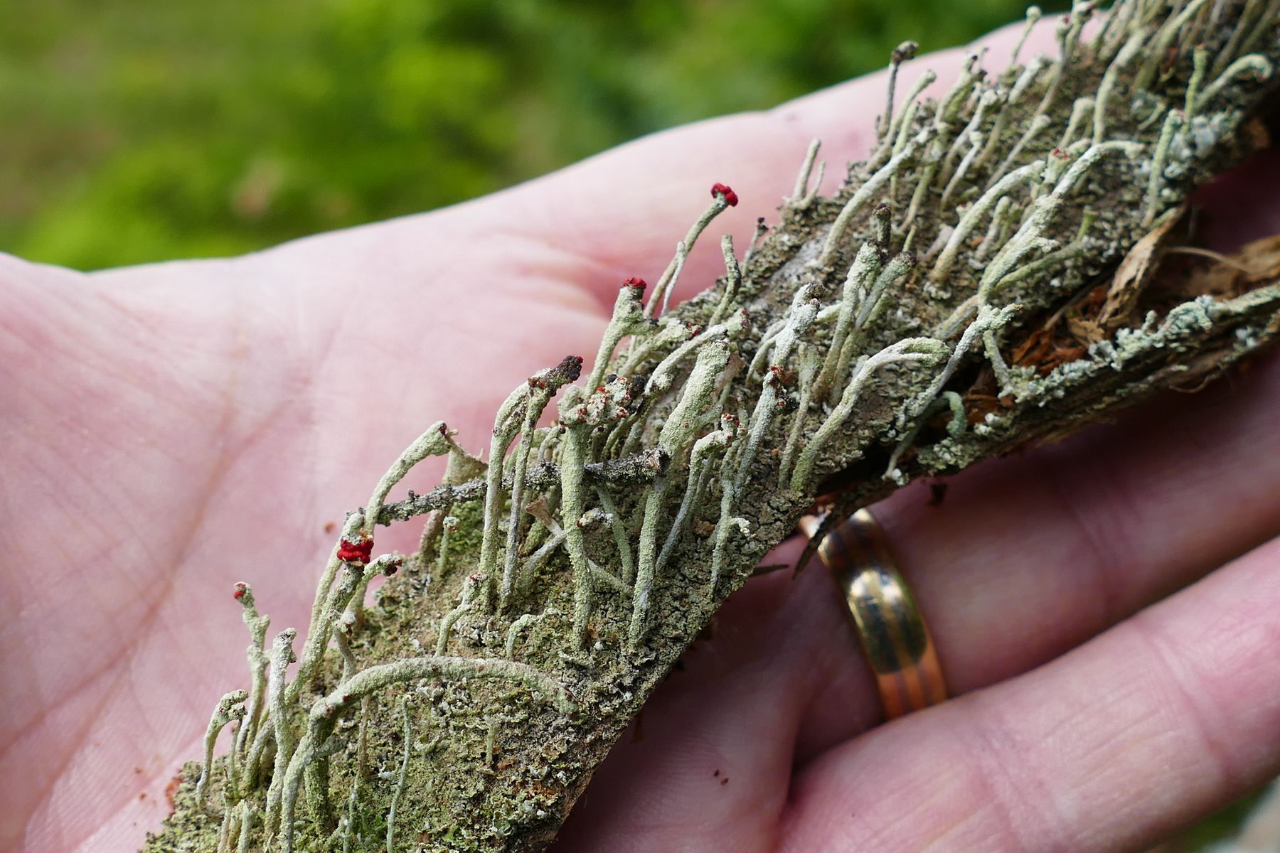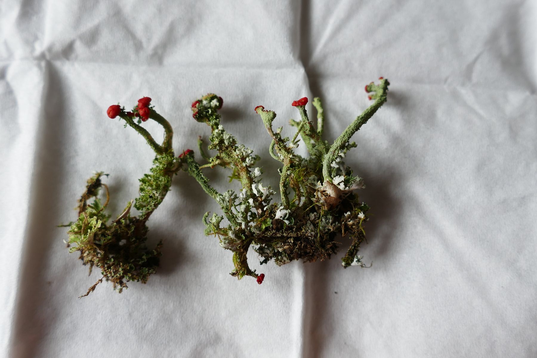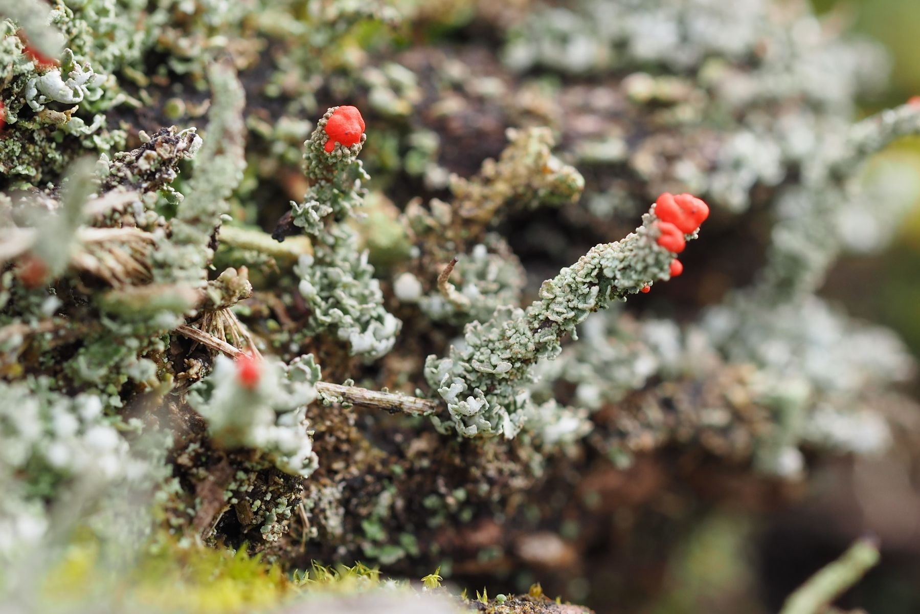 Bei 123pilze habe ich mal unter Flechten nachgeschaut und vermute, dass es sich um die Rotfrüchtige Säulenflechte Cladonia Macilenta handelt.