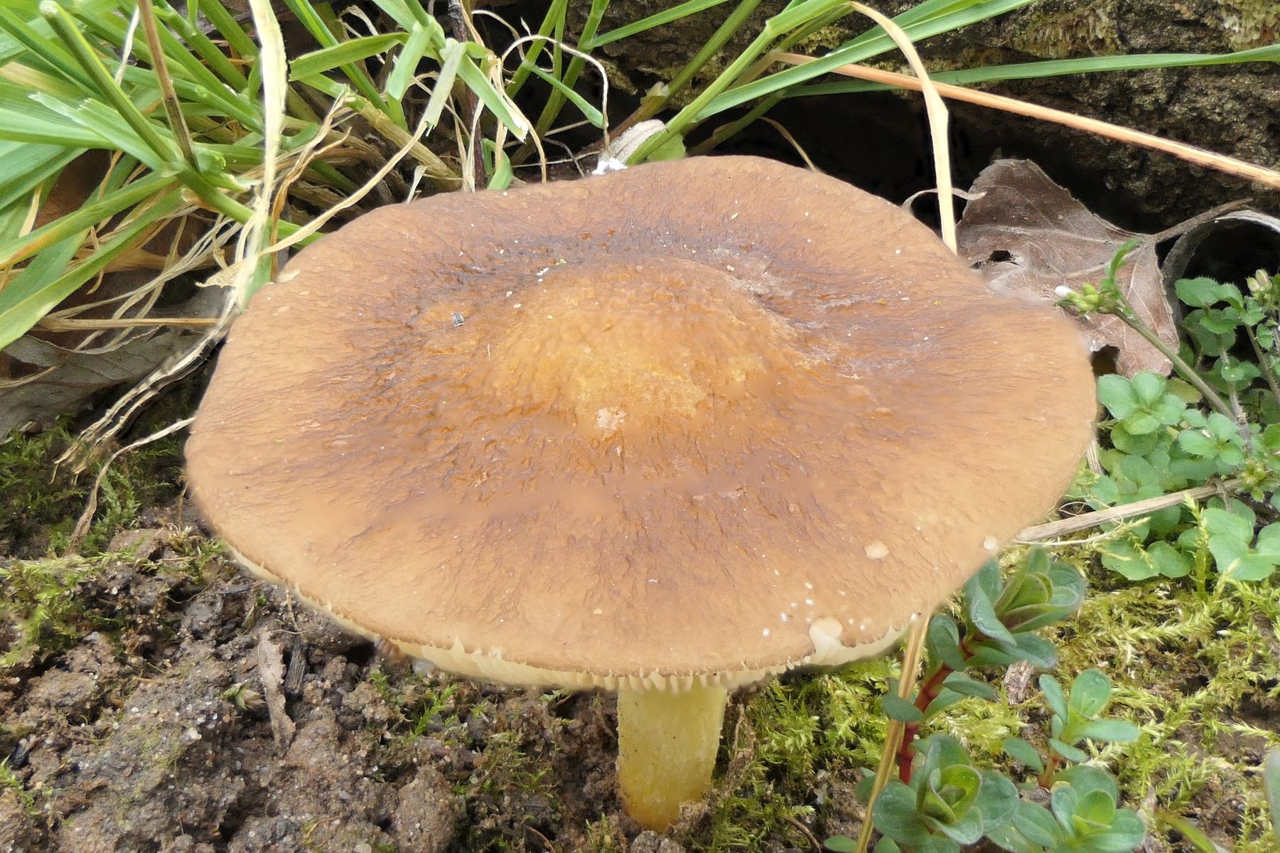 Wenn die Pilze einfach die Bücher nicht lesen, dann erscheint auf einmal Pluteus romellii, der gelbstielige Dachpilz mit großen, prächtigsten Fruchtkörpern mitten im März und dann auch noch auf dem Boden: