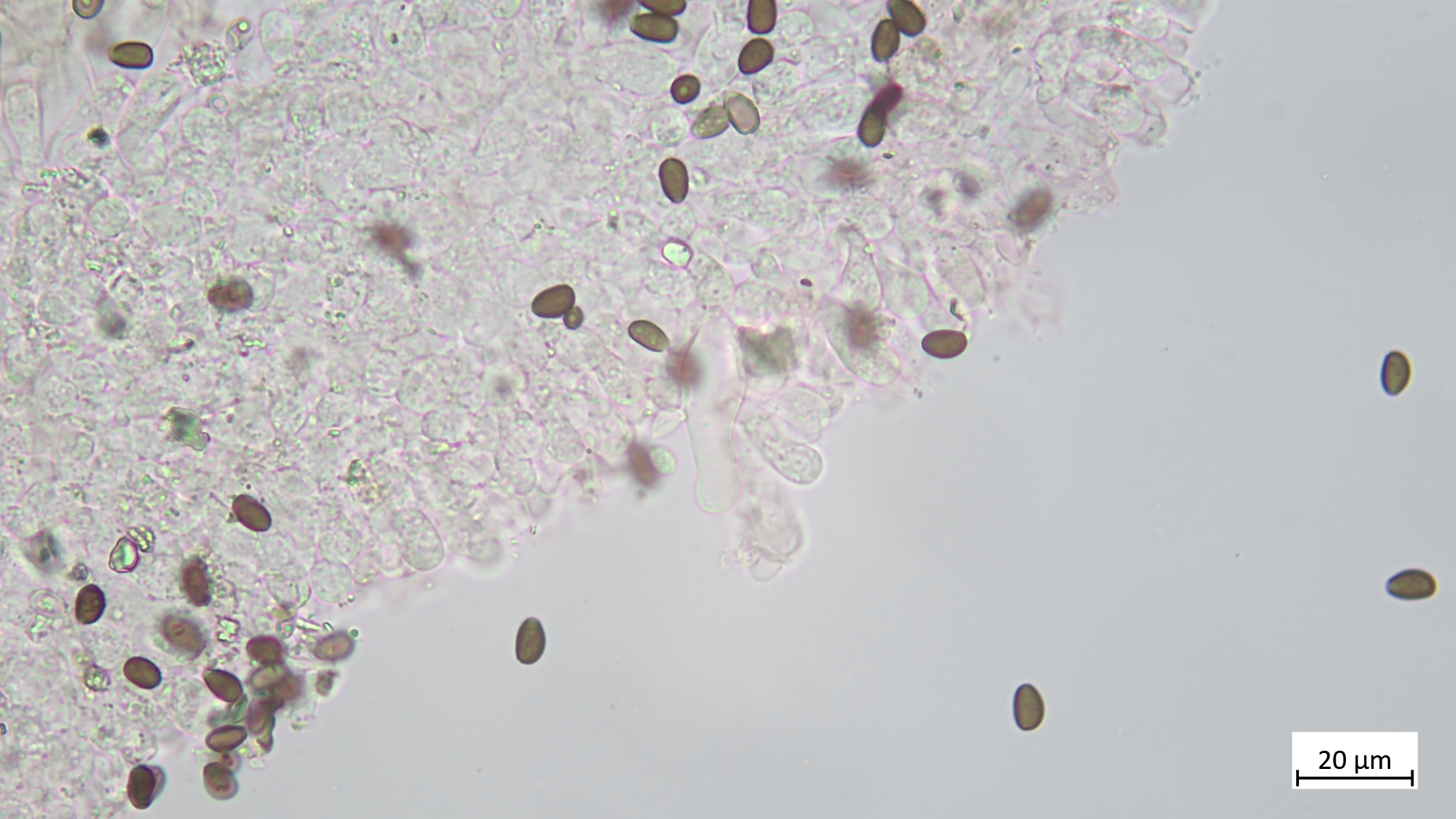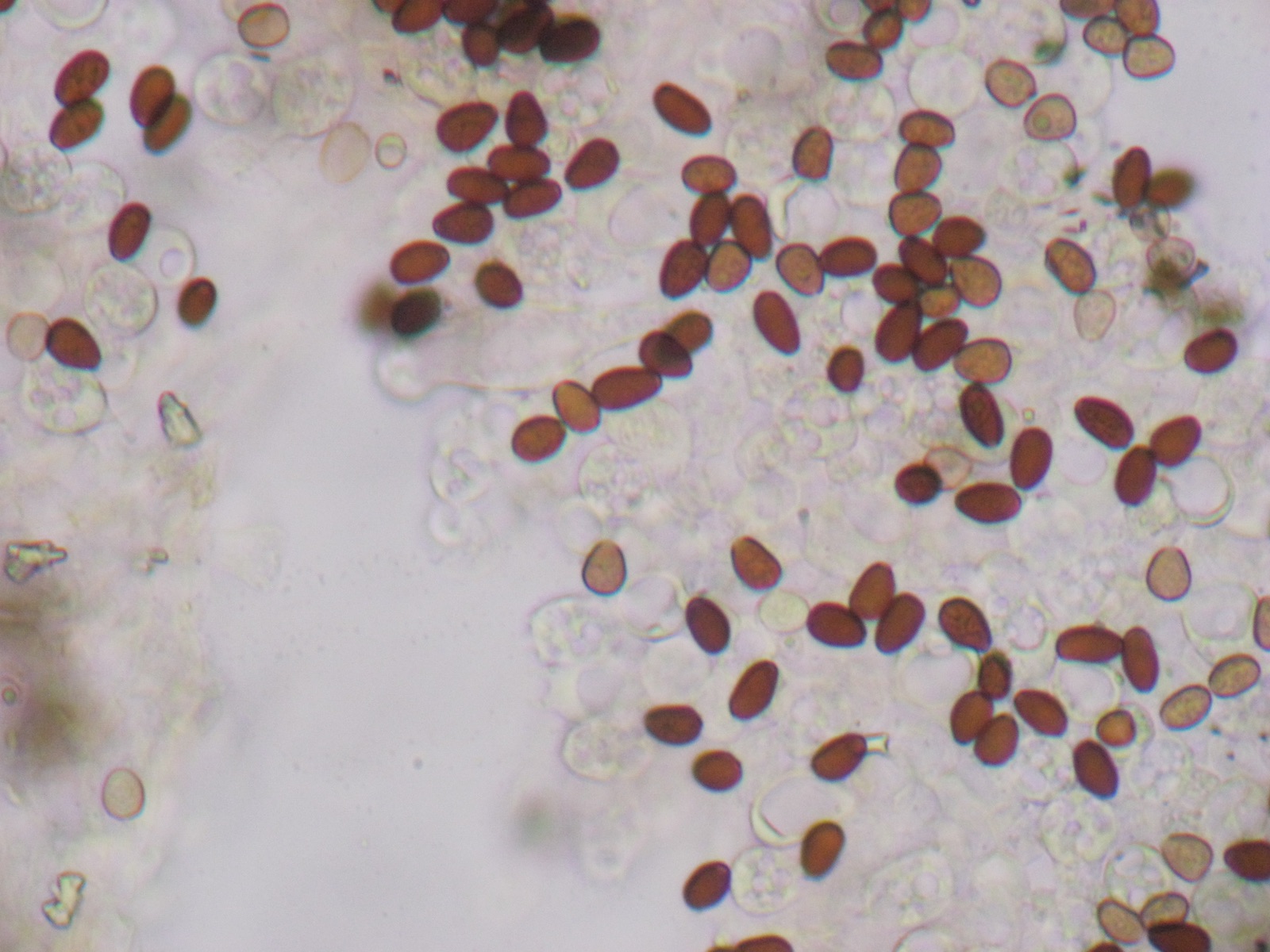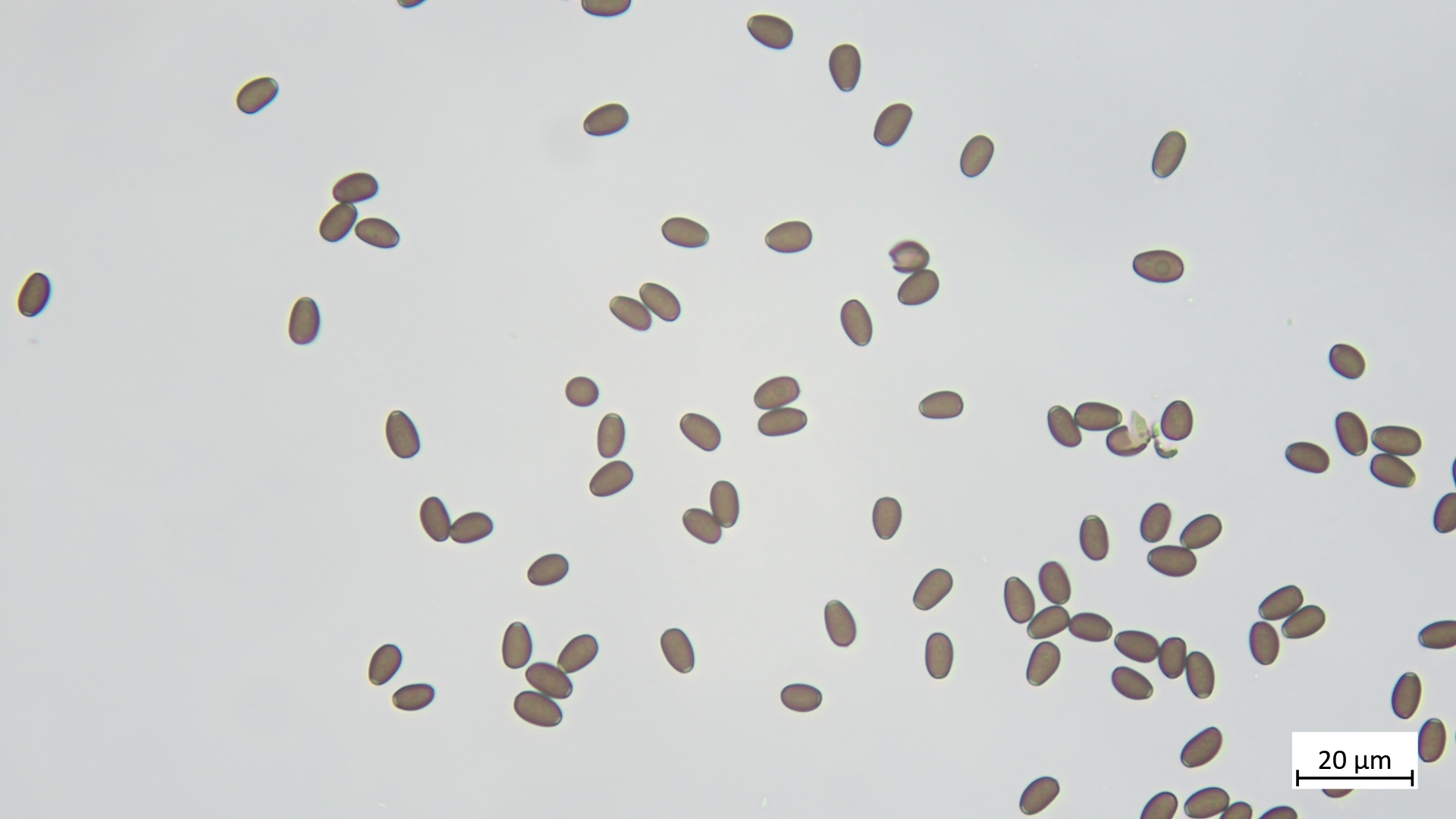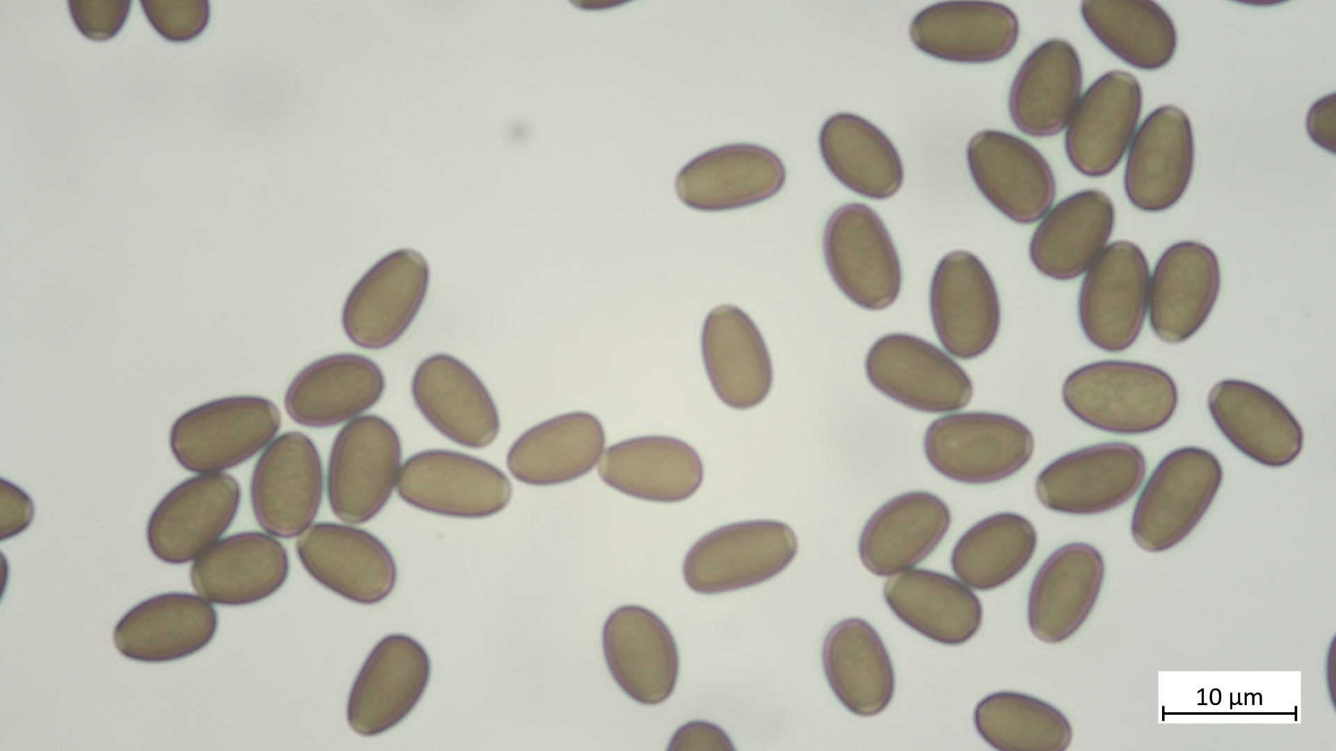 Sporen (in KOH3%) ellipsoid bis angedeutet apfelkernförmig: 7,5-8,8 µm (av. 8,2 µm, SD 0,3 µm) x 4,6-5,4 µm (av. 4,9 µm, SD 0,2 µm); Q = 1,5-1,8 (av. 1,7, SD 0,1)(n = 25)