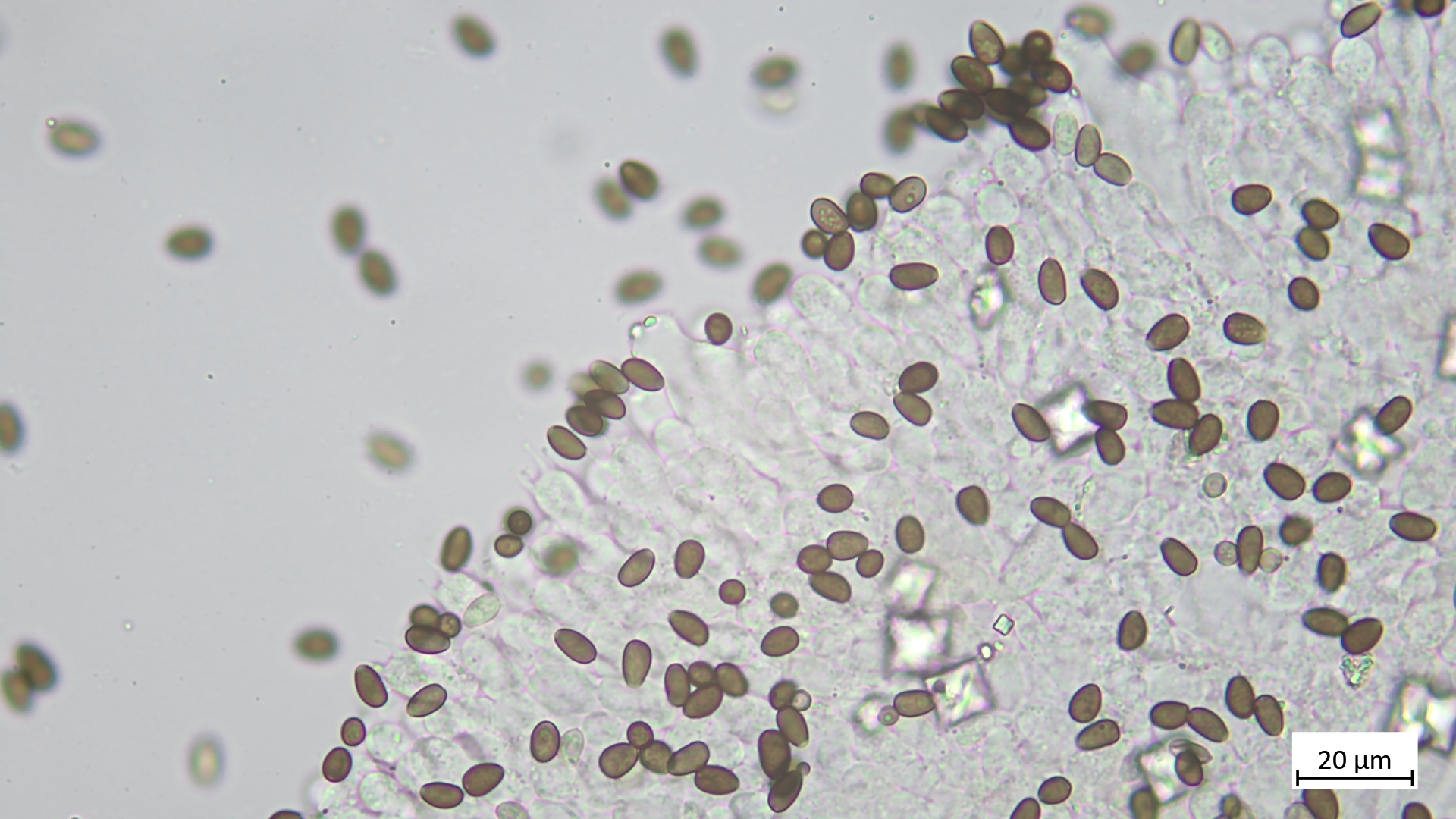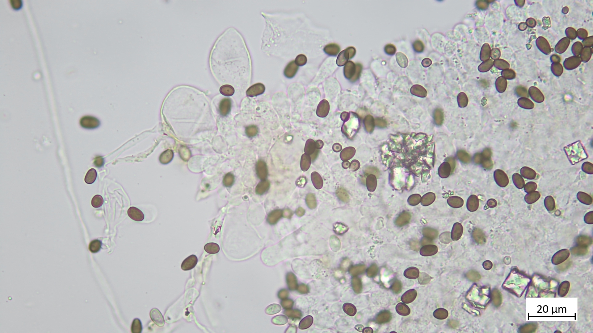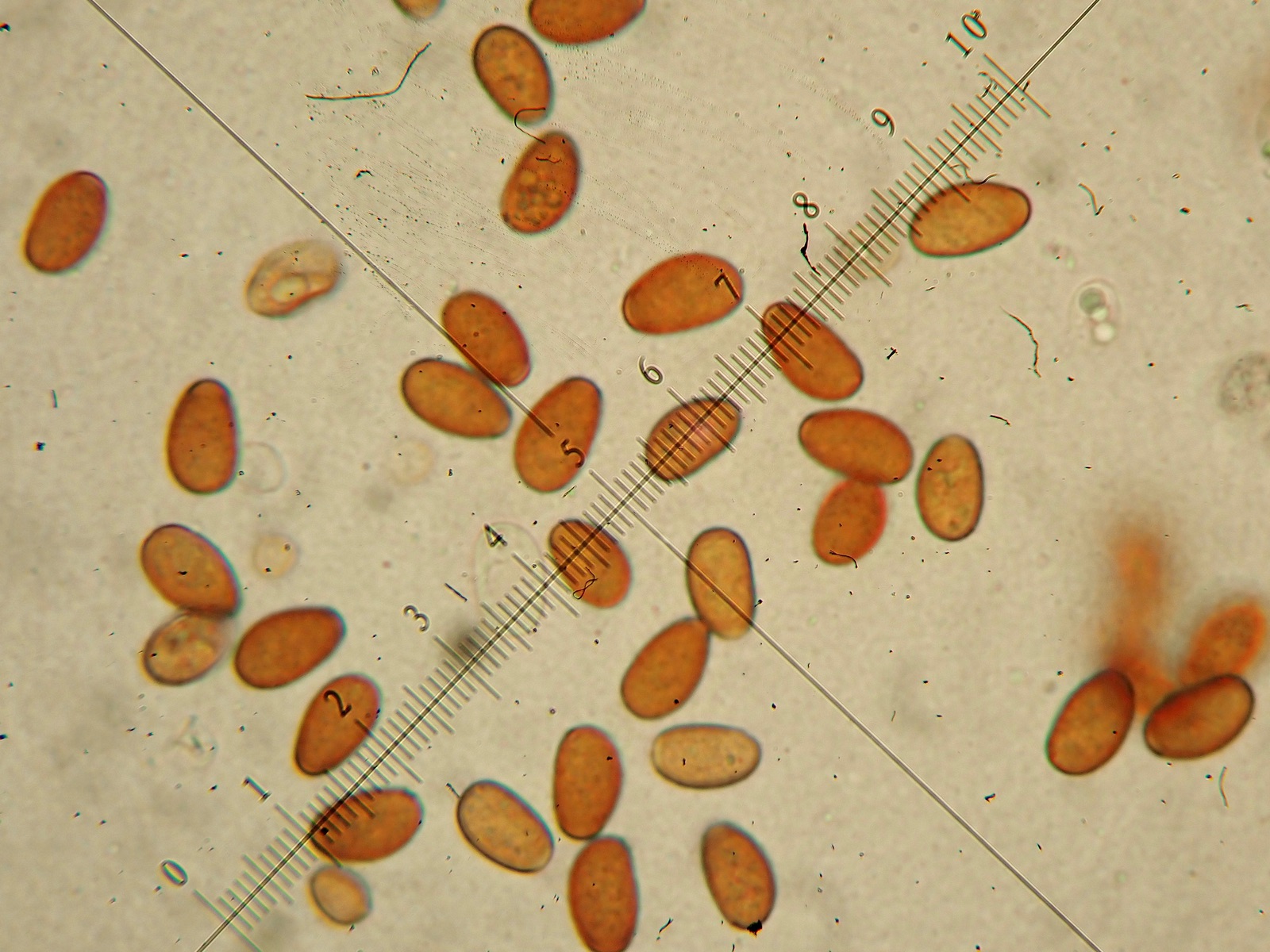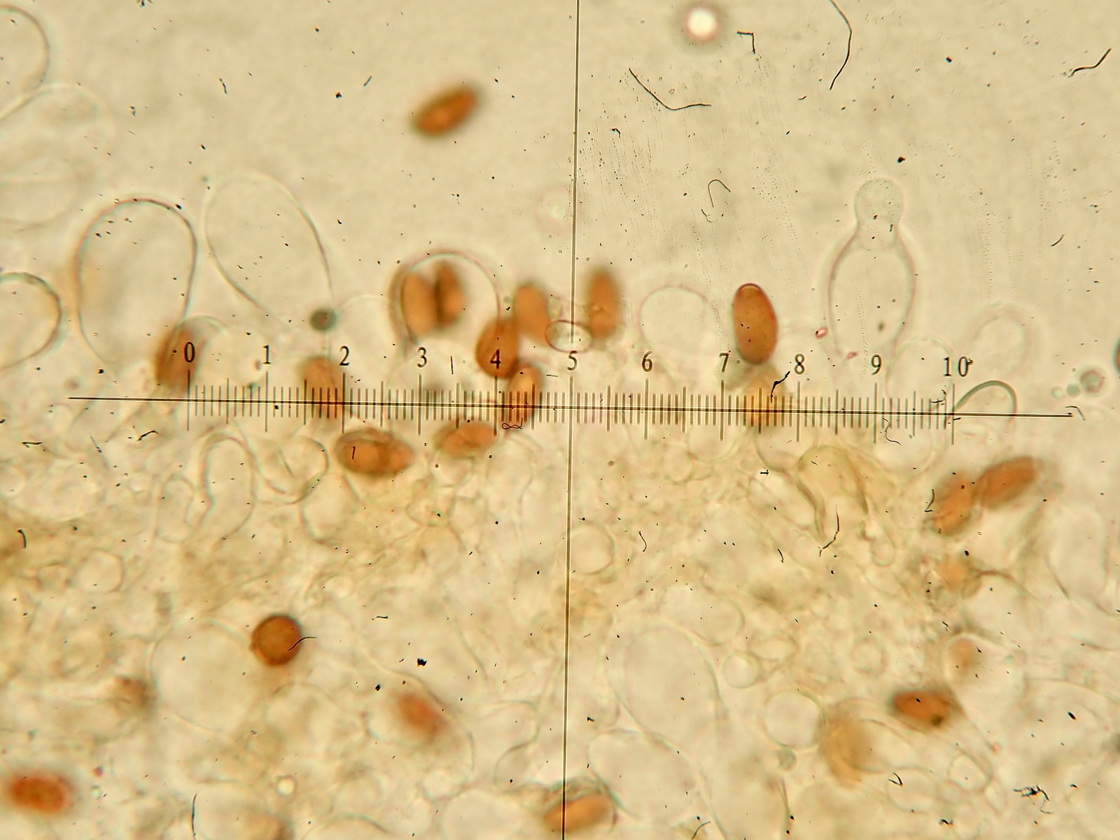 Sporen (in KOH3%) ellipsoid bis angedeutet apfelkernförmig: 7,5-8,8 µm (av. 8,2 µm, SD 0,3 µm) x 4,6-5,4 µm (av. 4,9 µm, SD 0,2 µm); Q = 1,5-1,8 (av. 1,7, SD 0,1)(n = 25)