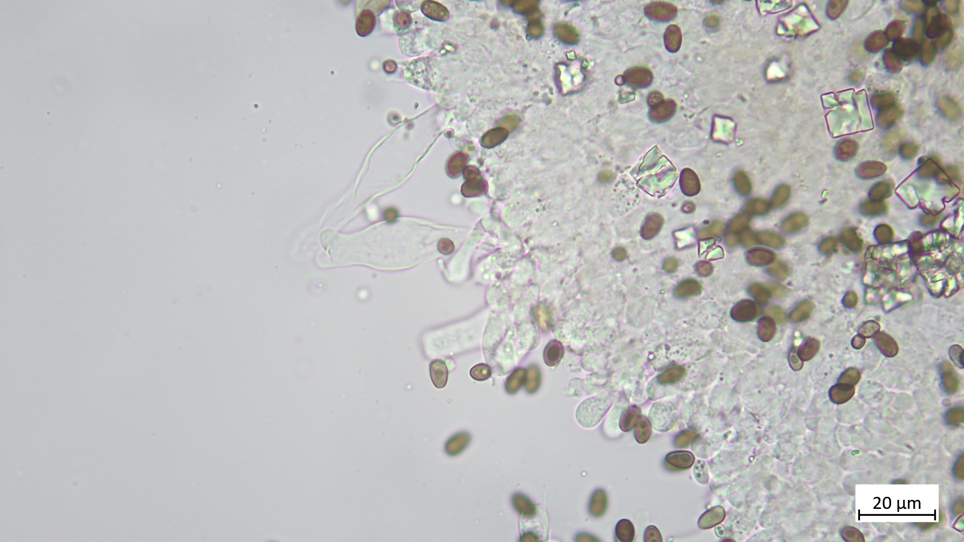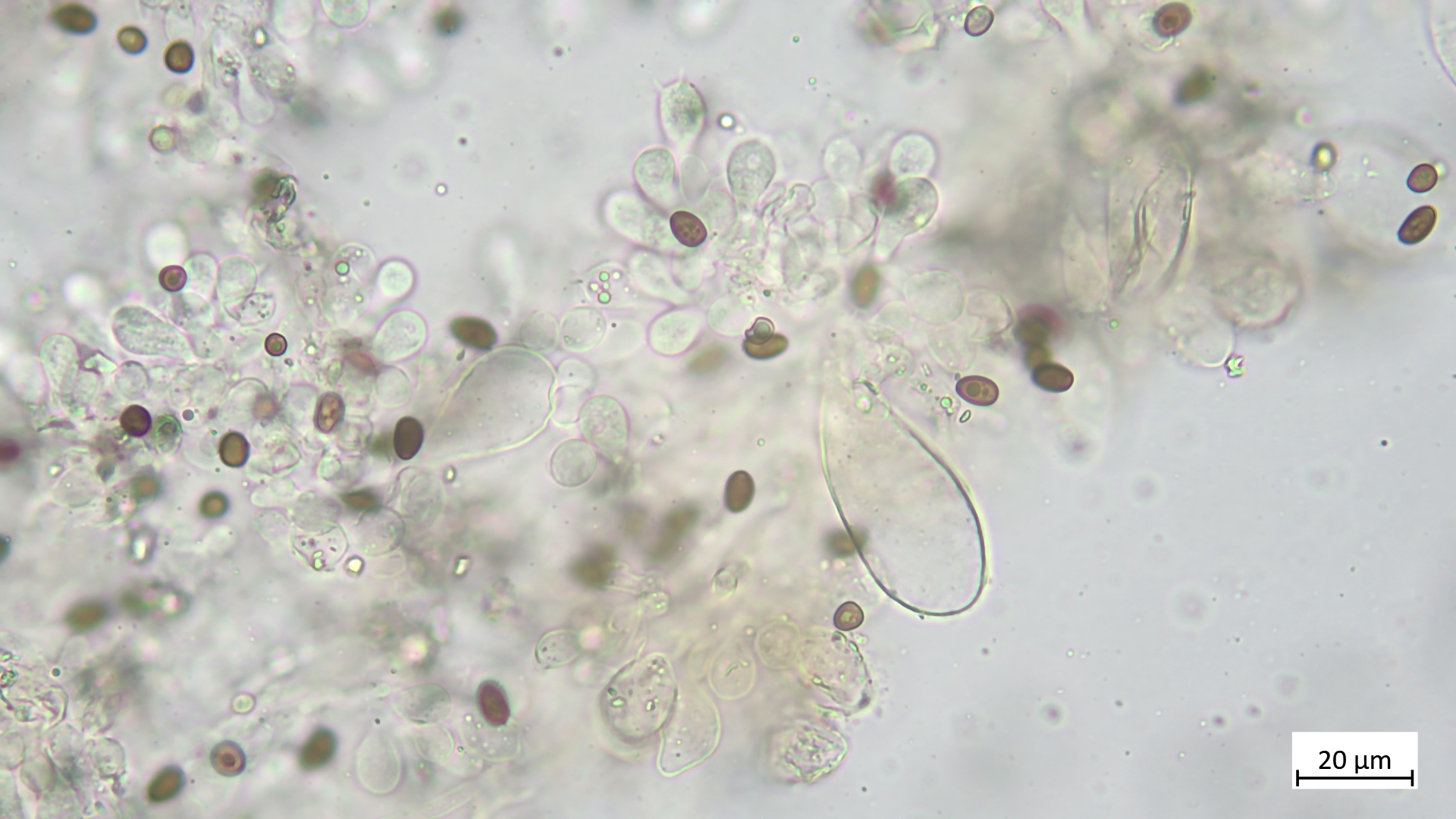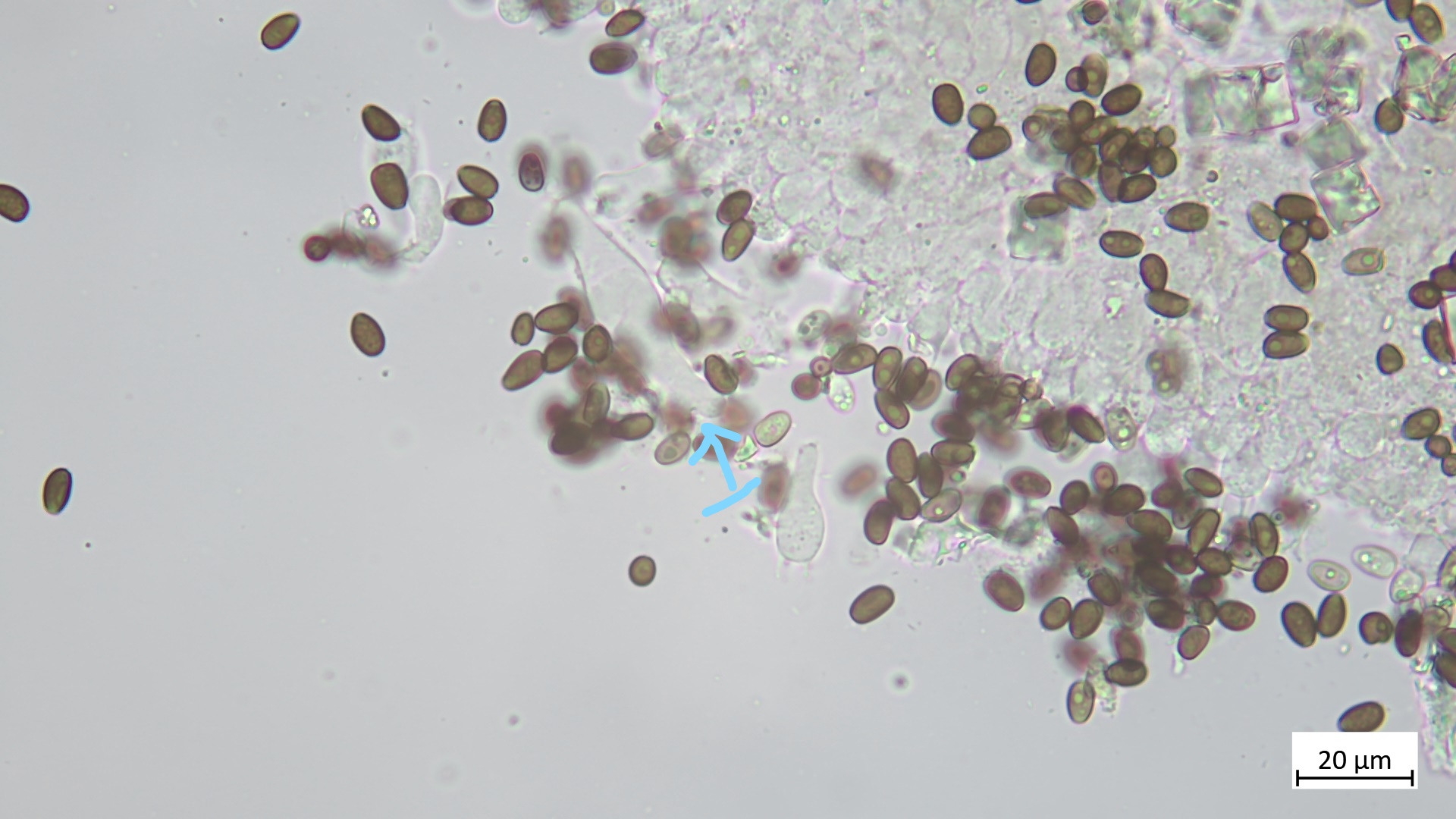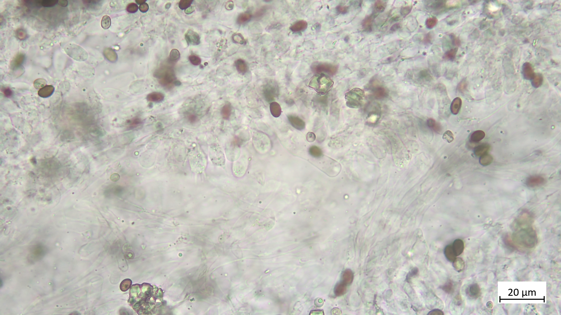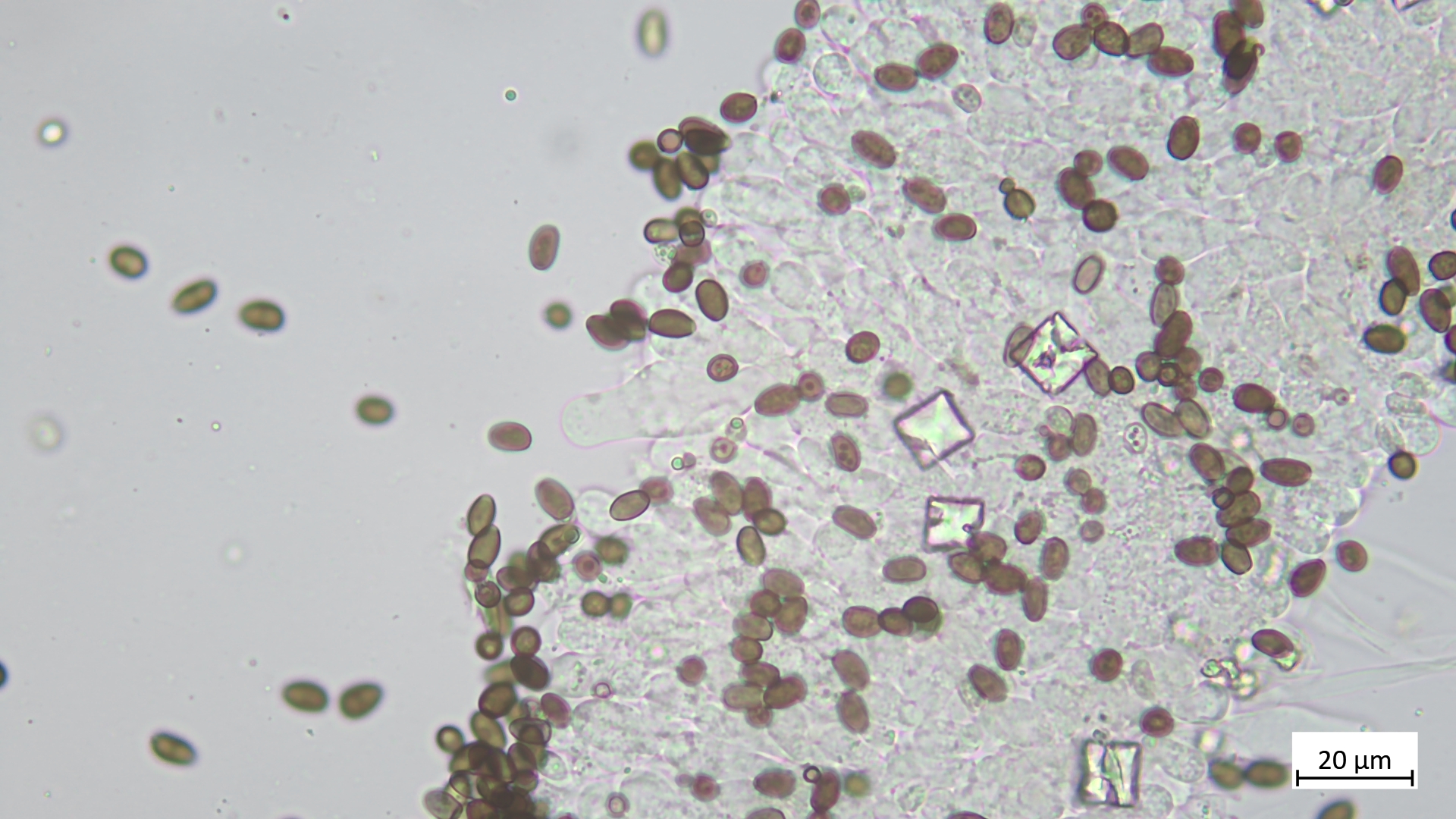 Sporen (in KOH3%) ellipsoid bis angedeutet apfelkernförmig: 7,5-8,8 µm (av. 8,2 µm, SD 0,3 µm) x 4,6-5,4 µm (av. 4,9 µm, SD 0,2 µm); Q = 1,5-1,8 (av. 1,7, SD 0,1)(n = 25)