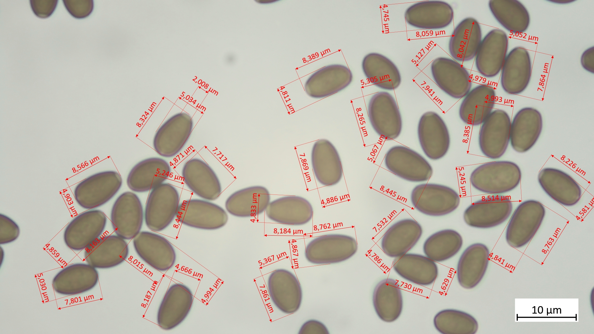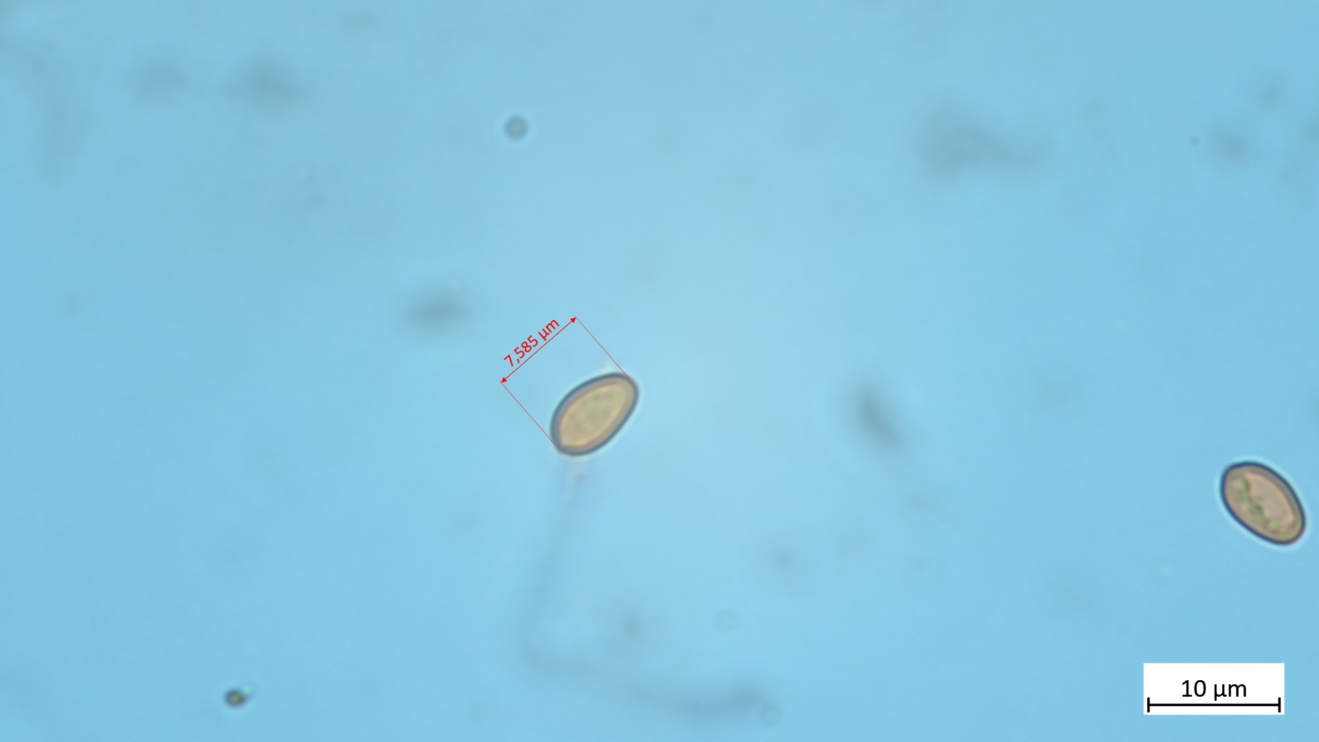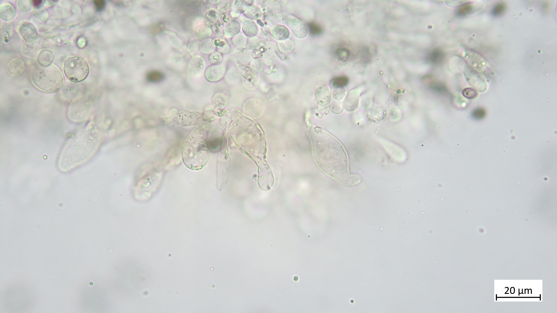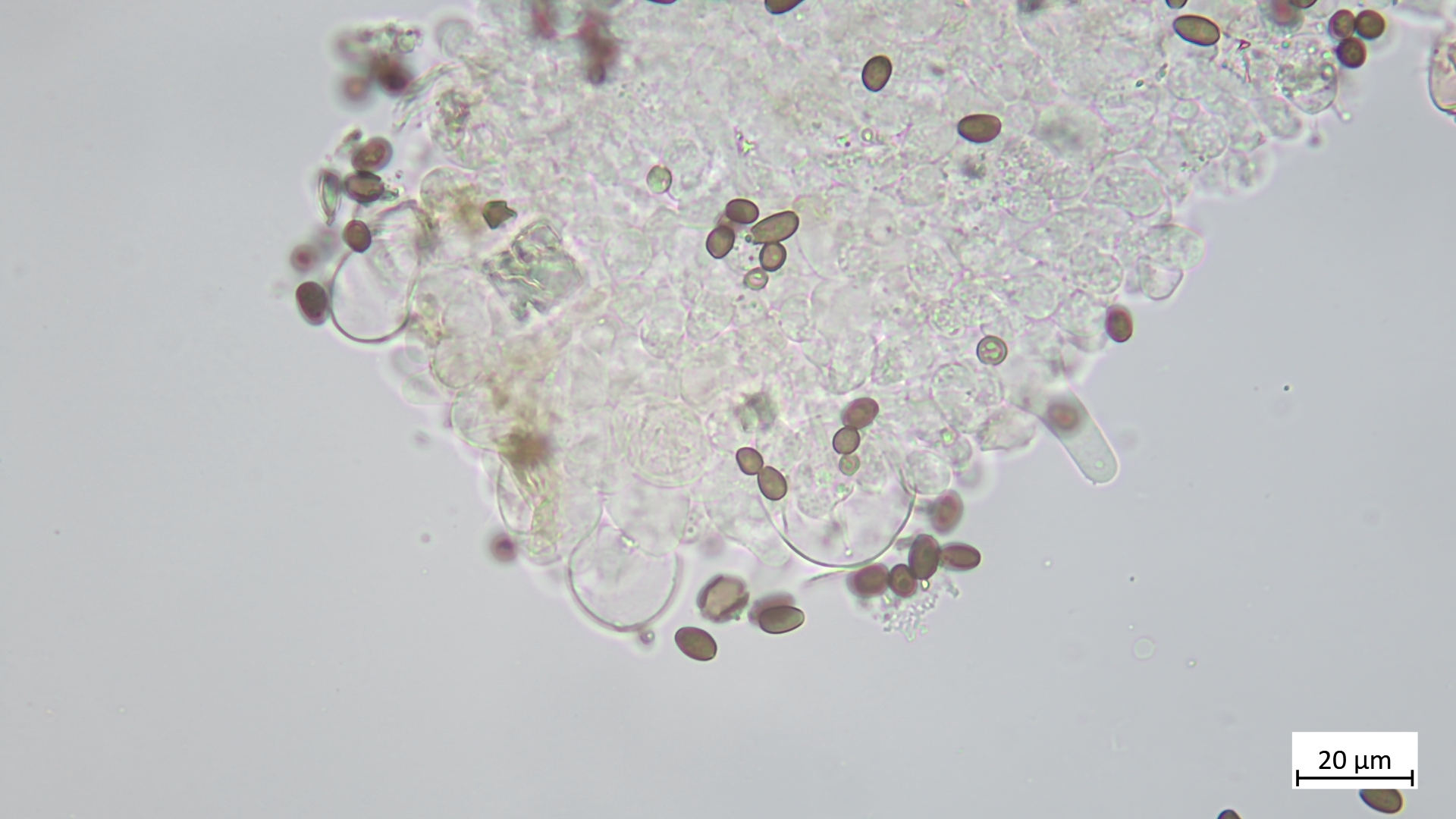 Sporen (in KOH3%) ellipsoid bis angedeutet apfelkernförmig: 7,5-8,8 µm (av. 8,2 µm, SD 0,3 µm) x 4,6-5,4 µm (av. 4,9 µm, SD 0,2 µm); Q = 1,5-1,8 (av. 1,7, SD 0,1)(n = 25)