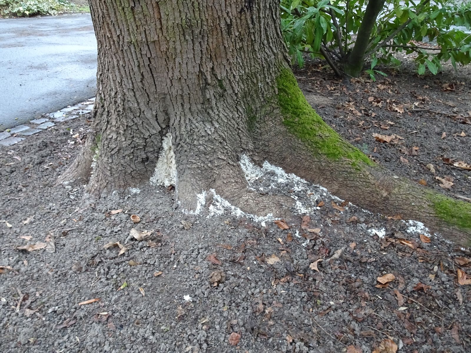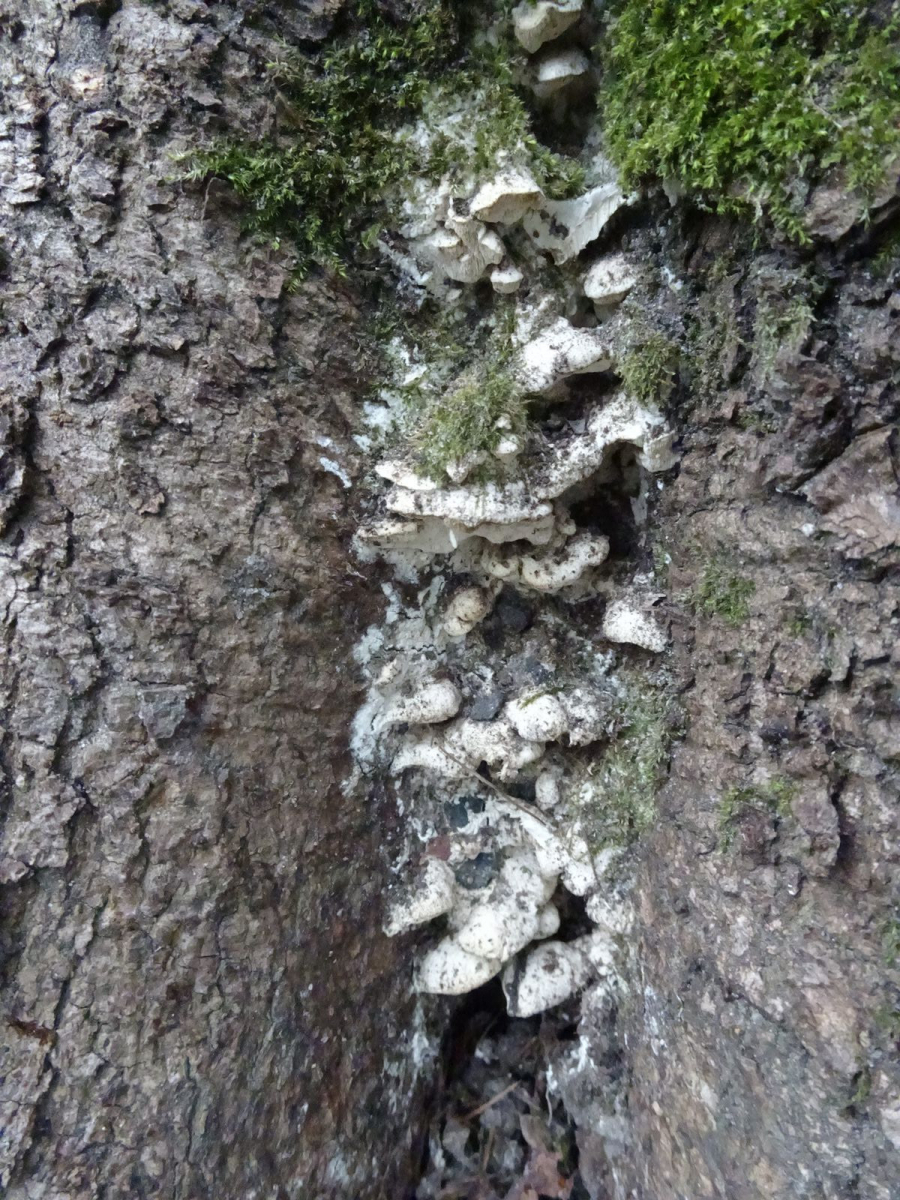 Anfang März bin ich am Stammfuß eines vital wirkenden Spitz-Ahorns erneut auf weiße Pilzfruchtkörper gestoßen, welche ich bislang nicht bestimmen konnte.