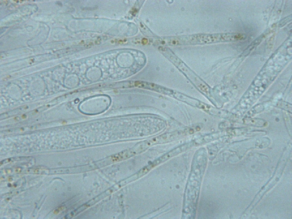 Asci ca. 50µ, Paraphysen um 60-70µ, Haare bis max. 100µ. Freie Sporen fand ich nicht, die in den Asci (8 Stück) länglich-oval waren schlecht zu erkennen, in etwa um 6µ lang.