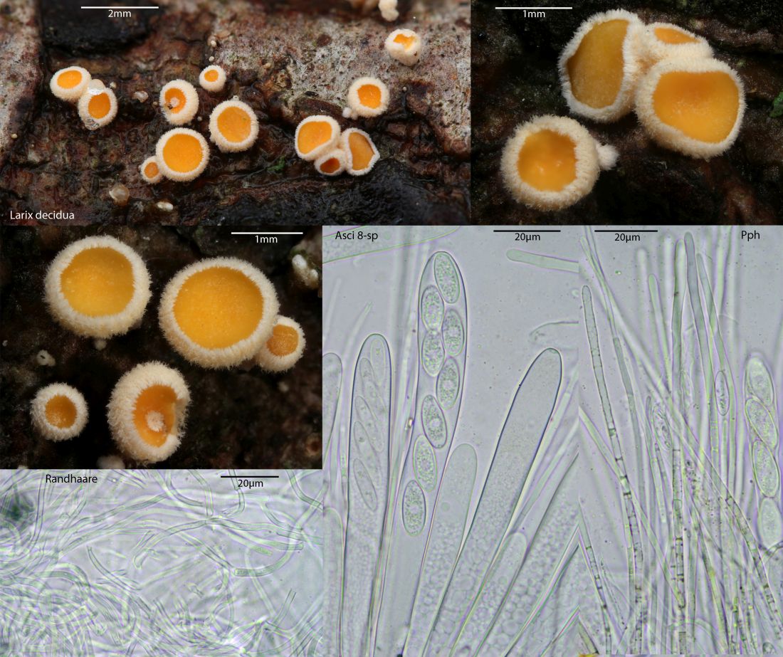 Los geht es mit dem häufigen, aber dennoch sehr schönen Standard Lachnellula occidentalis an Lärche. Die Art ist als leicht finden und hat ziemlich große, gut erkennbare Mikrostrukturen und ist damit für Anfänger im Bereich der Inoperculaten besonders gut geeignet: