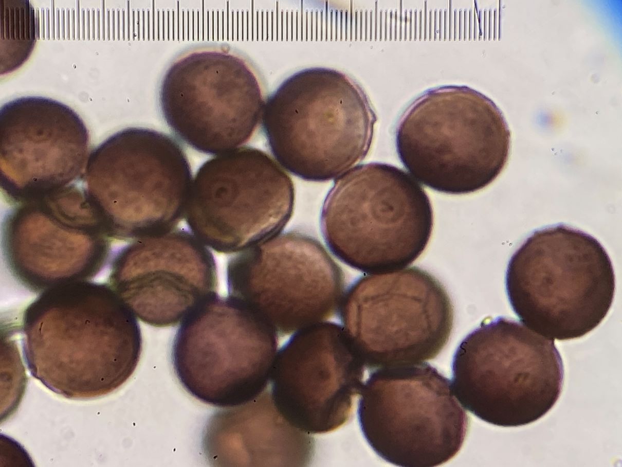 Das erkennt man gut an den Sporen die einseitig einen etwas helleren Keinporus haben, der oft durch eine Linie abgegrenzt ist.