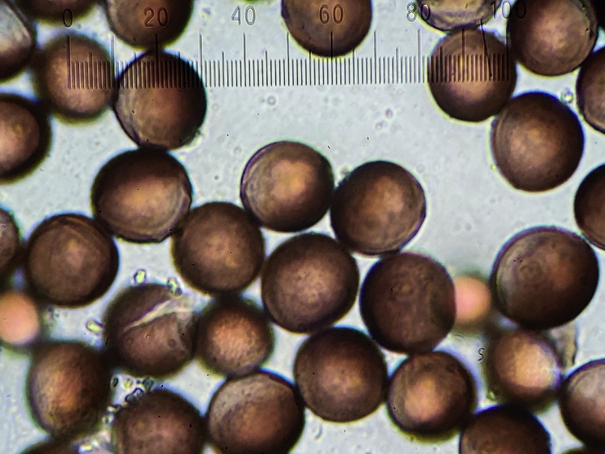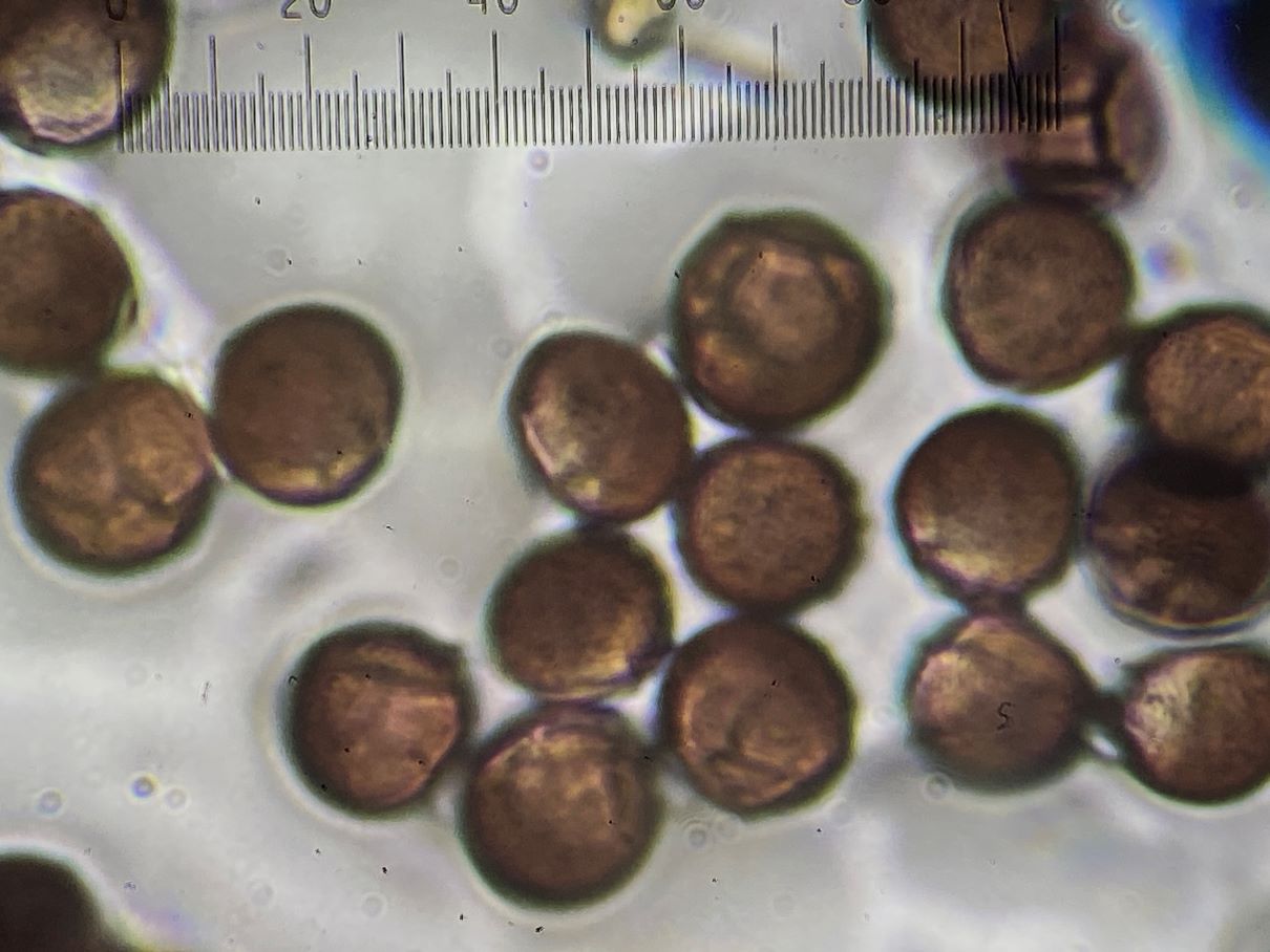Die von Dir vermutete Diderma chondriodema hat zwar ähnlich große Sporen, diese sind aber warzig mit dunkleren Warzengruppen und nie einseitig heller.