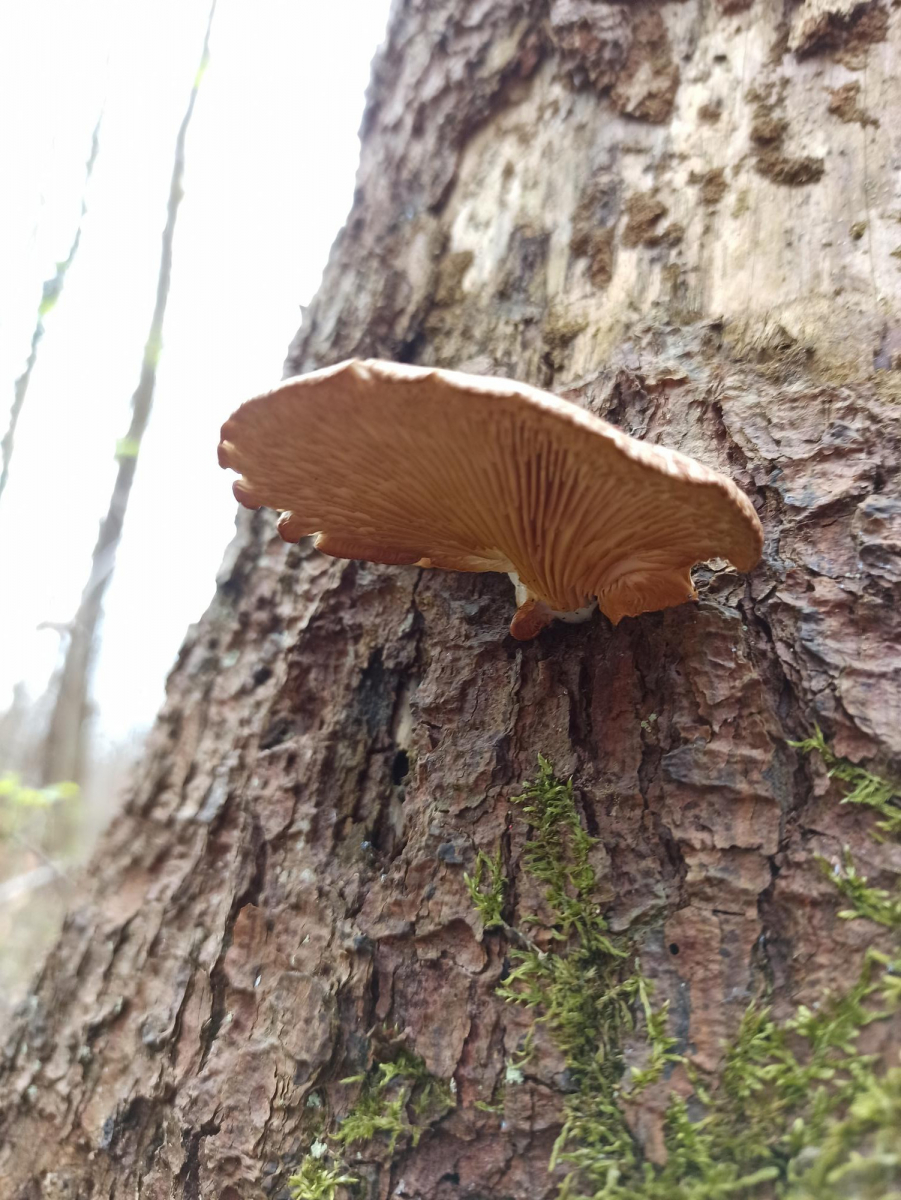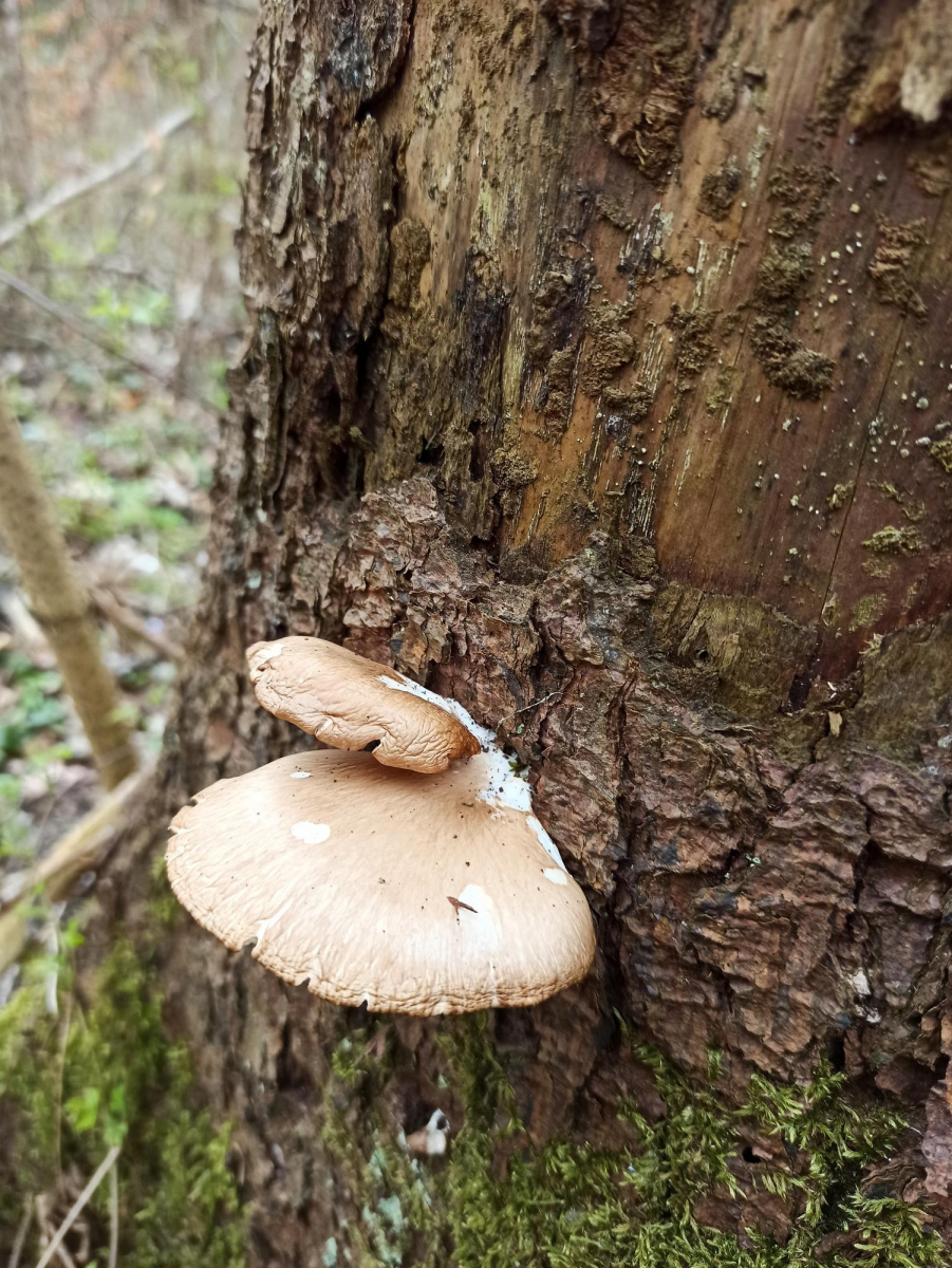 Der Fichtenstamm war vllt. 20cm dick, nicht mehr ganz gesund aber ich glaube auch nicht ganz abgestorben. Hauptsächlich Laubholz in dem Habitat, sonst habe ich in der Nähe keine Austern gefunden.