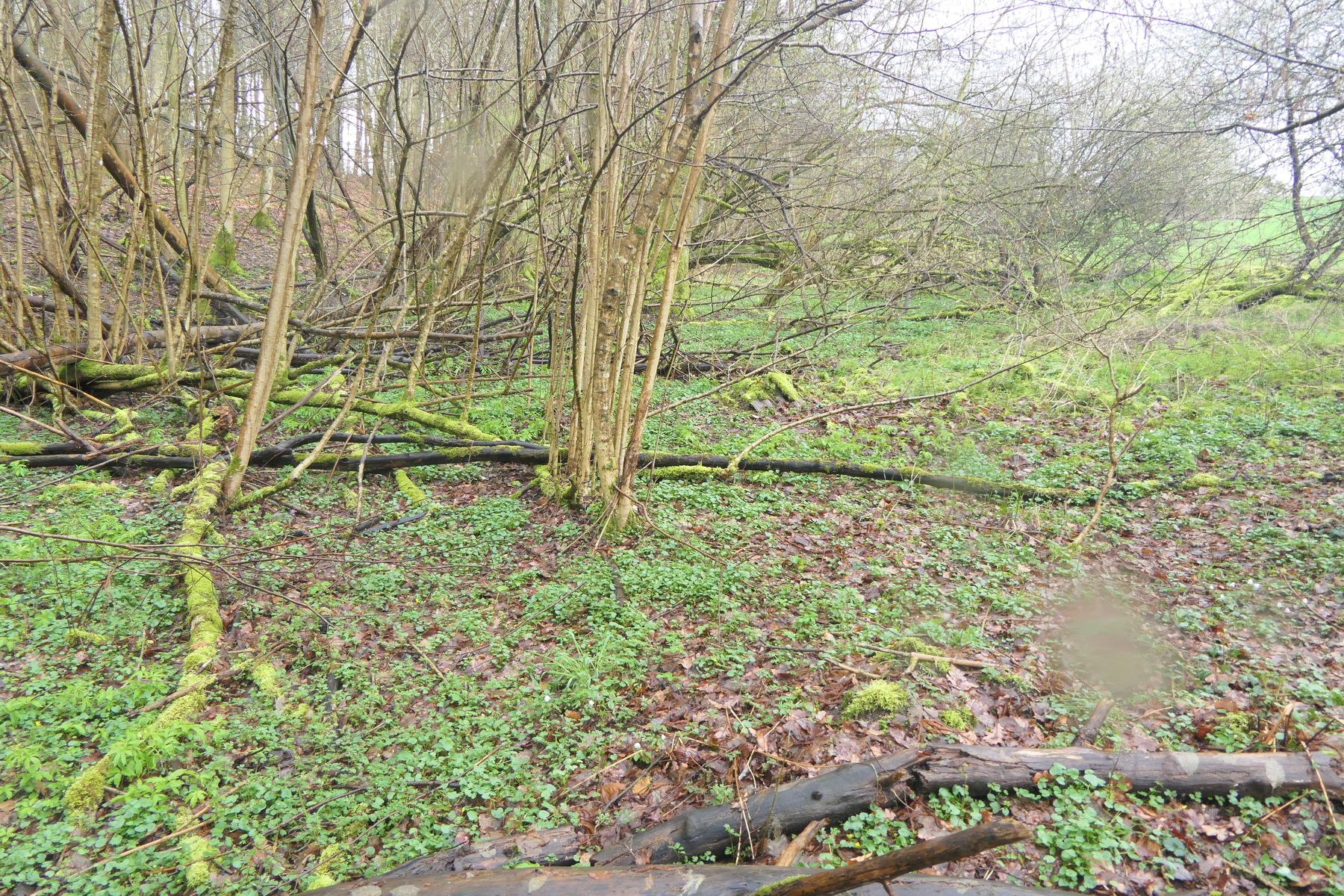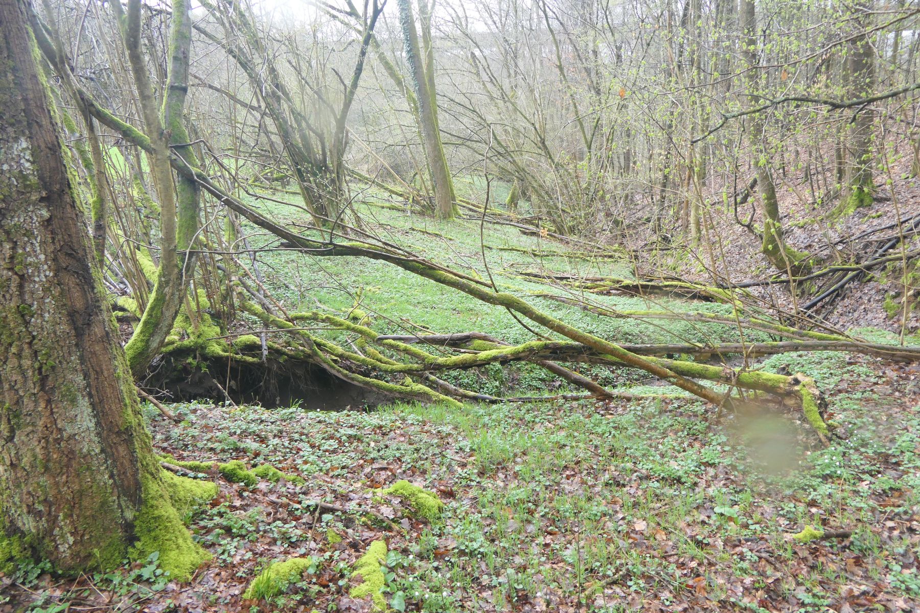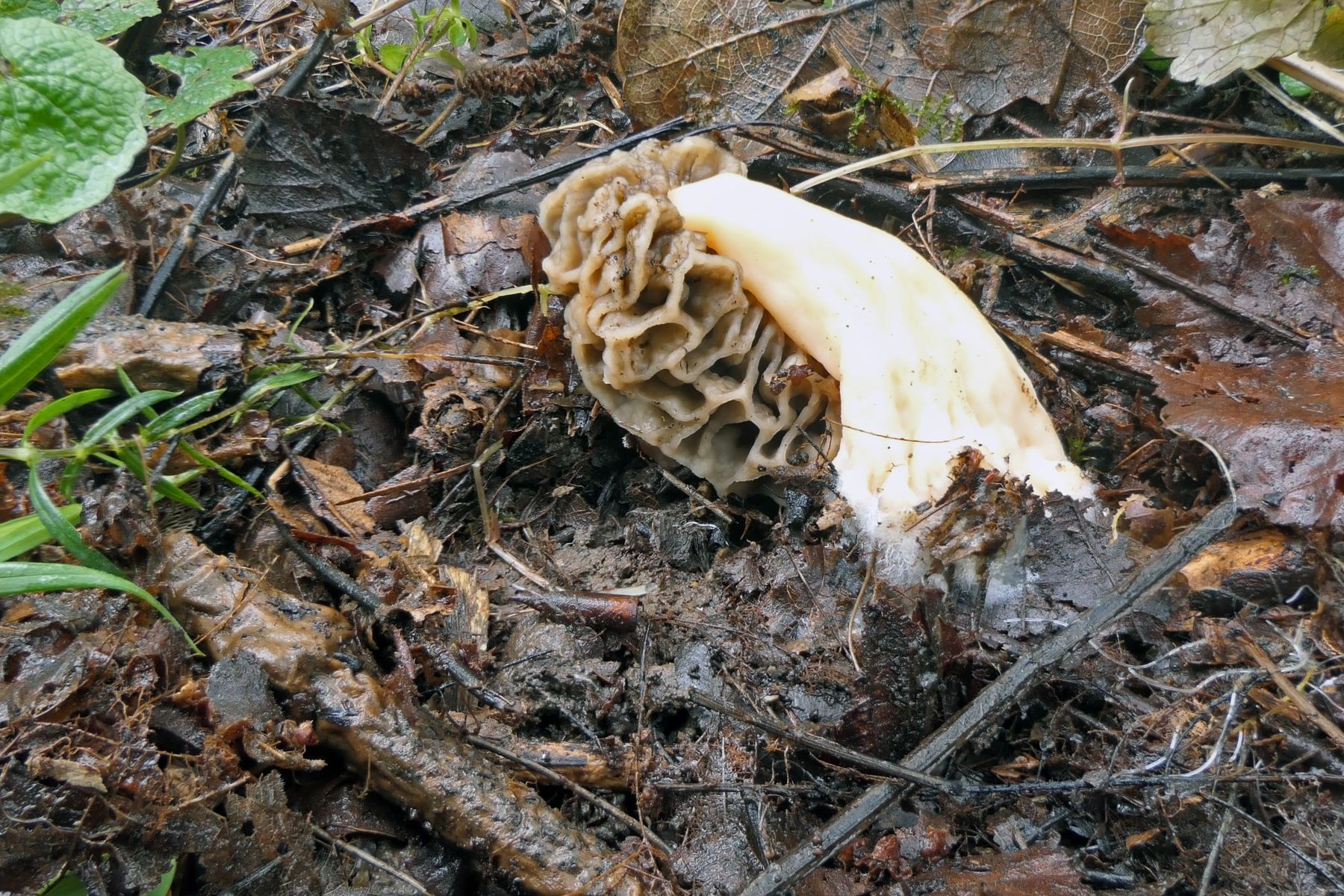 Gefreut habe ich mich auch über eine erste 03 Speisemorchel. So früh habe ich die hier noch nie gefunden. Seid 2017 besuche ich die Stellen jedes Jahr und die kamen bisher regelmäßig um den 15. April. Kündigt sich da vielleicht ein gutes Morcheljahr an? Ich drücke uns mal die Daumen. Leider (noch) nicht sehr fotogen, quält sich doch der kleine Fruchtkörper schräg durch die dicke Laubschicht: