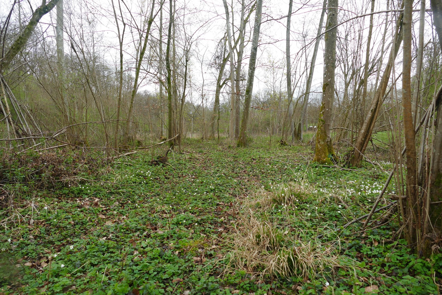 Bild 1 Suchgebiet neben Flüsschen mit vielen weißen Buschwindröschen, Scharbockskraut etc.
