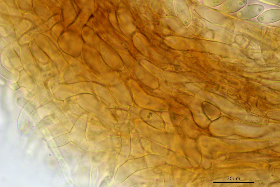 ich habe gestern an meinem Manuskript gearbeitet und beim Sichten der Fotos gemerkt, dass es vermutlich nicht nur dieses nicht leicht zu sehende Merkmal der Kernzahl in den Sporen gibt, um die beiden Arten zu unterscheiden, sondern auch ein Excipulummerkmal, und zwar weniger an der Flanke sondern besser am Rand. Demnach hat S. binucleata ähnlich wie S. sclerotiorum eine Art von globulosa-angularis, also rundliche Zellen die eine ziemlich vertikale Orientierung zu außen haben (oberes Bild, phot. Jean-Claude Chasle). S. tuberosa hingegen hat hier eine ziemlich parallel zu außen verlaufende prismatica-porrecta, also langgestreckte Zellen (unteres Bild,von mir aus Luxemburg). Dies war der Grund, weshalb Kohn die Gattung Dumontinia aufstellte. Kohn sagt allerdings, dass auch an der Flanke eine porrecta, was nicht ganz stimmt, da schaut es je nach Fund auch prismatisch-globos aus. Also falls jemand einen Beleg gemacht hat oder einen Neufund tätigt, bitte einen Medianschnitt nahe der Margo versuchen.