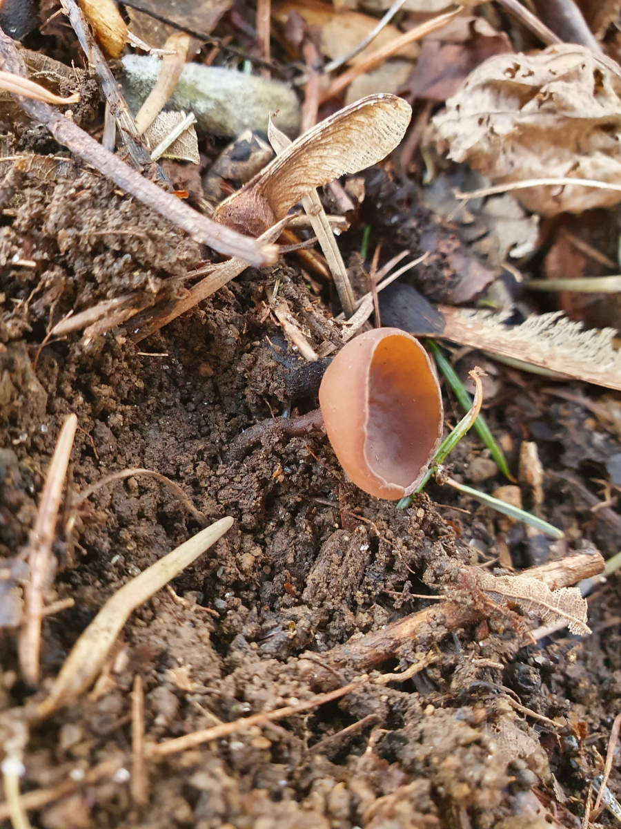 Zwischen einigen Buschwindröschen fand ich an einer kahleren Stelle braune, langstielige Becher - Heureka! ![]()