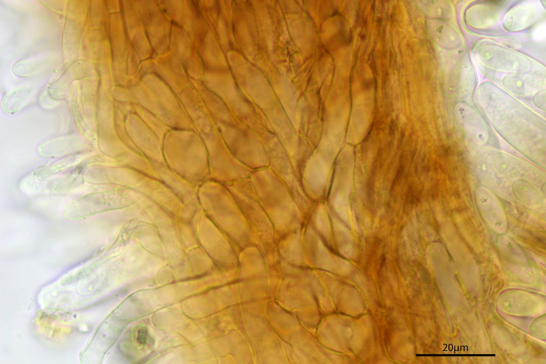 ich habe gestern an meinem Manuskript gearbeitet und beim Sichten der Fotos gemerkt, dass es vermutlich nicht nur dieses nicht leicht zu sehende Merkmal der Kernzahl in den Sporen gibt, um die beiden Arten zu unterscheiden, sondern auch ein Excipulummerkmal, und zwar weniger an der Flanke sondern besser am Rand. Demnach hat S. binucleata ähnlich wie S. sclerotiorum eine Art von globulosa-angularis, also rundliche Zellen die eine ziemlich vertikale Orientierung zu außen haben (oberes Bild, phot. Jean-Claude Chasle). S. tuberosa hingegen hat hier eine ziemlich parallel zu außen verlaufende prismatica-porrecta, also langgestreckte Zellen (unteres Bild,von mir aus Luxemburg). Dies war der Grund, weshalb Kohn die Gattung Dumontinia aufstellte. Kohn sagt allerdings, dass auch an der Flanke eine porrecta, was nicht ganz stimmt, da schaut es je nach Fund auch prismatisch-globos aus. Also falls jemand einen Beleg gemacht hat oder einen Neufund tätigt, bitte einen Medianschnitt nahe der Margo versuchen.