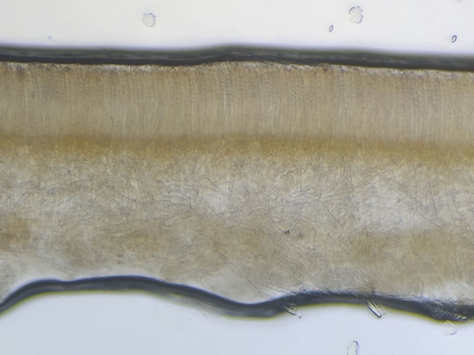 Bild 10 Dünnschnitt durch Hymenium in (wenig) Wasser, ungequetscht / Becherdicke 500-550µm / Hymenium hellbraun, 150 mm dick