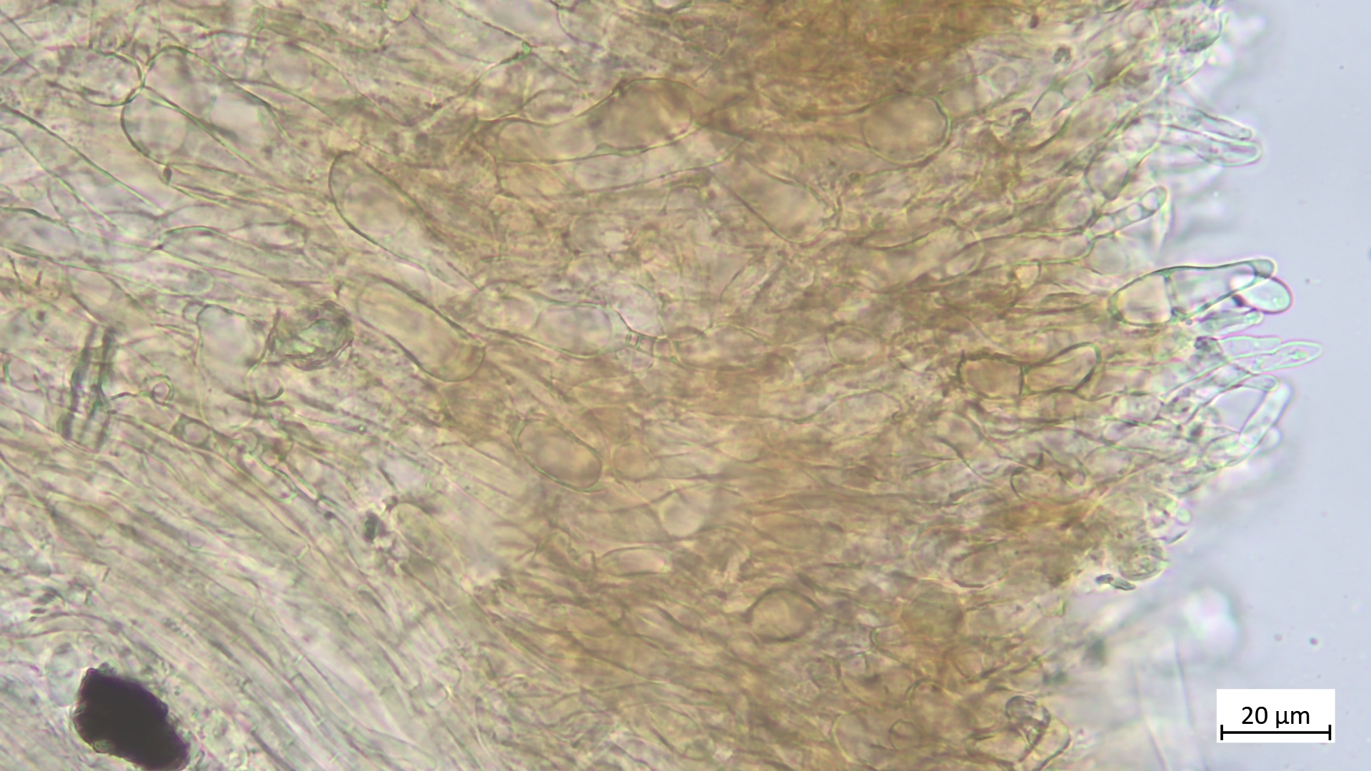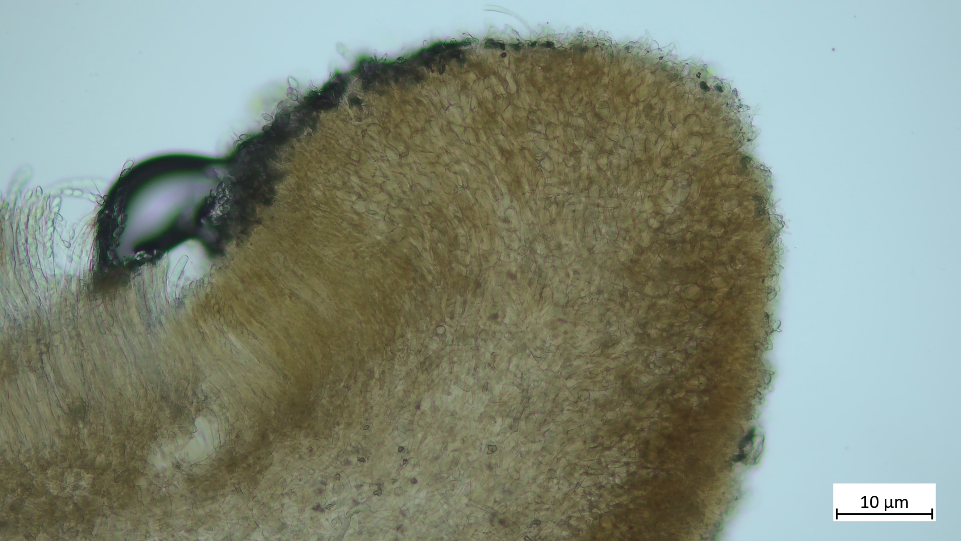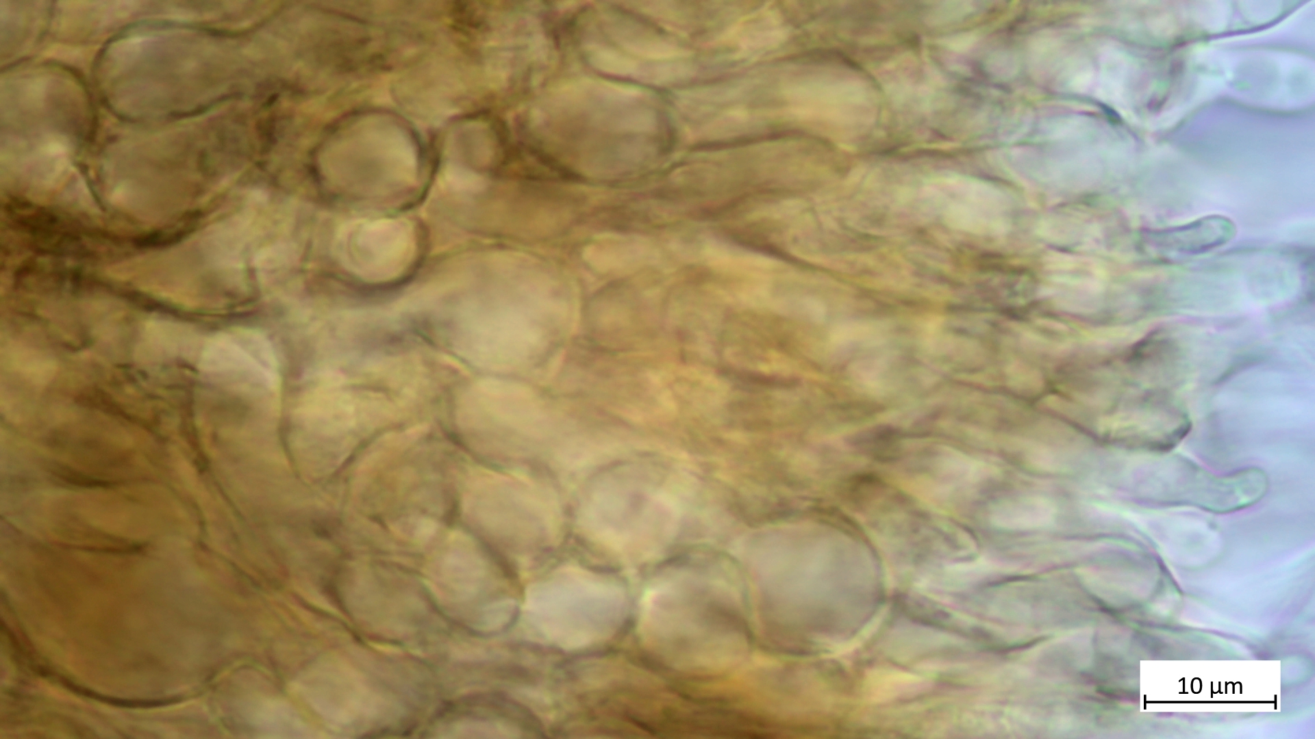 Ich muss noch ergänzen, dass alle meine gezeigten Schnitte die Flanken des Fruchtkörpers zeigen, also die Unterseite nahe beim Rand. ich habe auch Margoschnitte gemacht, habe aber gemerkt, dass die Flanke doch nicht so weniger geeignet scheint als der Rand, weil ich auch dort die textur ziemlich variabel gefunden habe. Und das mit den Sklerotien muss ich doch wieder relativieren: Reichlich Glykogen fand sich nun auch bei S. tuberosa, und das Schwammige des Gewebes kommt auch dort vor, wie außerdem die Dickwandigkeit der Hyphen auch bei S. binucleata zu finden ist. Also eher nur wenig Unterschied.