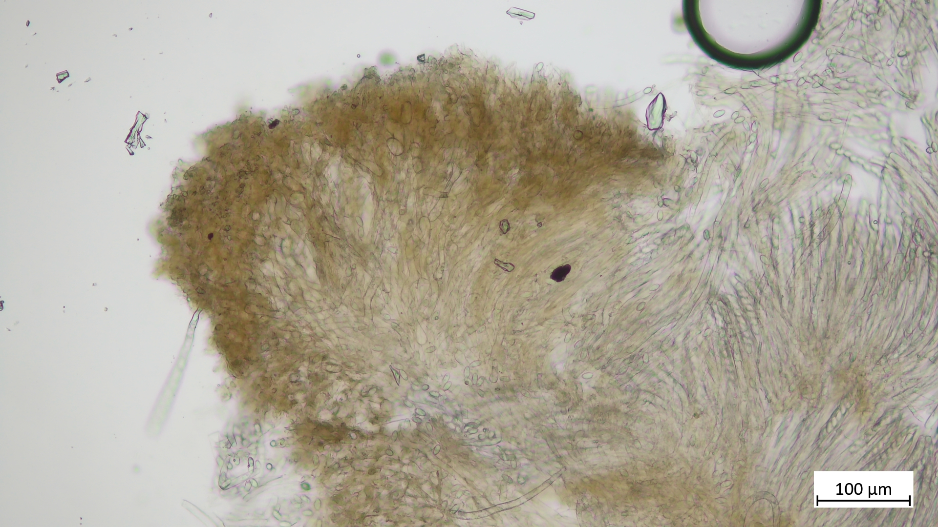 Vom Sklerotium habe ich wie gesagt keine guten Schnitte hinbekommen. Man sieht die lockere Textur und die dextrinoiden Hypheninhalte.