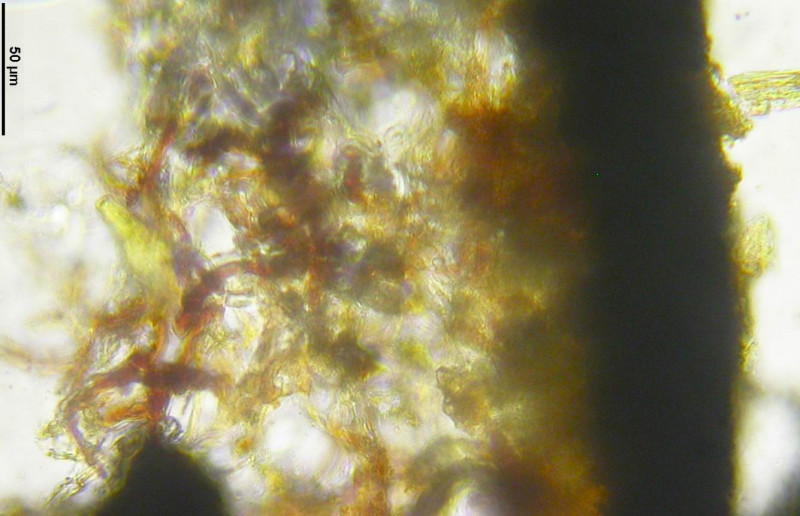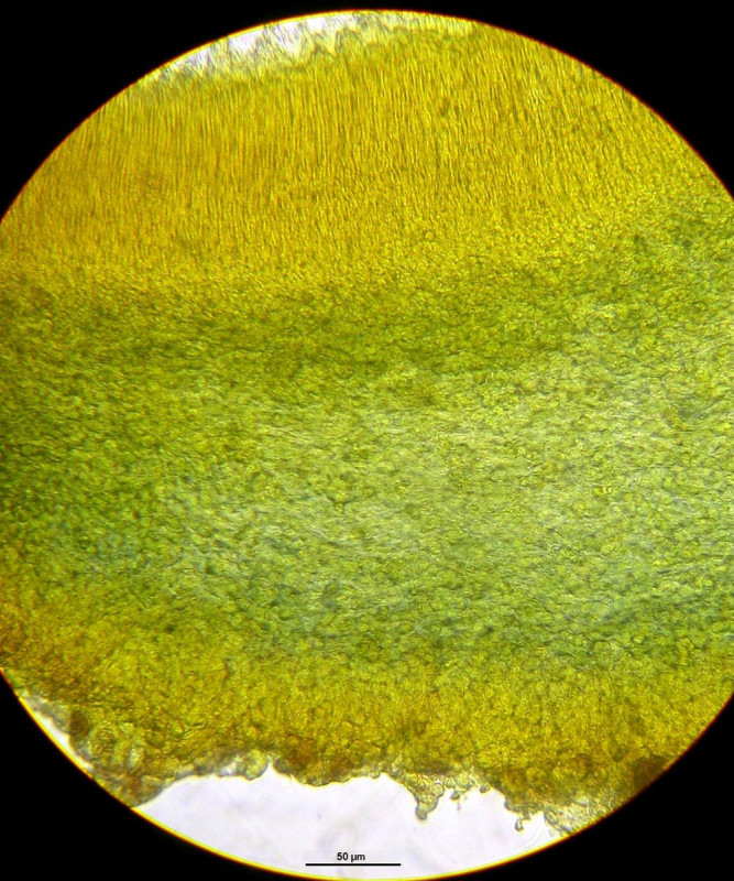Gut sieht man hier die ziemlich senkrechte Orientierung des Ectalexcipulums und seine scharfe Abgrenzung gegen die Medulla. So schön eindeutig waren die Resultate bei anderen Funden leider nicht.