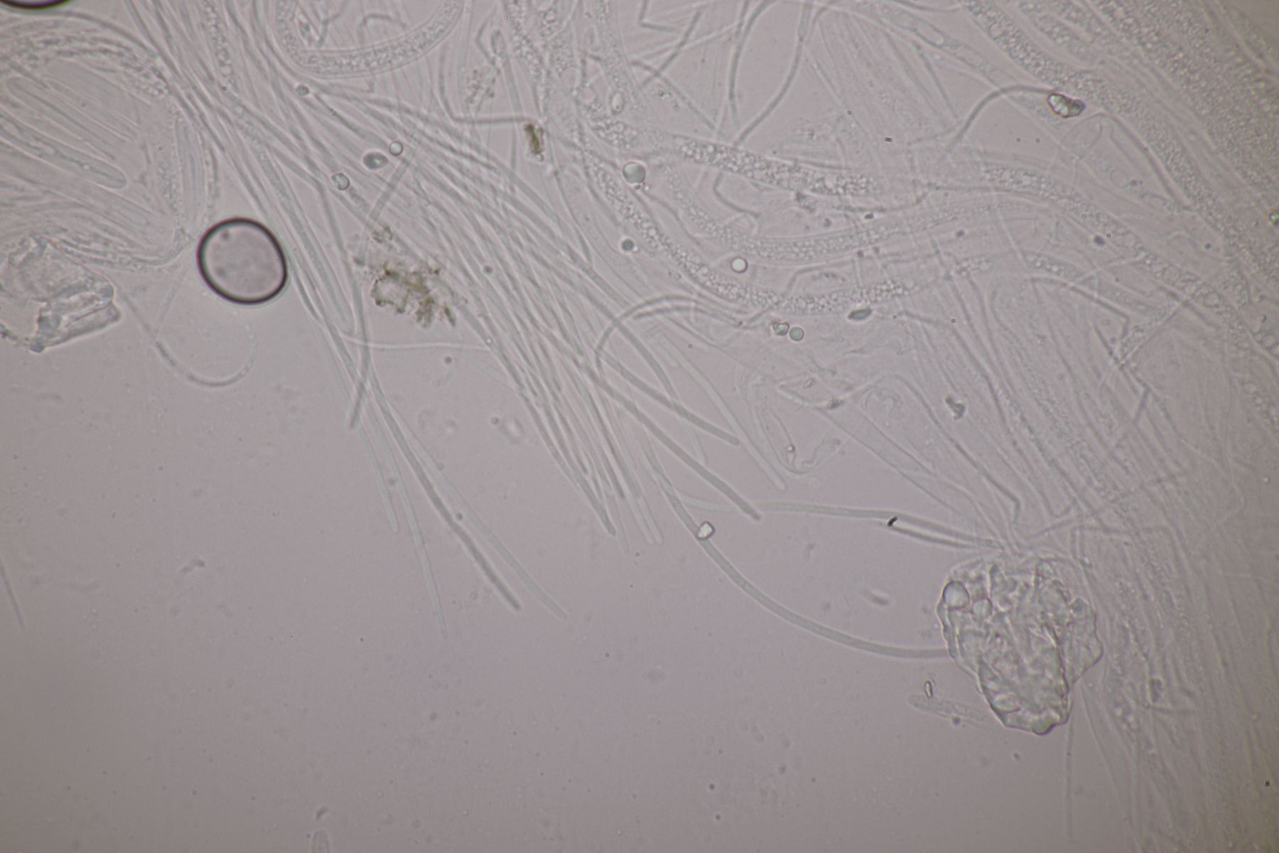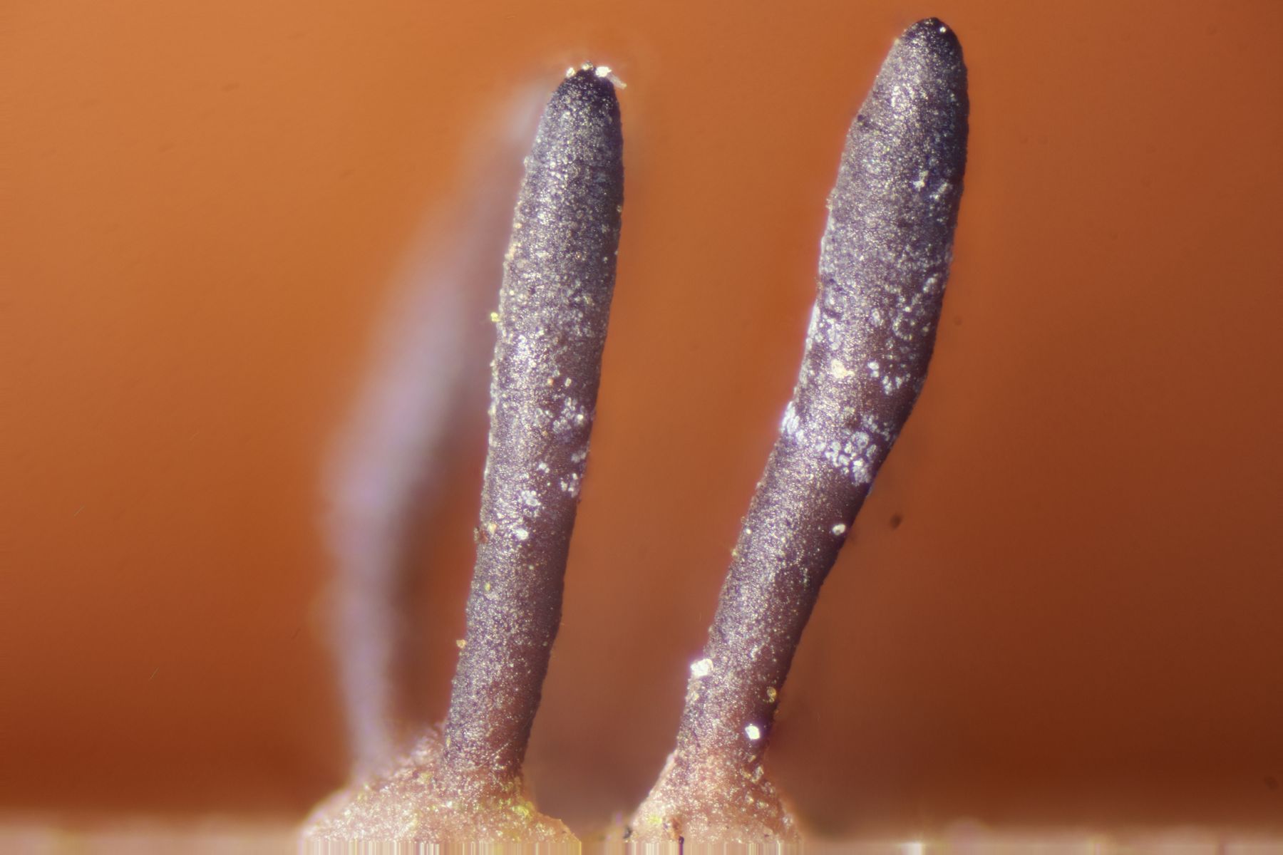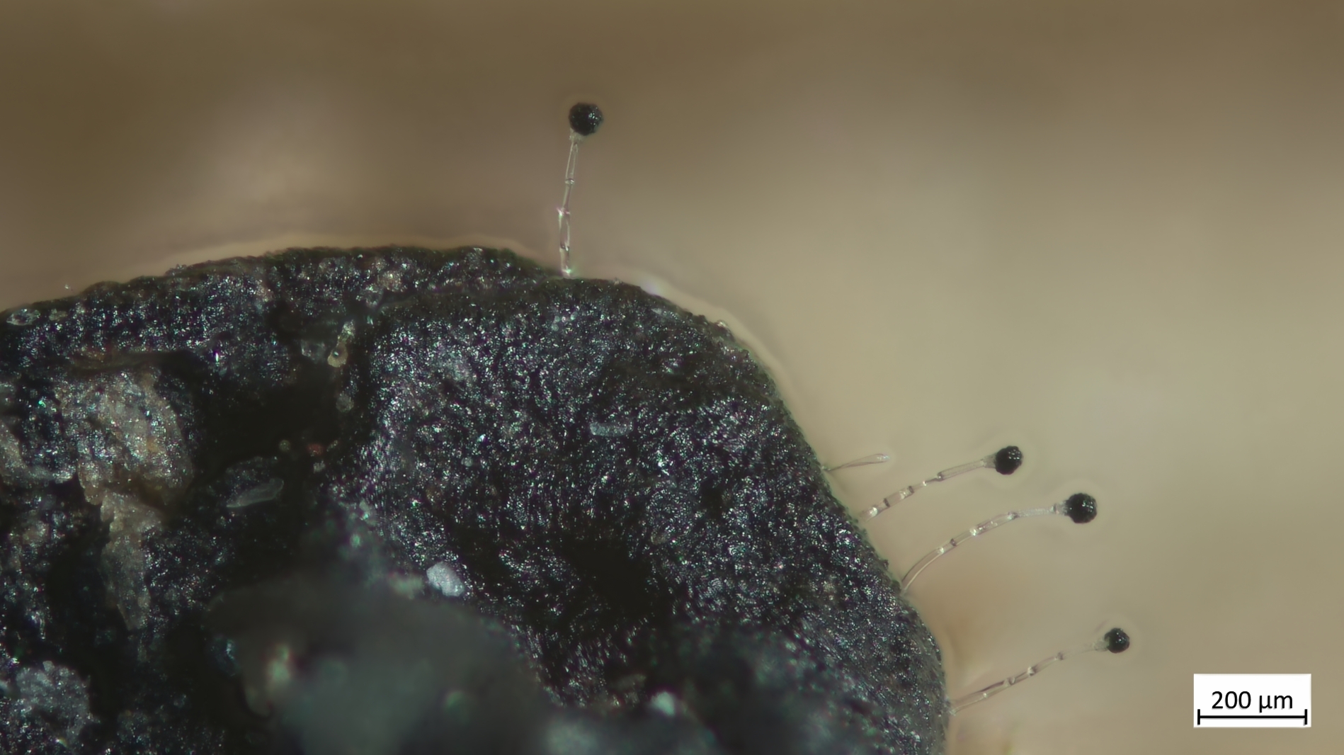 Die Herstellung eines Präparates war eine ziemlich schwierige Angelegenheit, die Spitze der Pinzette war etwa dreimal so groß wie der Pilz.