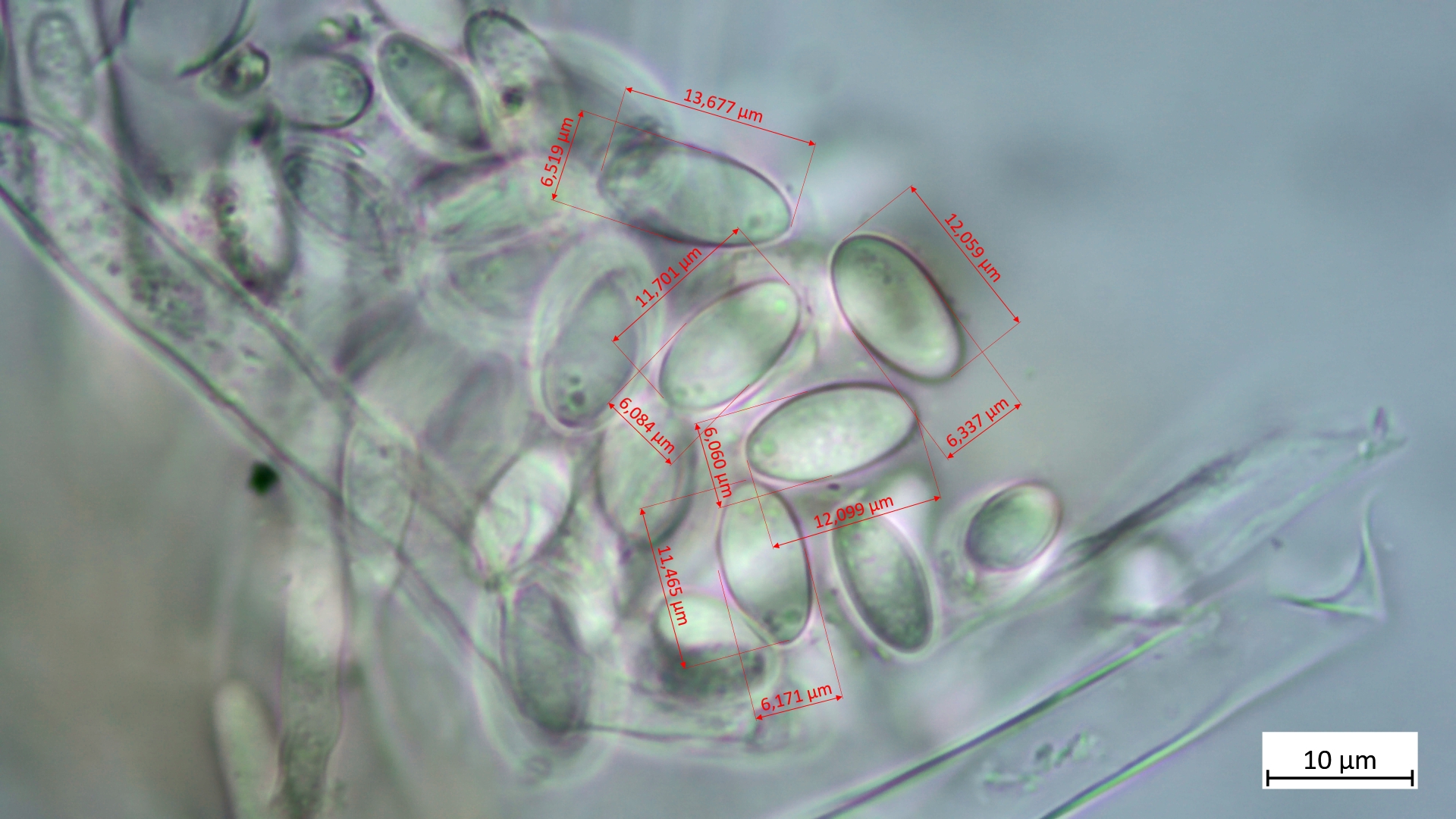 Dann doch in Wasser, Sporen ellipsoid: 11,5-13,7 µm (av. 12,2 µm, SD 0,8 µm) x 6,1-6,5 µm (av. 6,2 µm, SD 0,2 µm); Q = 1,9-2,1 (av. 2,0, SD 0,1)(n = 5)