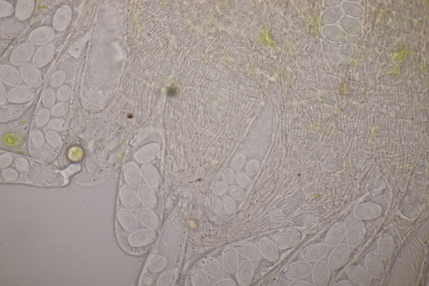 2. Diese kleinen, gelben Kerlchen halte ich für einen Coprotus. Asci reagieren nicht mit Lugol, es sind keine Haare oder dergleichen vorhanden. Sporen messen 14.1-15.5 µm x 8.9-10.2 µm, Paraphysen sind ohne gelbe Tröpfchen, auch wenn die Fruchtkörper selber gelblich aussehen. Damit komme ich dann leider auch weder mit Doveri noch mit Kusan et al. zu einem Ergebnis.