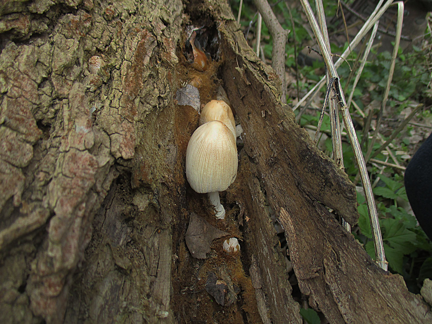 Auf einem morschen Baumstamm hatten sich einige Haustintlinge (Coprinellus domesticus)Bescheidete Tintlinge (Coprinellus ellisii) angesiedelt. Das hat Stefan herausgefunden.
