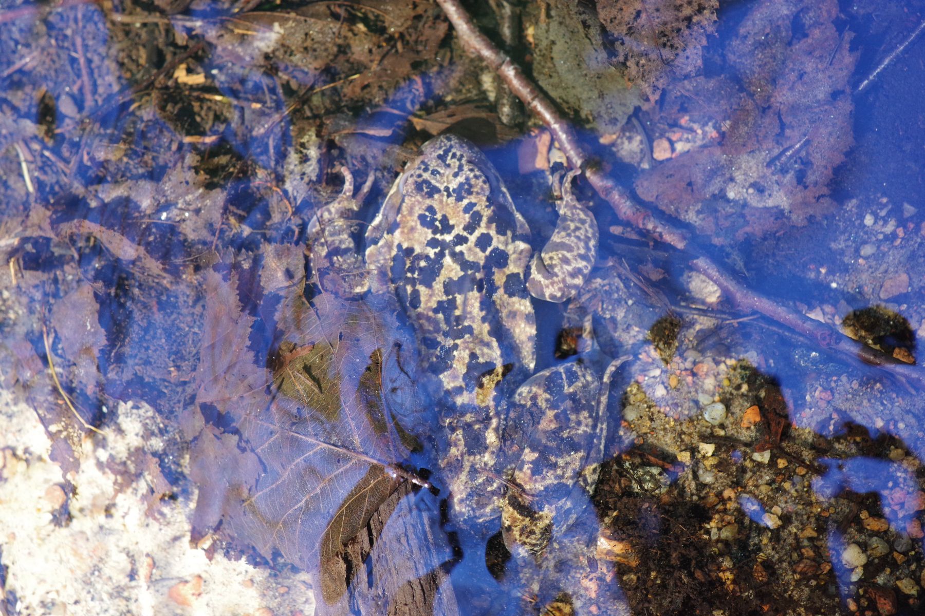 da bin ich mir nicht sicher - vielleicht eine Knoblauchkröte, nicht mehr im Quellbereich, sondern 1 km weiter, nach Passieren eines Niedermoores