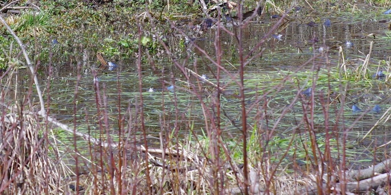 in Vergrößerung jede Menge hochzeitender Moorfrösche im blauen Frack
