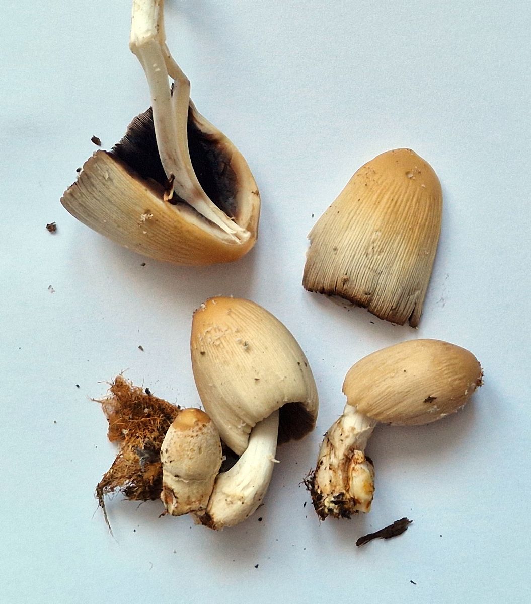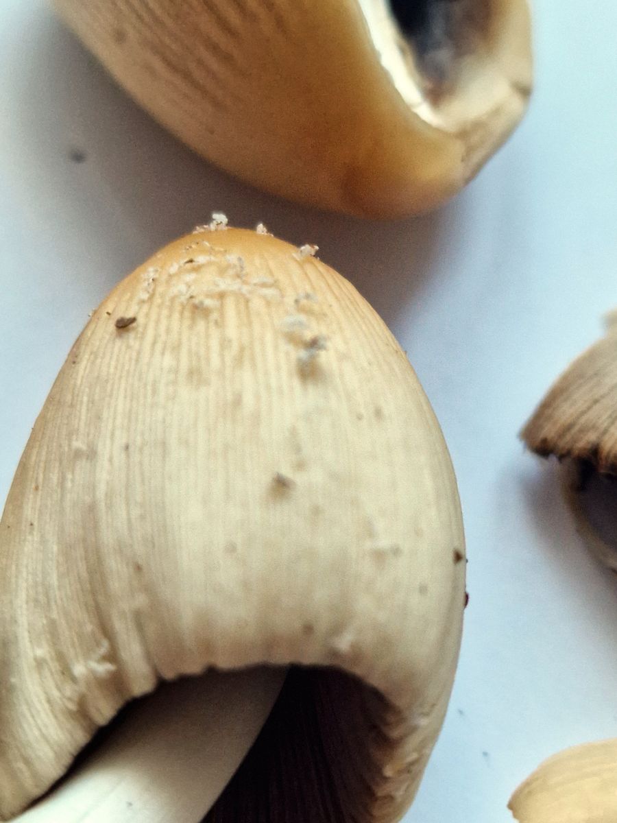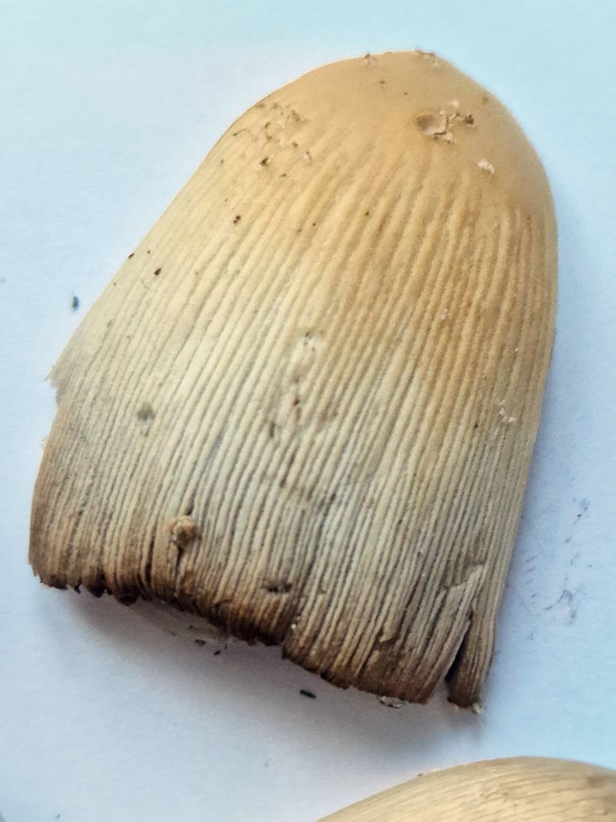 Hüte eiförmig bis 3,5 cm im Durchmesser mit hellem weisslichen Velum auf gelbbräunlichen Grund, nicht ganz nach oben tiefer gerillt