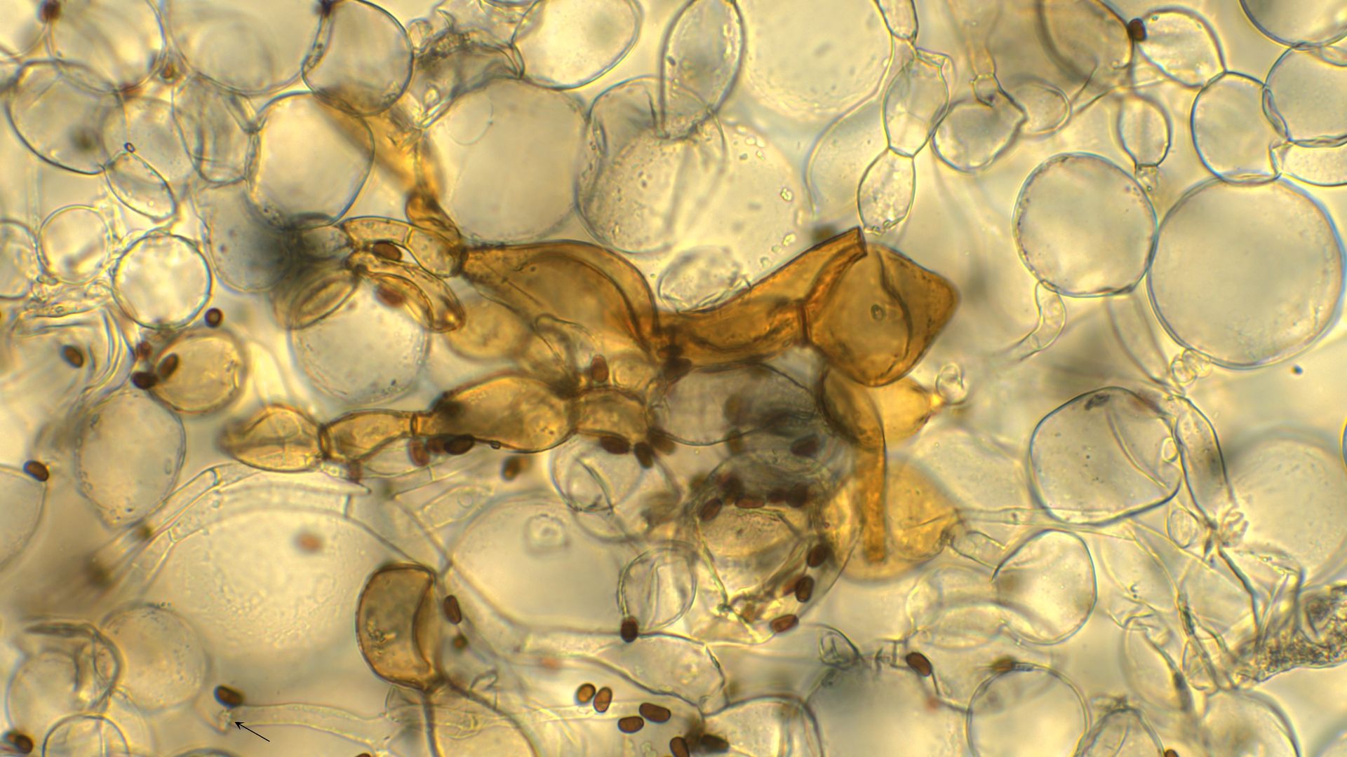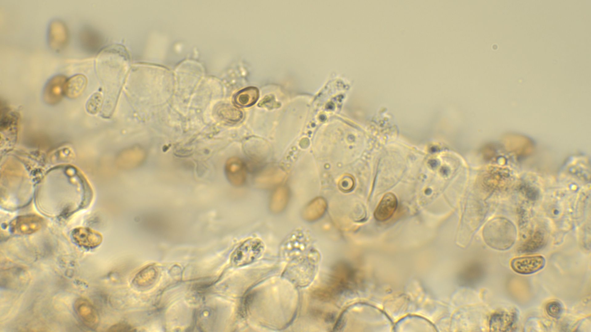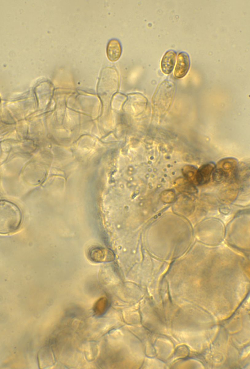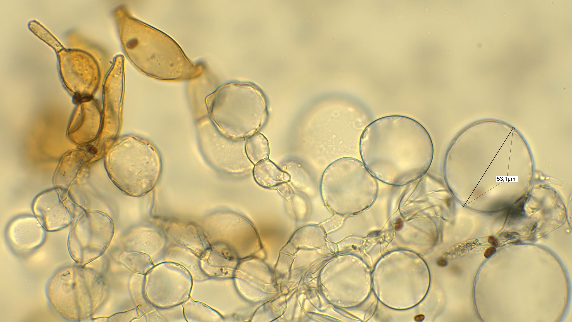 Hutvelum rundliche und gestreckte, hyaline Zellen, wie eine Kette aneinander gereiht. Die gestreckten in bräunlichem Ton.