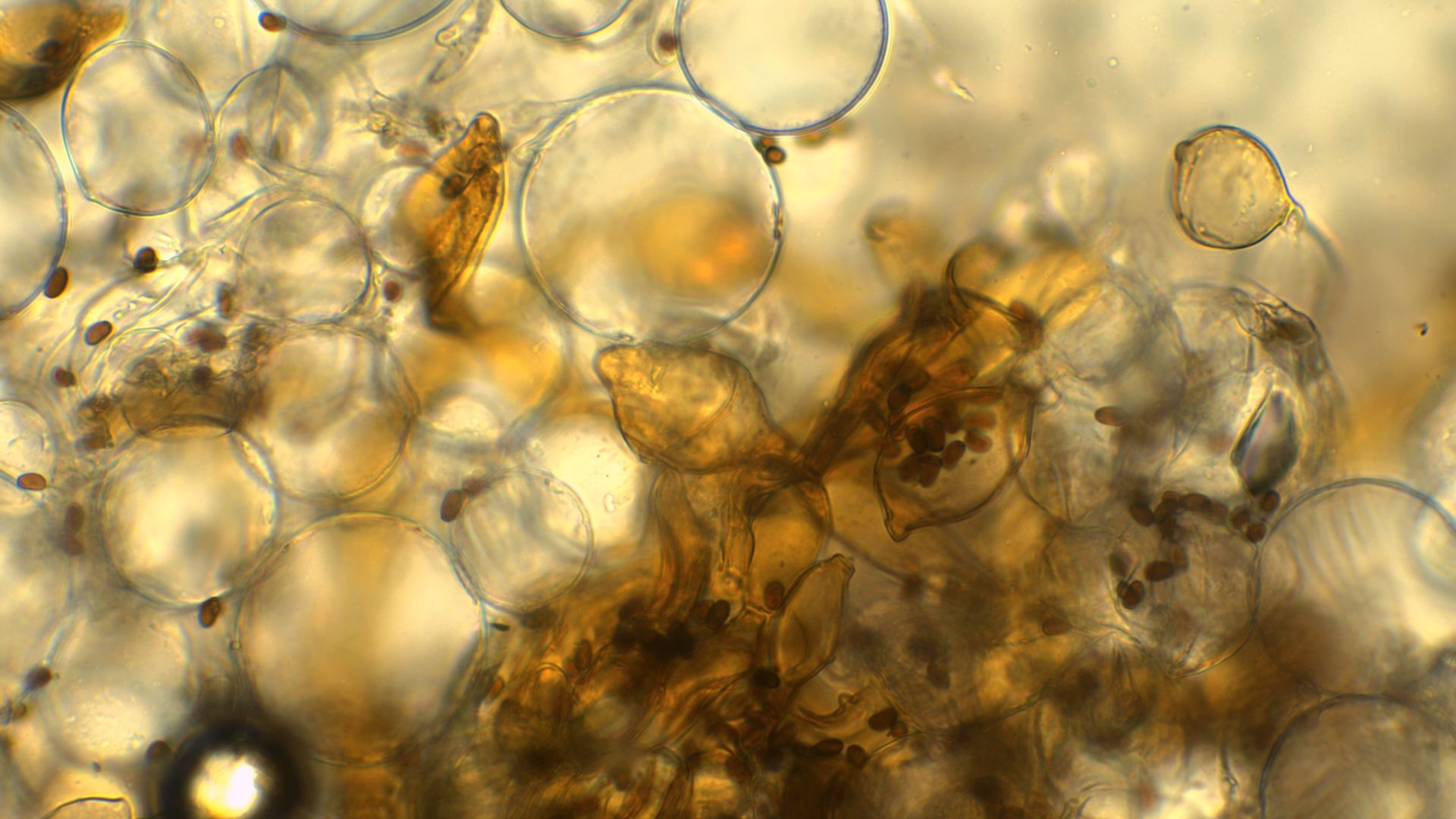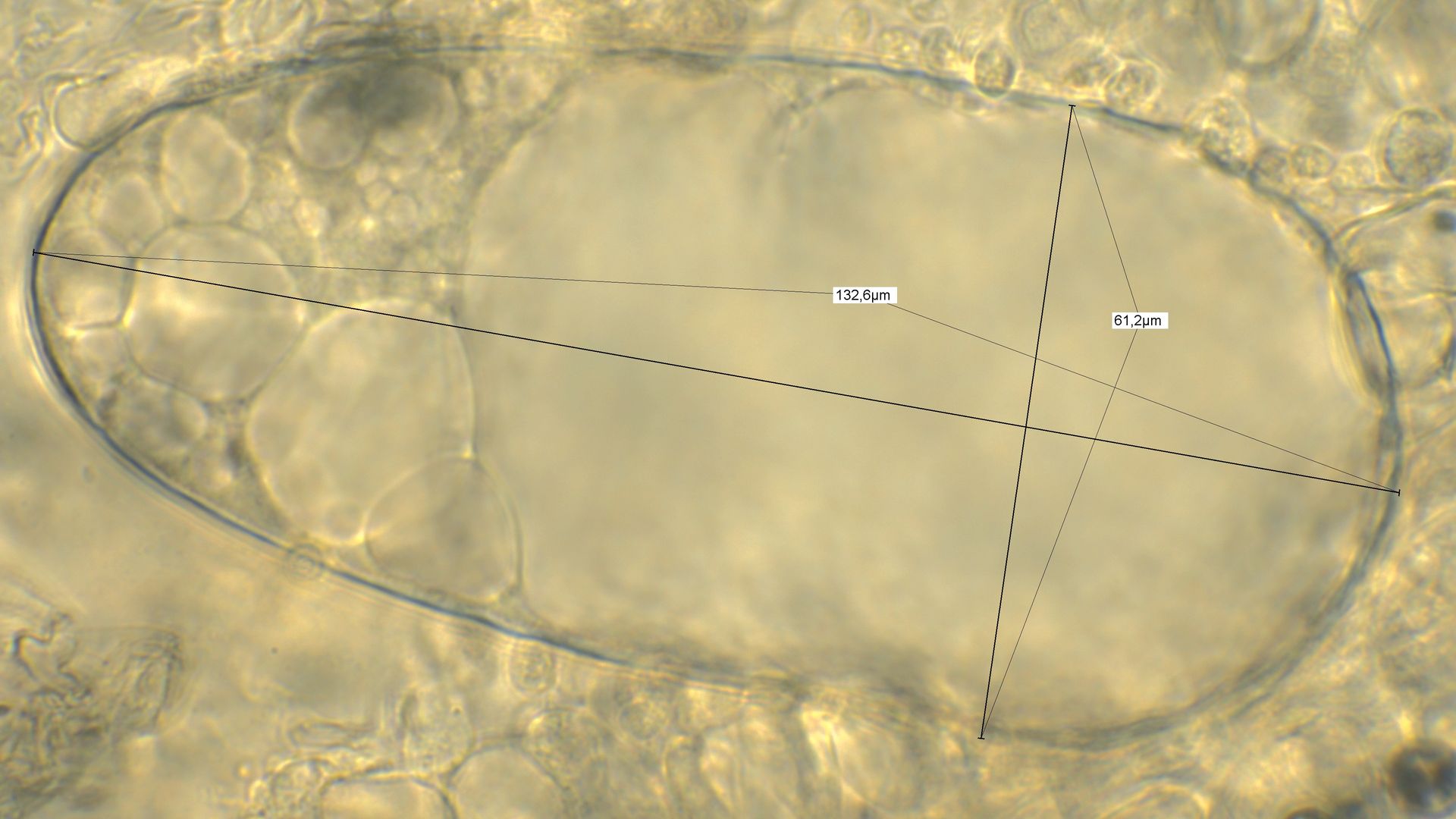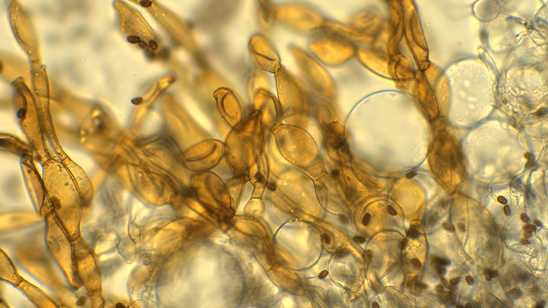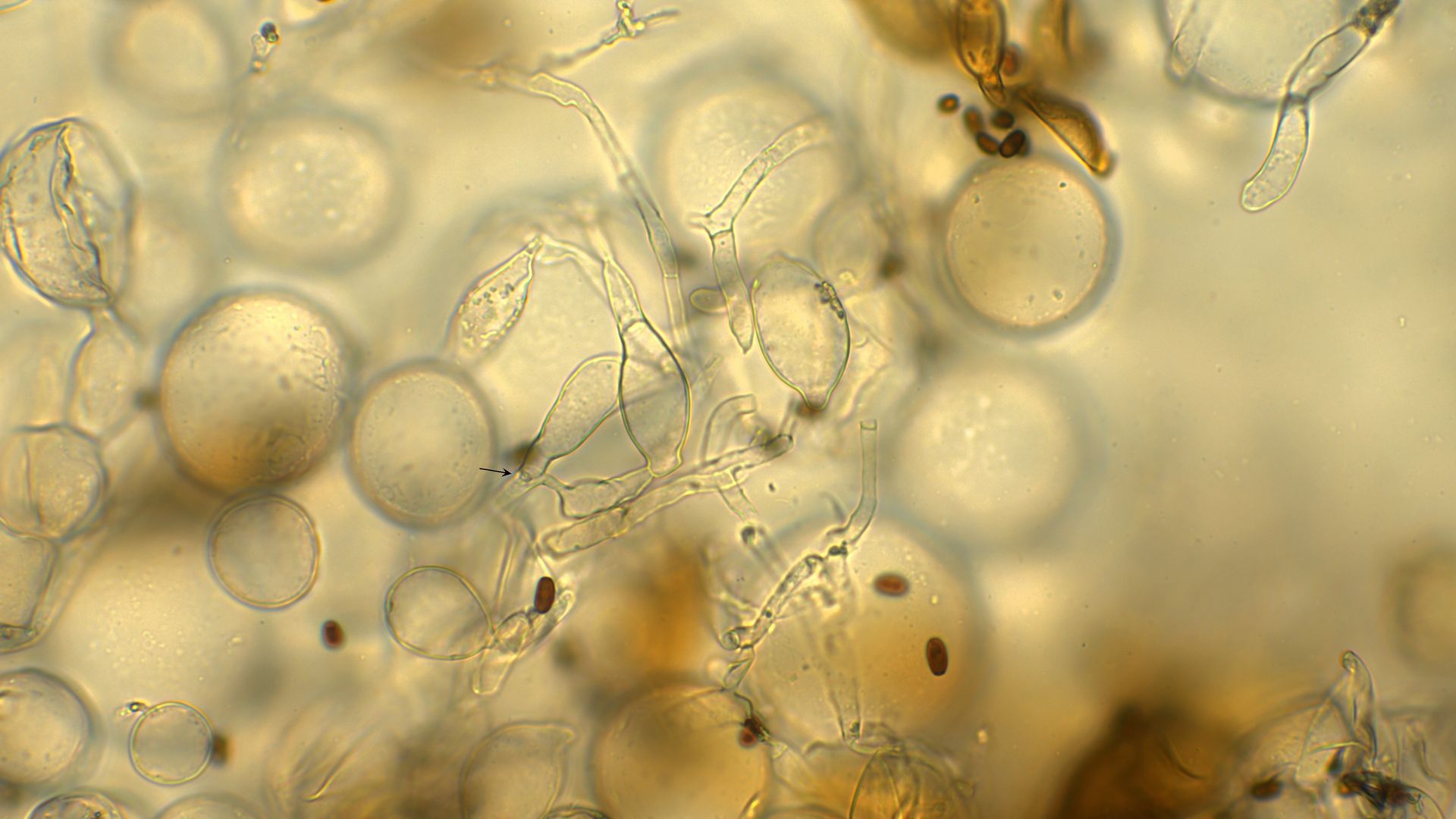 Hutvelum rundliche und gestreckte, hyaline Zellen, wie eine Kette aneinander gereiht. Die gestreckten in bräunlichem Ton.