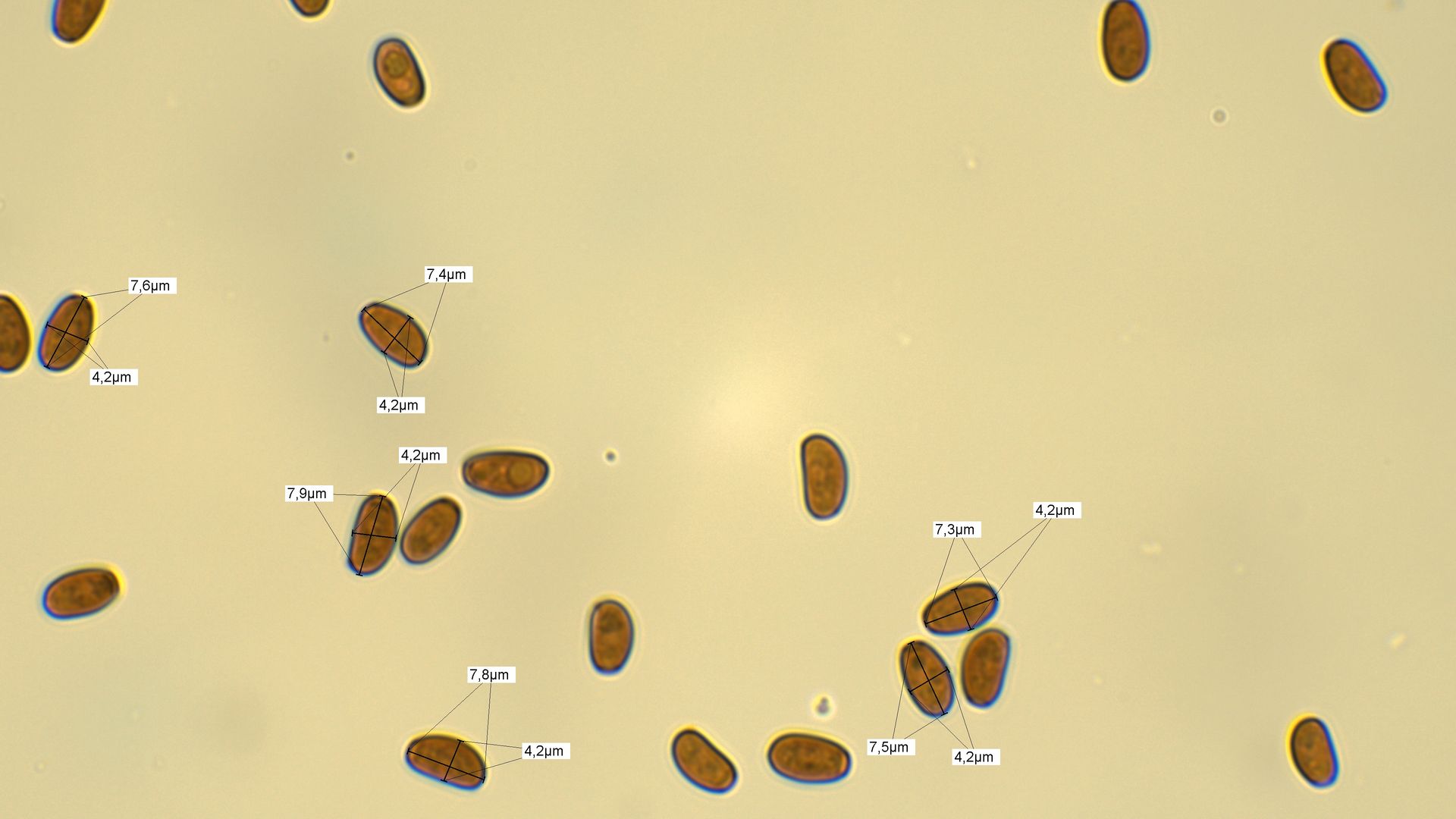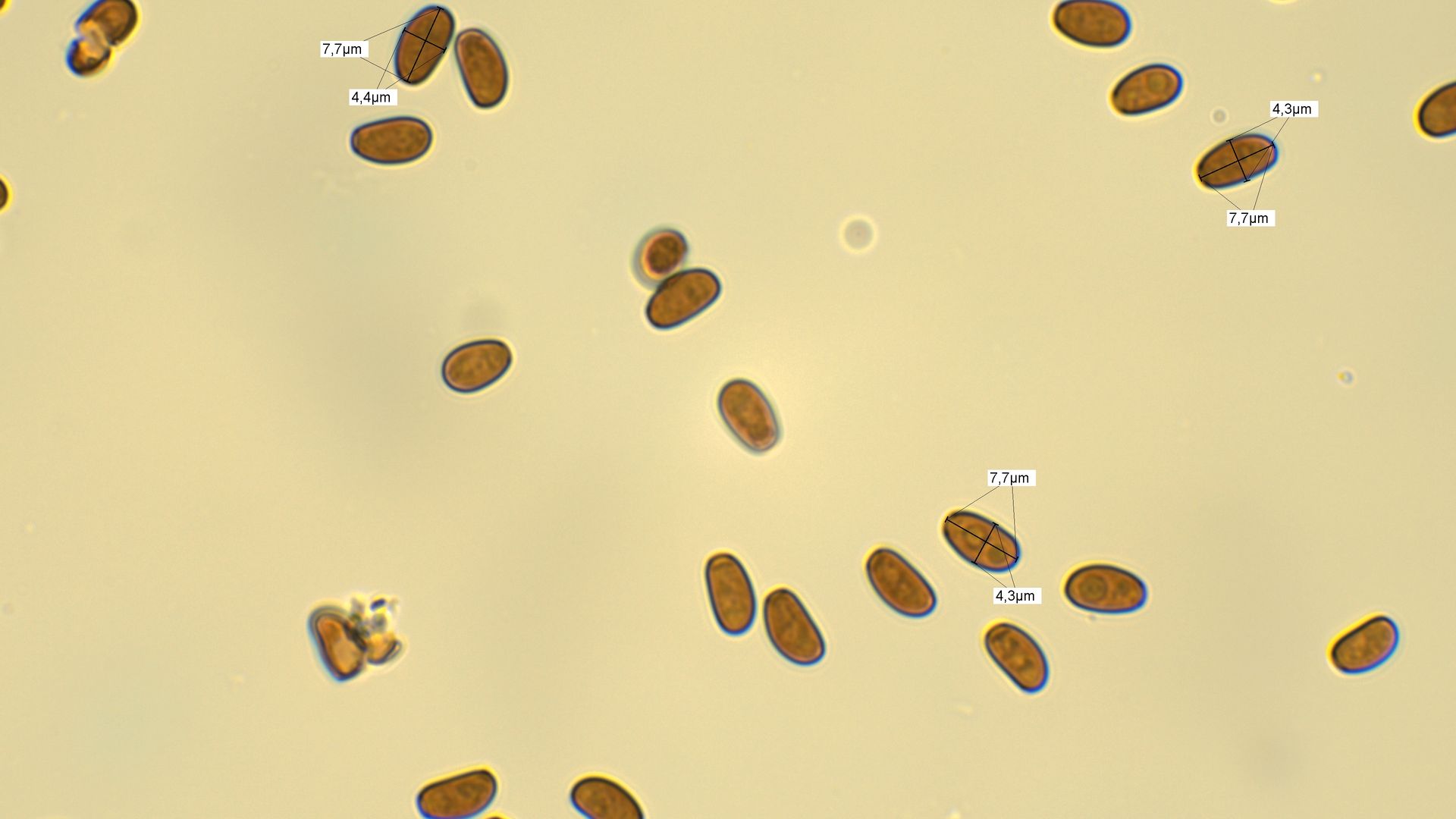 Sporen: eliptisch bis bohnenförmig, rot-bräunlich, mit zentralen Keimporus