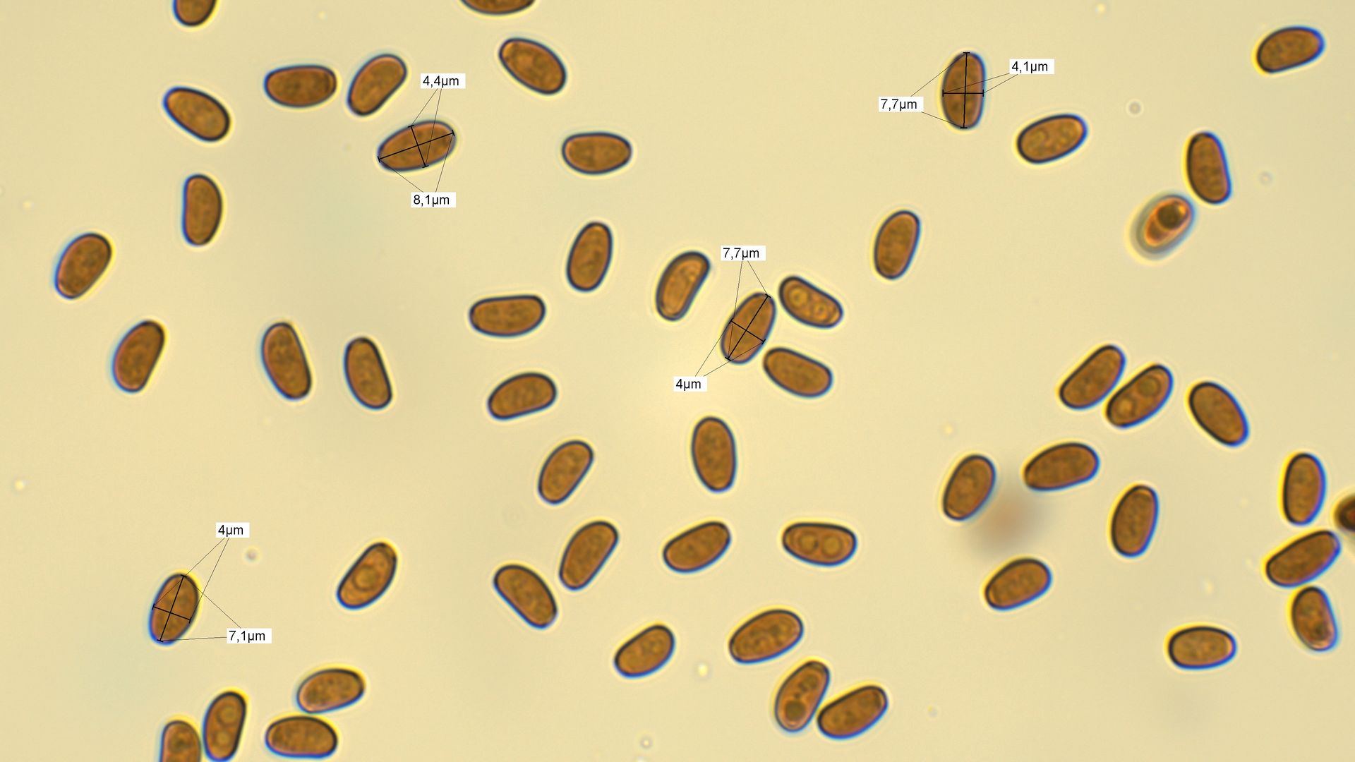Sporen: eliptisch bis bohnenförmig, rot-bräunlich, mit zentralen Keimporus