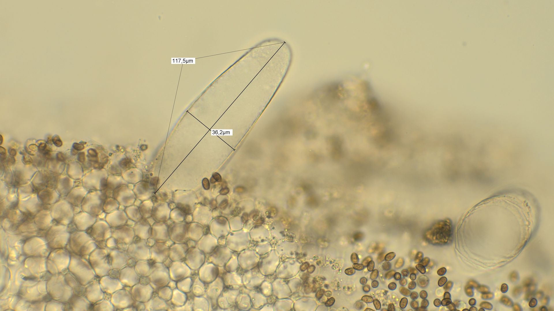 Hutvelum rundliche und gestreckte, hyaline Zellen, wie eine Kette aneinander gereiht. Die gestreckten in bräunlichem Ton.