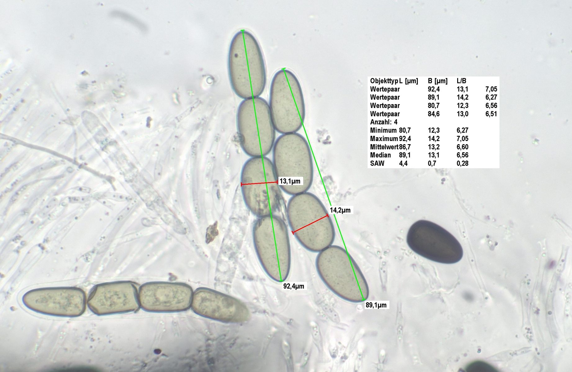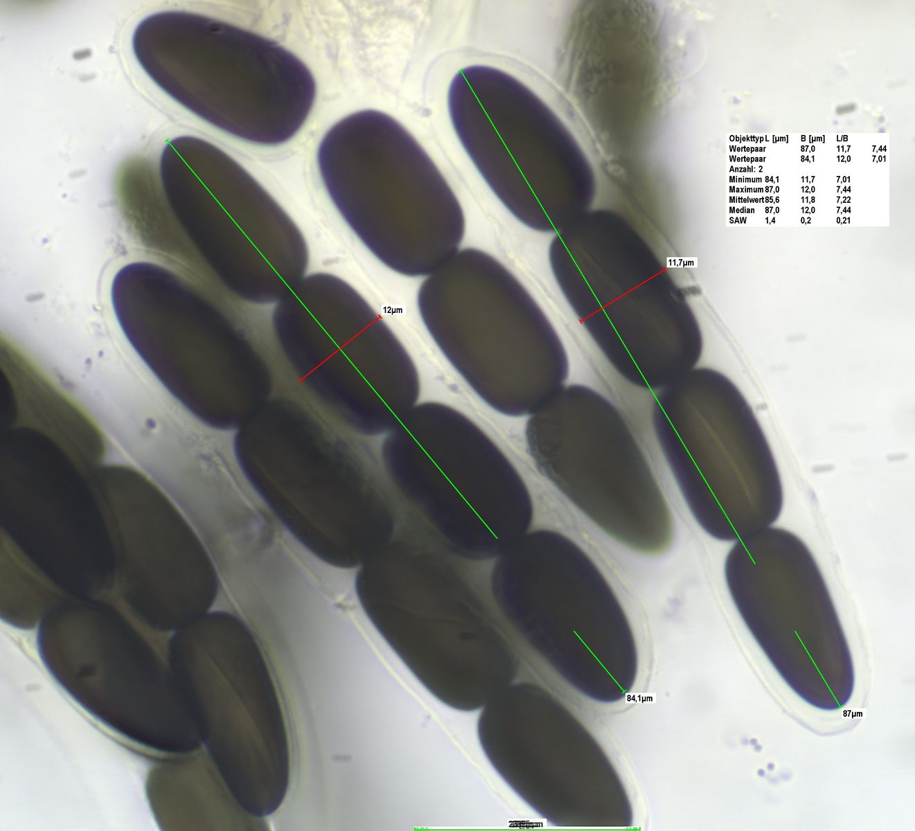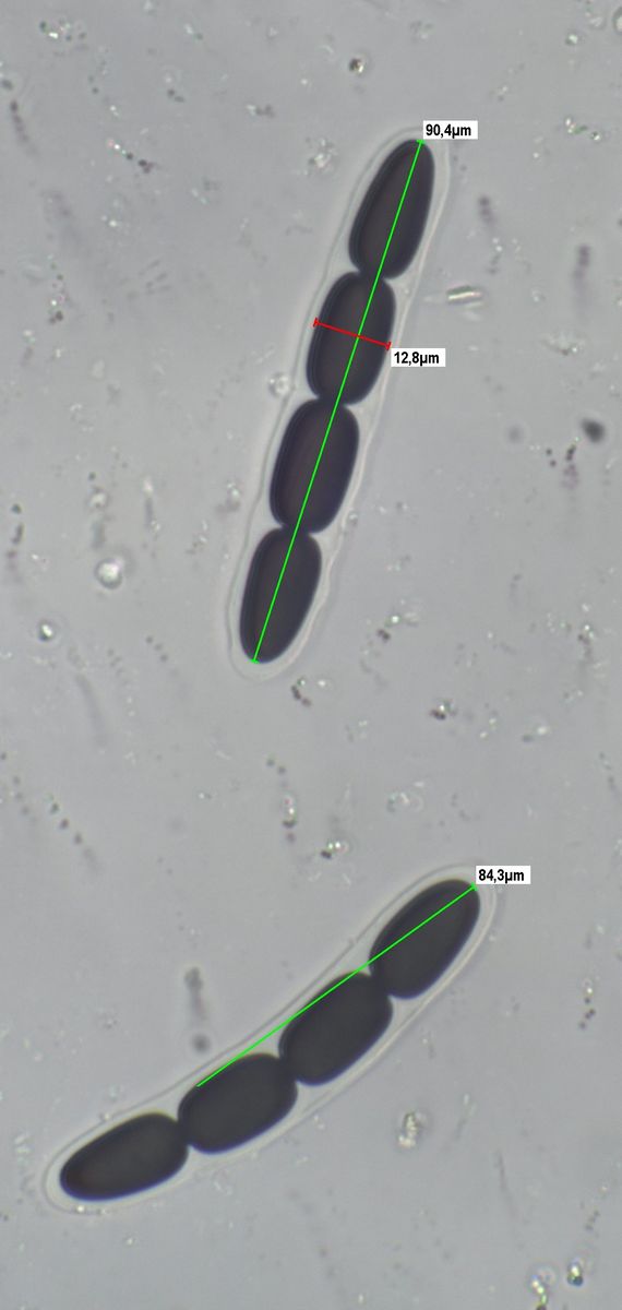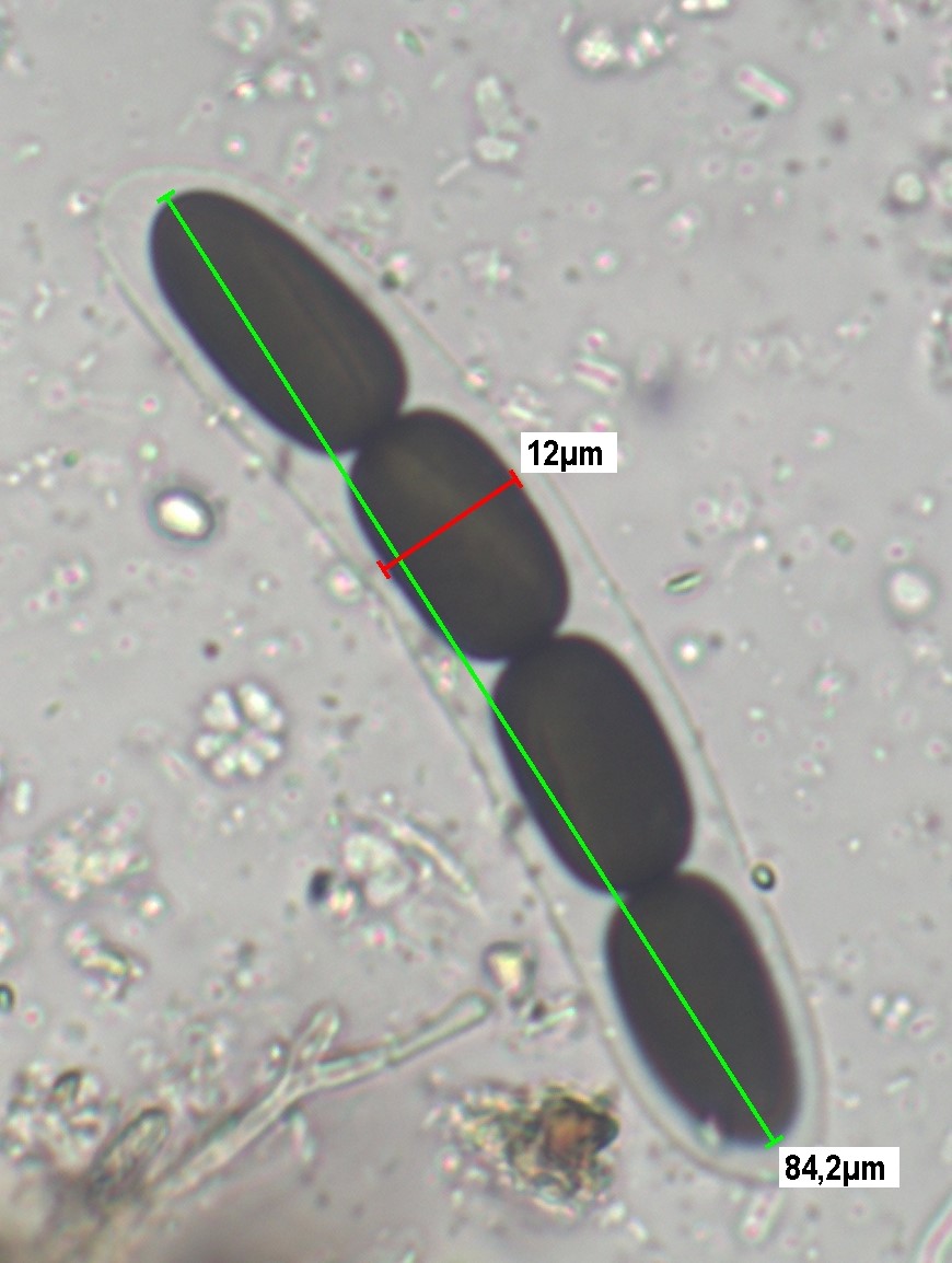 Die Sporen messen 84-91 x 12-14 um, die Keimspalten sind parallel , teilweise aber auch leicht schräg