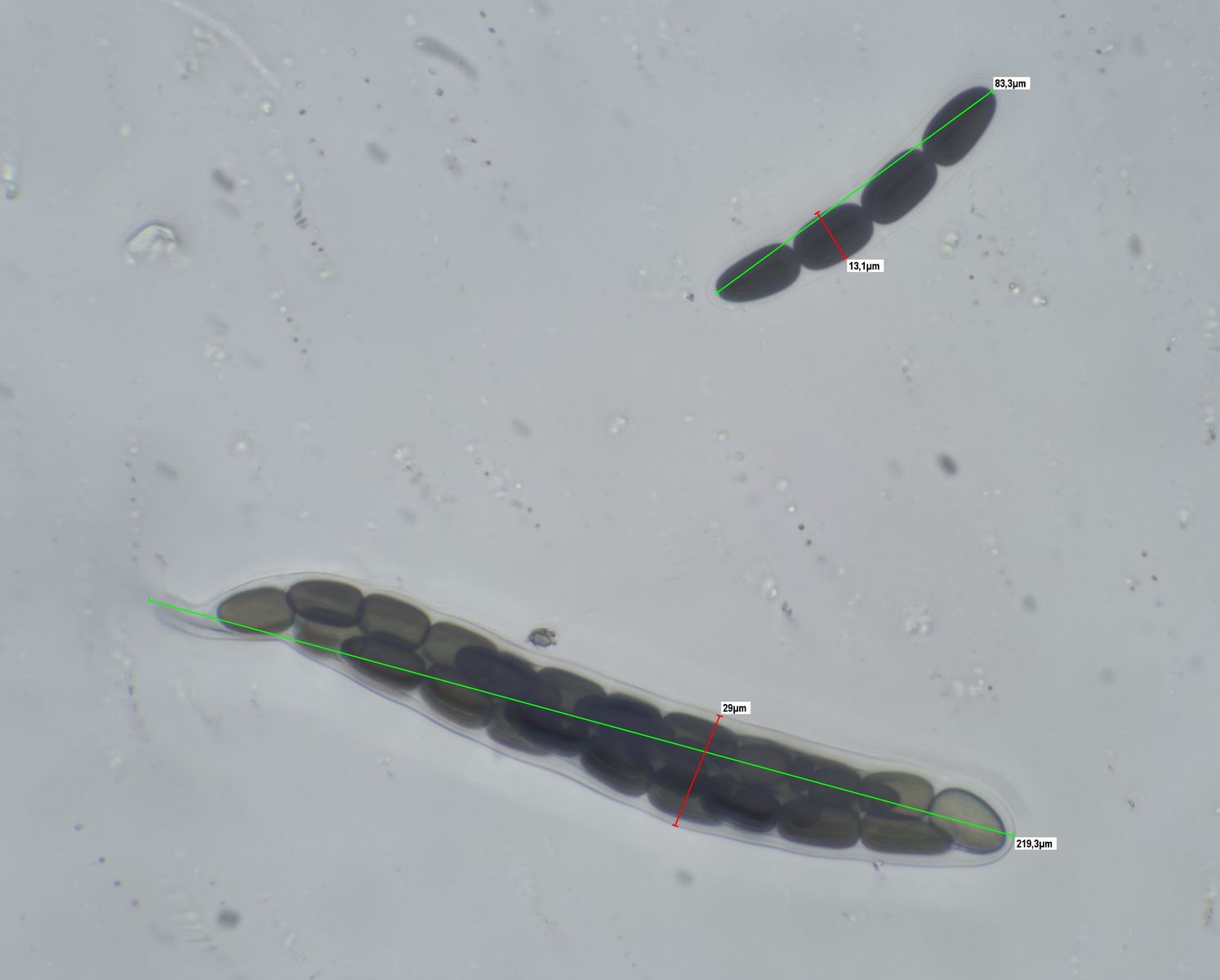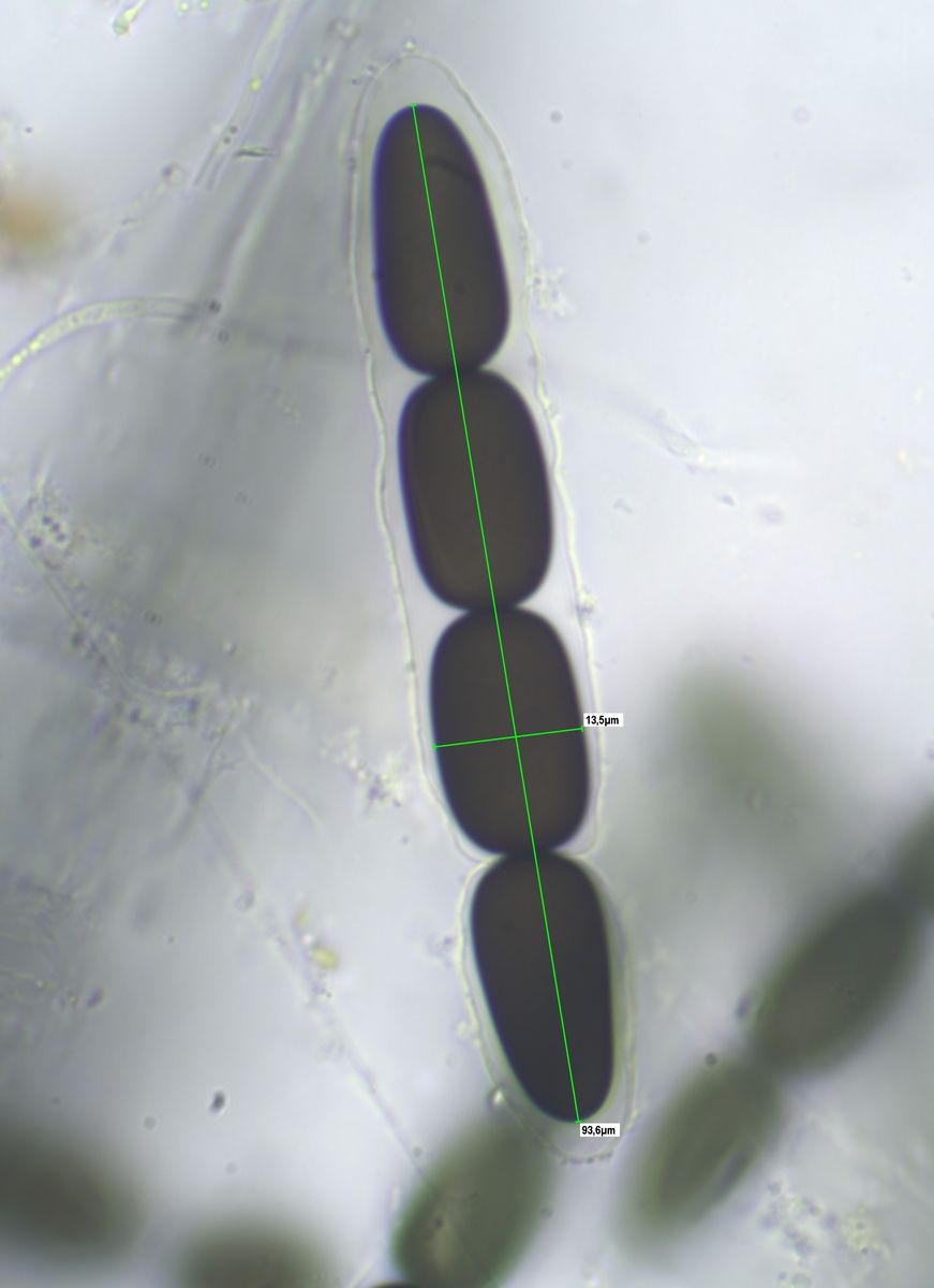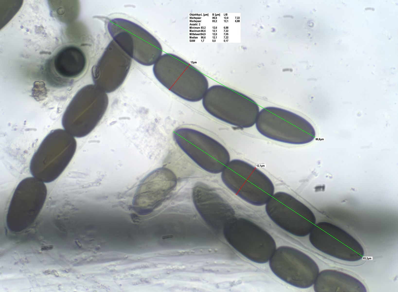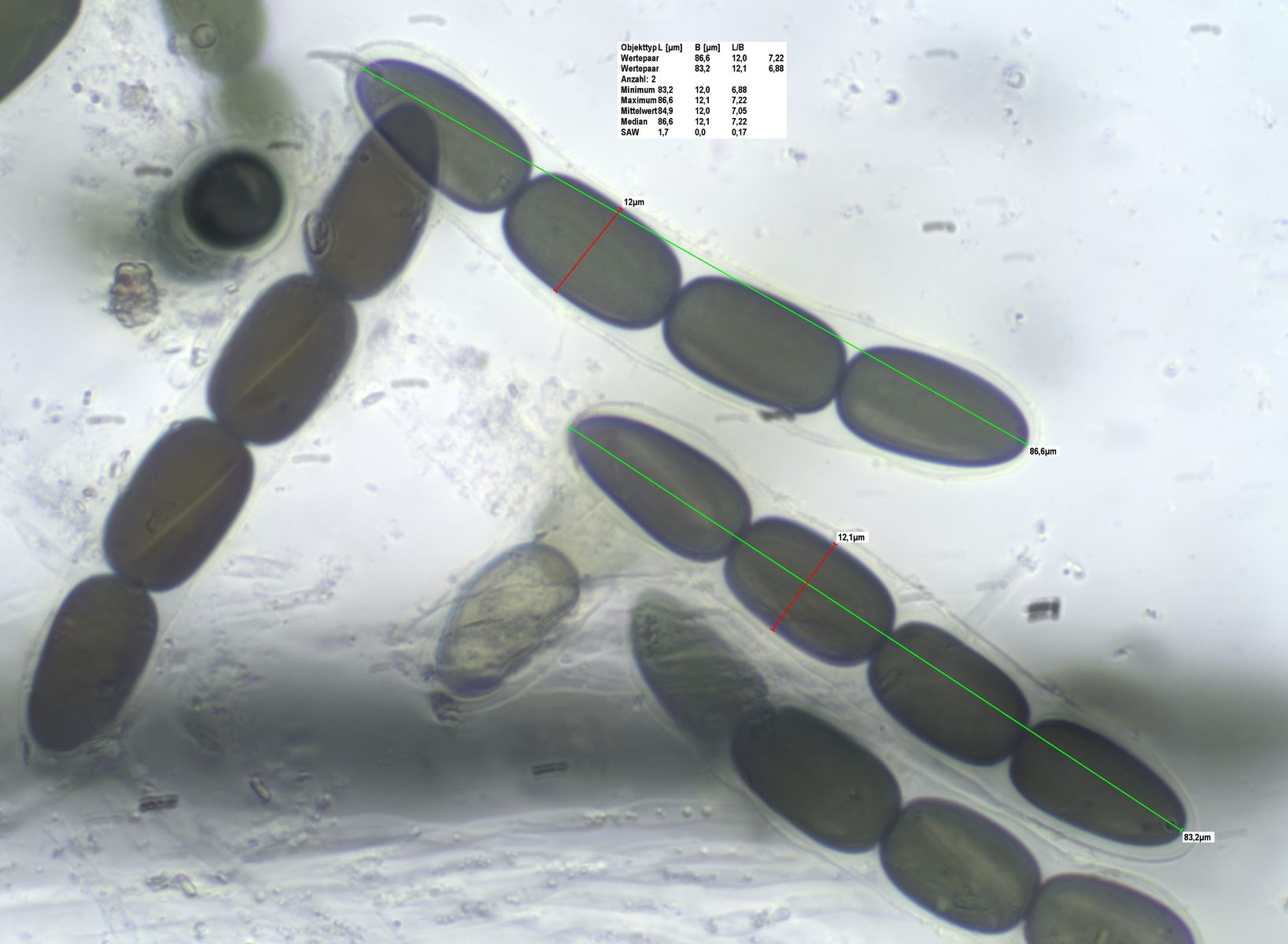 Die Sporen messen 84-91 x 12-14 um, die Keimspalten sind parallel , teilweise aber auch leicht schräg