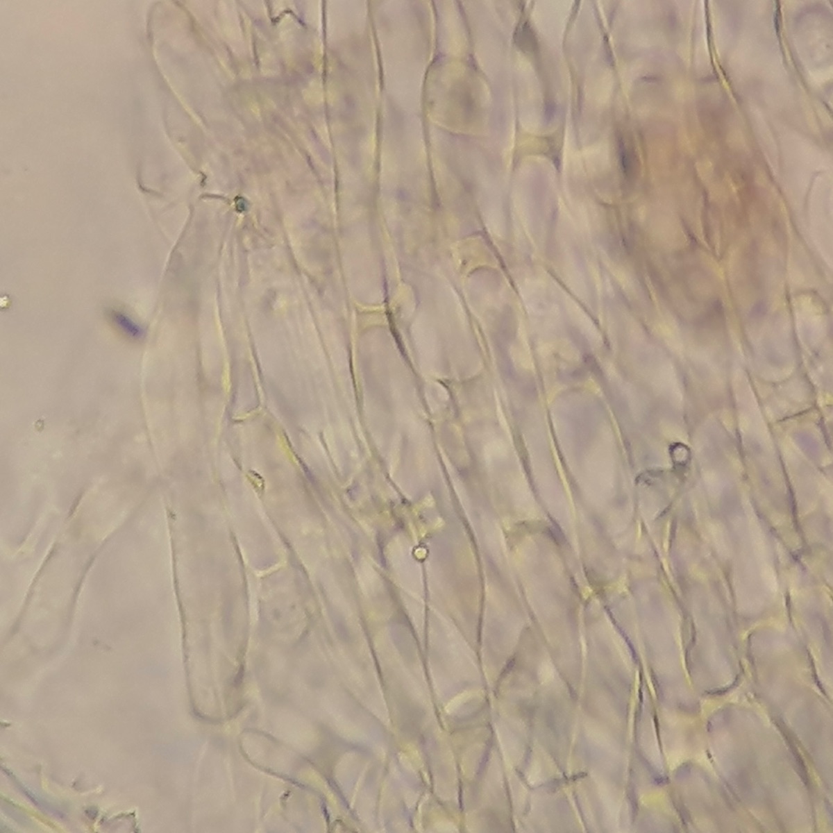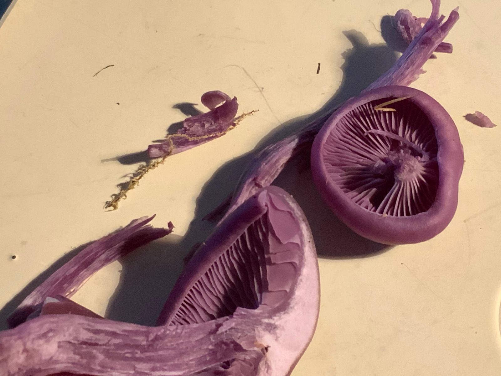 Hutfleisch ganz hell lila, deutlich abgesetzt von Lamellen und Huthaut (Foto ist farbverfälscht, aber man sieht gut den Helligkeitsunterschied zwischen Hutfleisch und dem Rest.)