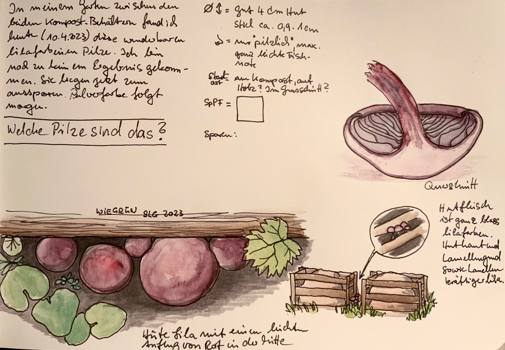 Gestern, am Ostermontag fand ich in meinem Apfelgarten wunderschöne, lila Pilze. Sie wuchsen aus einem der beiden Komposthaufen. Das Substrat konnte ich nicht erkennen, wuchsen die Fruchtkörper aus dem morschen Holz oder aus dem Kompost? Auch konnte ich sie nicht gut entnehmen, sonst hätte ich noch ganz in die Brennnesseln gegriffen.