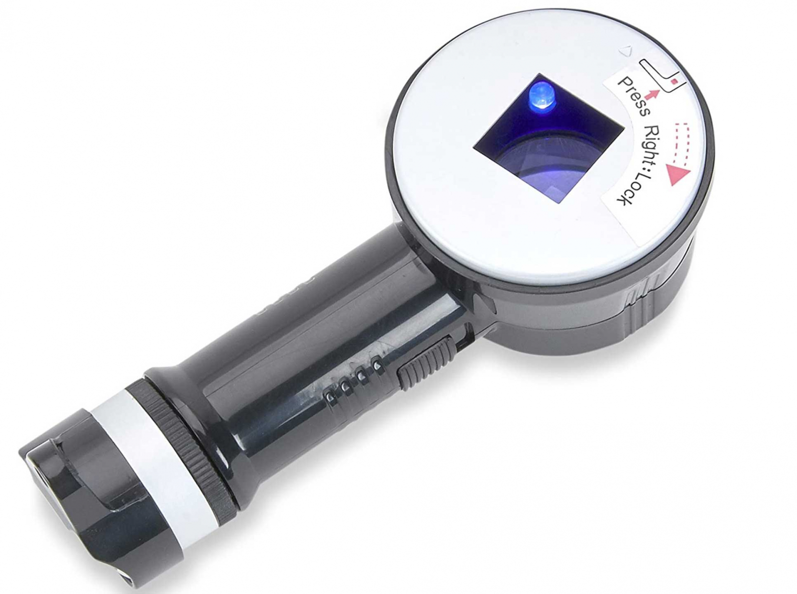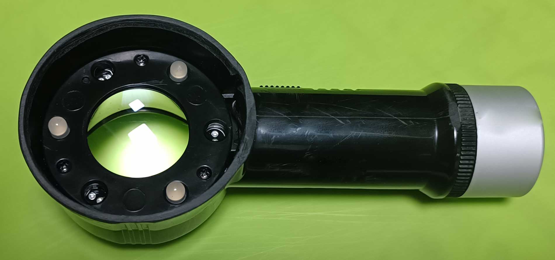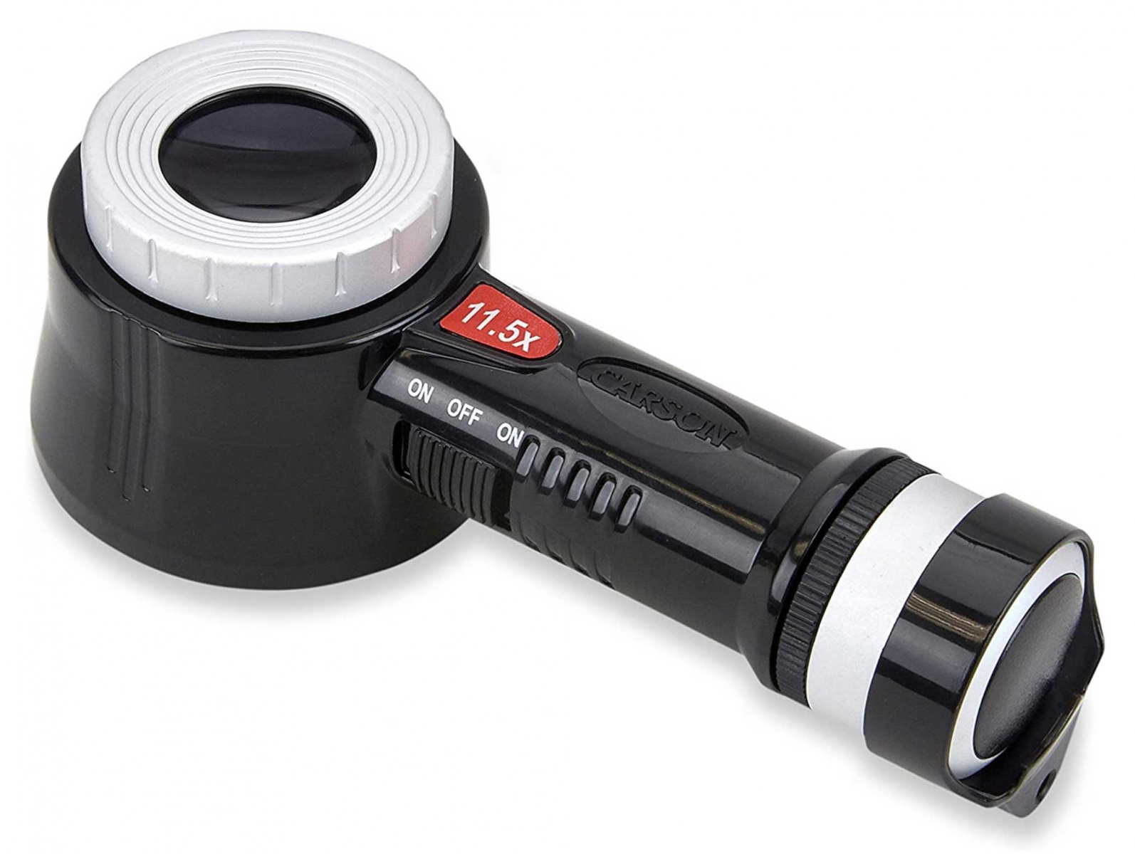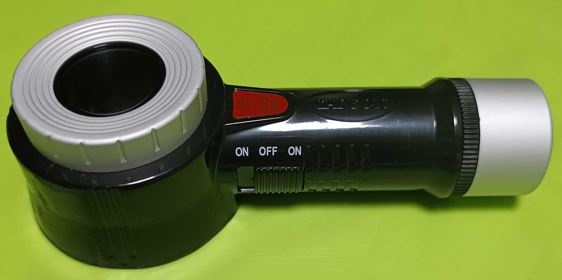 Nun zur Carson CP-45. Ja, sie scheint wuchtig und dick. Dafür besitzt sie ein Linsensystem aus zwei Glaslinsen. Und das sieht man sofort im Bild, 95 % der Bildfläche werden absolut scharf abgebildet. Wow! Dazu kommt eine ringförmige Beleuchtung aus drei Stück mattweißen LED. Als Batterien werden 3 Stück AAA verwendet. Zusätzlich sind 3 UV-LED vorhanden. Die UV-LED sind absolut unbrauchbar, weil sie keine Filter besitzen und mehr blaues Licht als UV erzeugen. Nachteilig ist der Schiebschalter. Die Stellung AUS ist in der Mitte. Hier muss man sehr genau schalten, um nicht aus Versehen die UV-LED einzuschalten anstatt AUS.