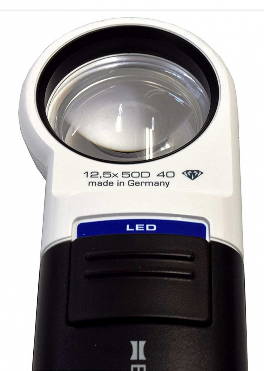 Die Lupe von Eschenbach ist flach, besitzt eine 38 mm Linse. Batterien sind 2 Stück AA. Sie liegt gut in der Hand, ist flach. Allerdings ist die Optik, da nur eine Linse verbaute ist, nicht brauchbar. Man hat nur eine sehr kleinen Schärfepunkt. Der Großteil der restlichen Lise zeigt absolute Unschärfe. Für unsere Zwecke absolut ungeeignet. Schade, da die Lupe ein schönes Design hat.
