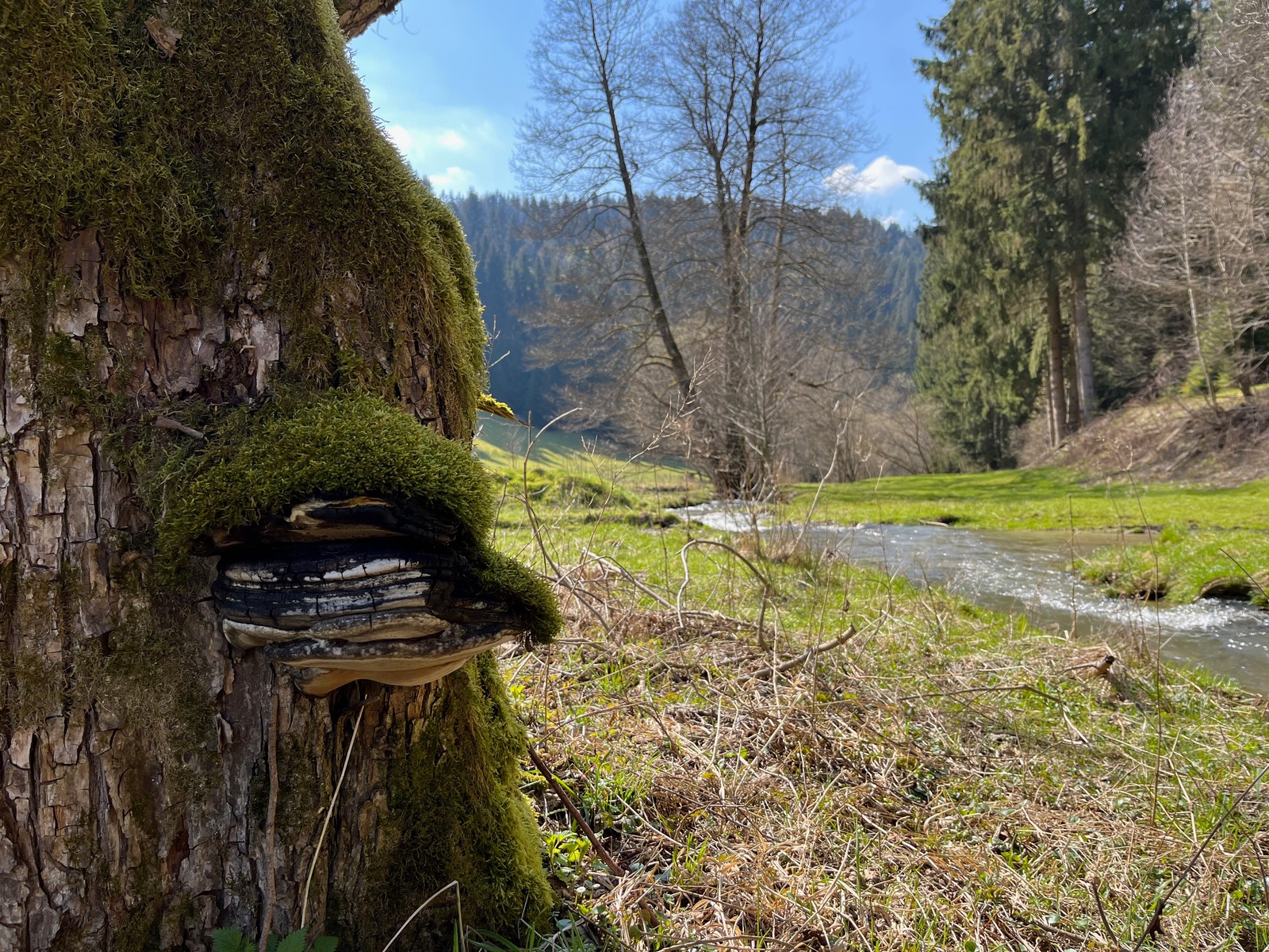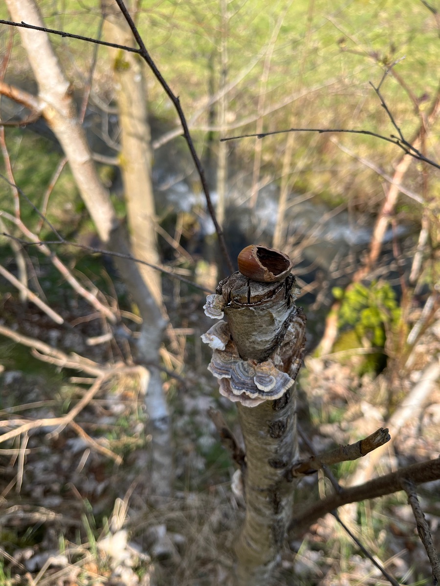 14. Dann wechselten wir in ein anderes Habitat. Müllfrei, aber mit seit zwei Jahren zunehmenden Kahlstellen an den ehemals bewaldeten Hängen. Trotzdem immer noch ganz schön. Das Tal der Weißen Schwarza. Hier fanden wir u.a. den Pilz dem die Anfrage am Anfang galt. Hier ein Feuerschwamm an Erle.