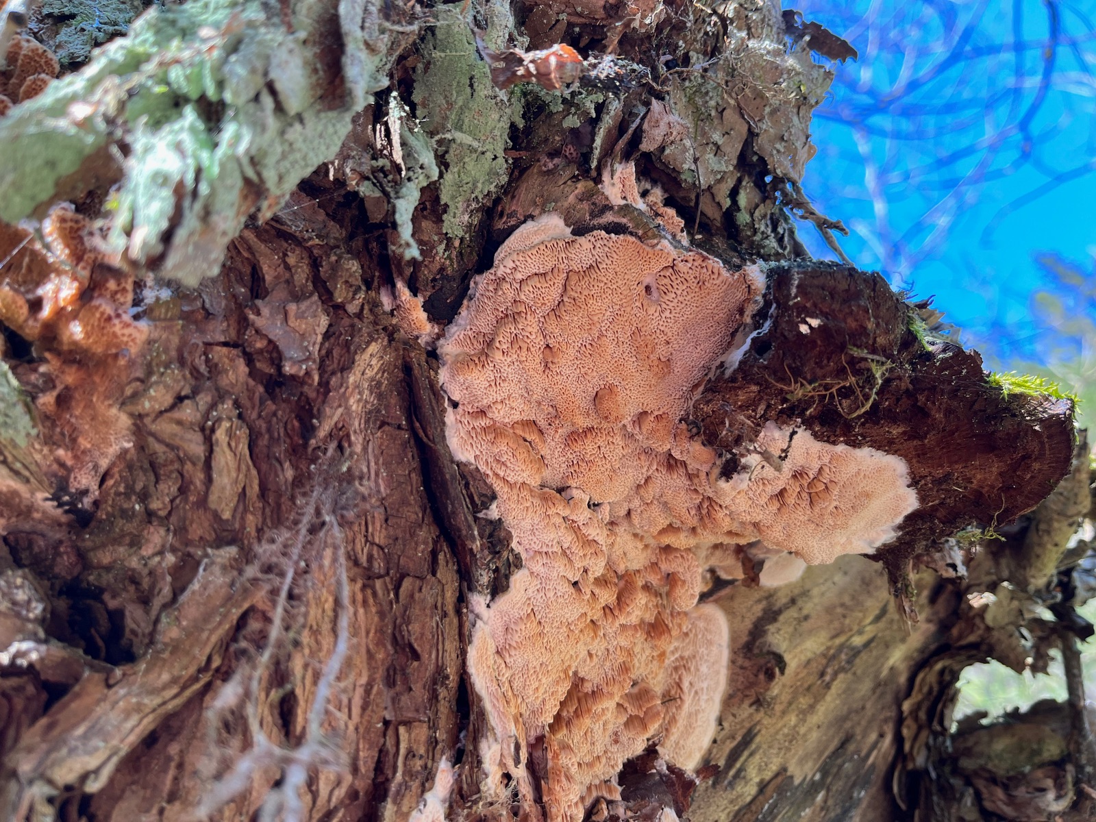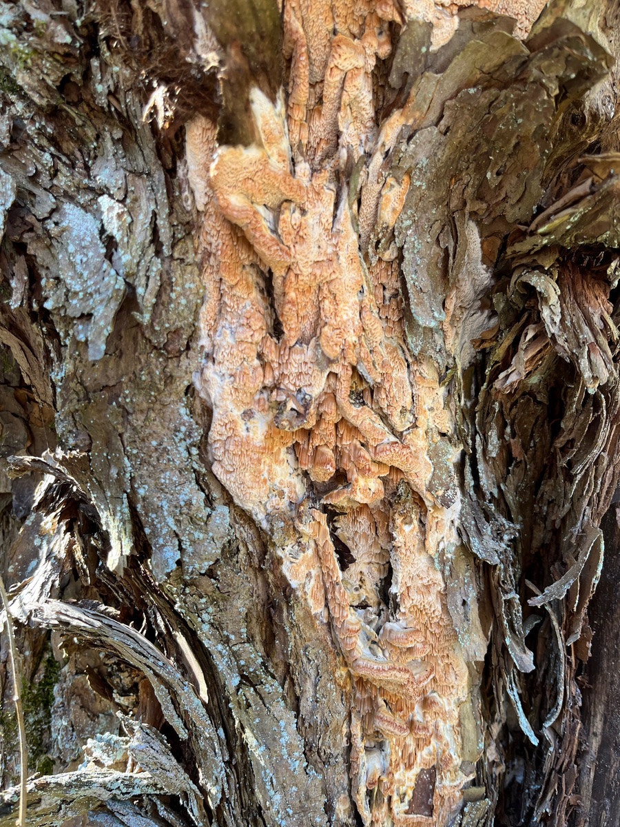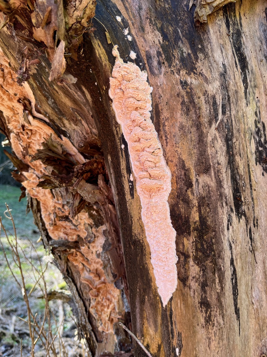An Weide wuchs diese Tramete über mehrere Meter hinauf bis in die Spitze des Baumes. Sie hatte einen Habitus zwischen Blasser Borstentramete, Rosa Saftporling und Reihiger Tramete. Ockerfarben mit einem Rosastich. Der Geruch war nicht unangenehm.