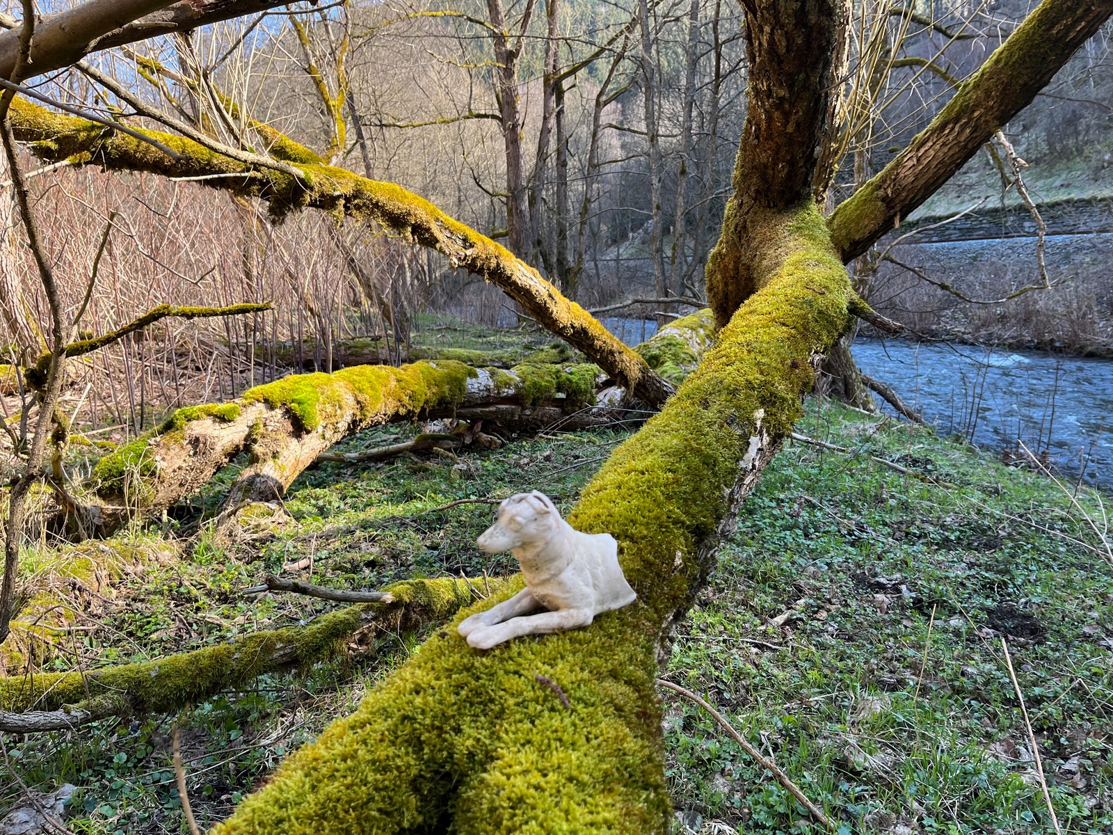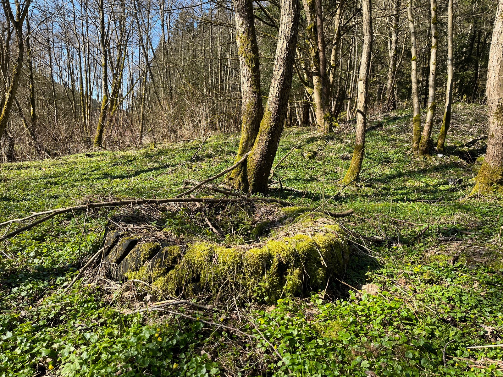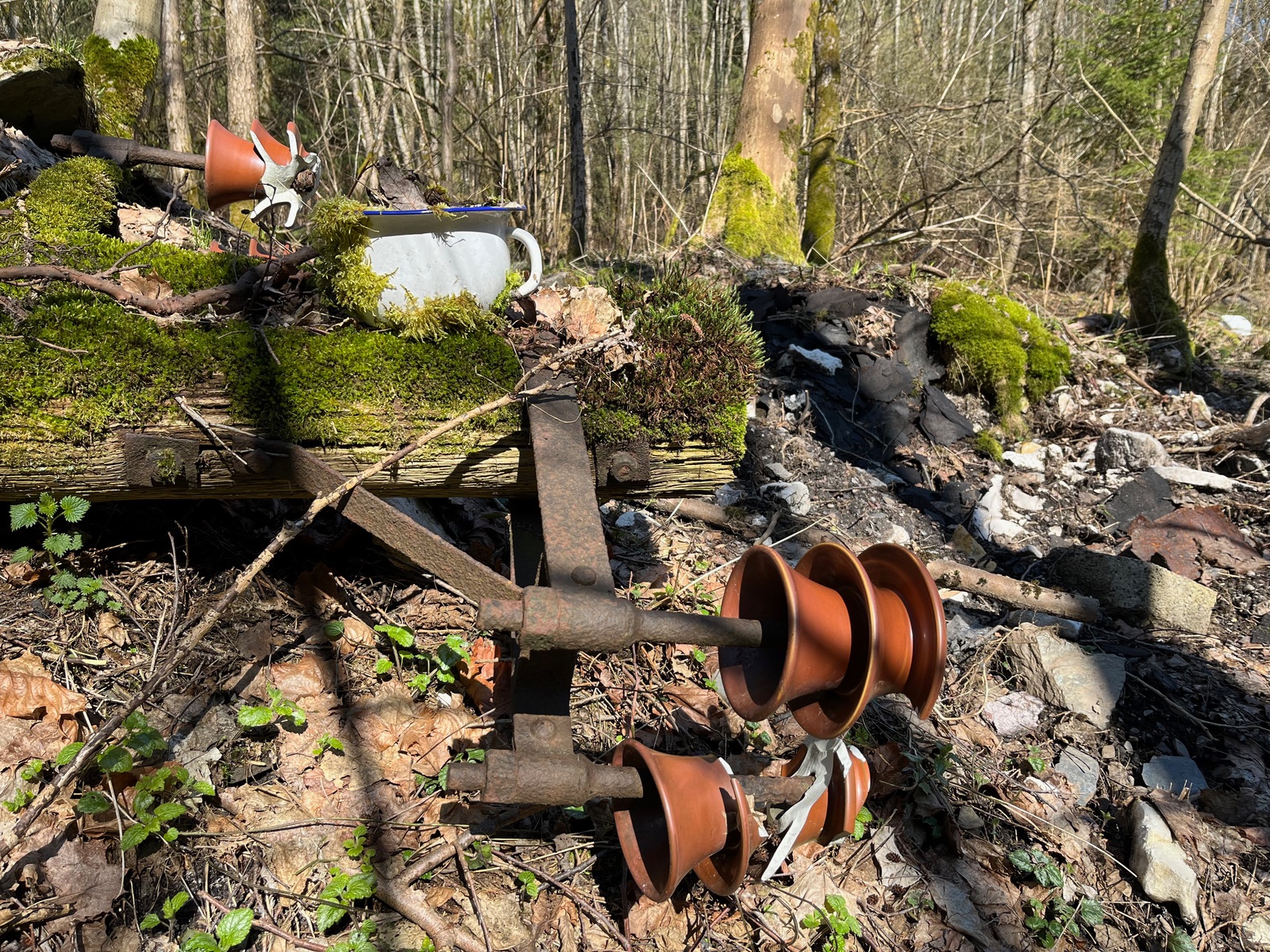 1. Ein erster Blick ins Habitat. Unter dem Frühlingsgrün verstecken sich die anthropogenen Hinterlassenschaften des letzten Jahrhunderts. Stellvertretend posiert ein Überbleibsel aus der Zierkeramik.