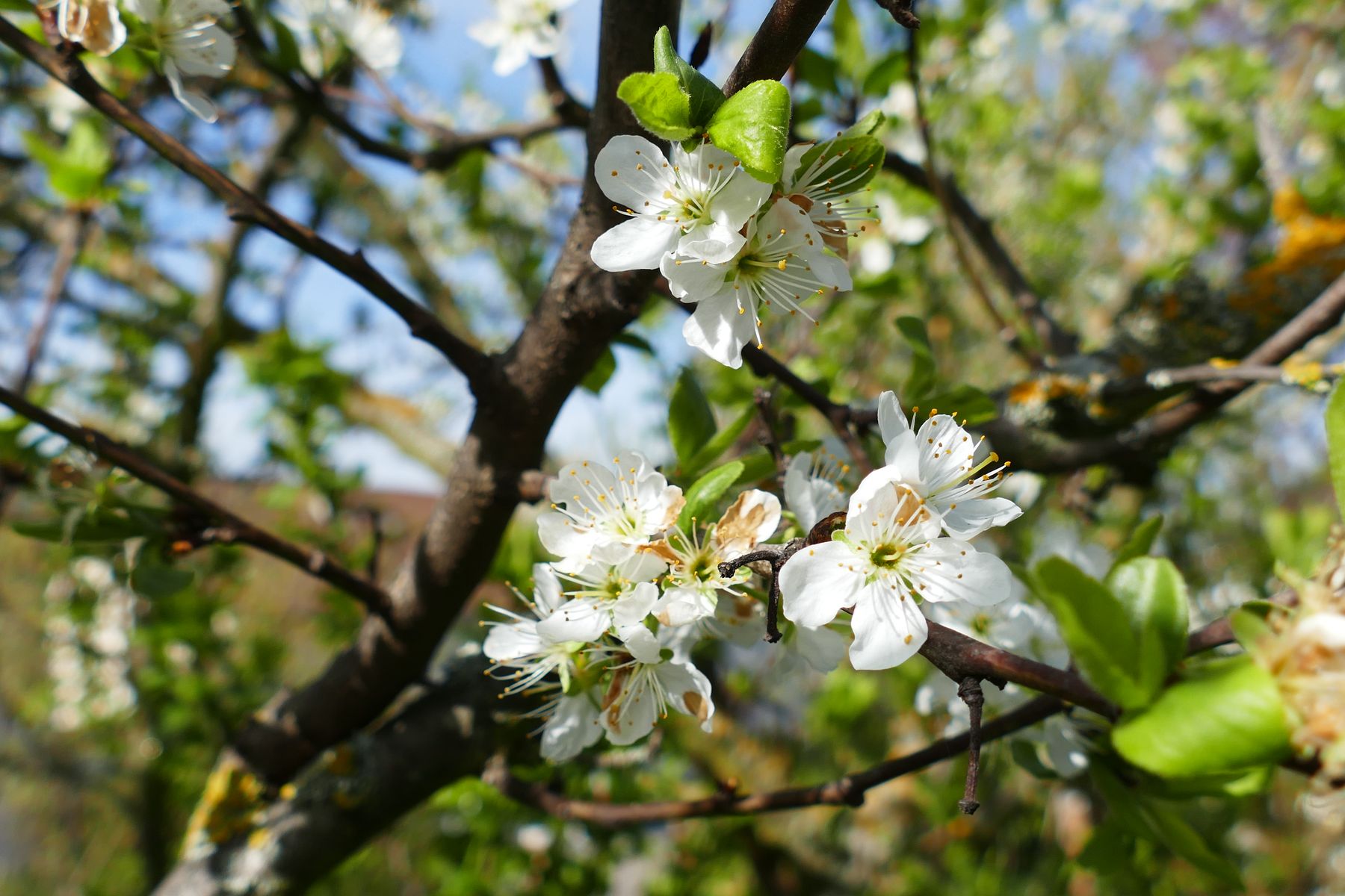 Am Mirabellenbäumchen, das ich vor 10-15 Jahren gesetzt habe, schwindet die weiße Frühlingsblütenpracht, die Flechten aber bleiben und mehren sich stetig.