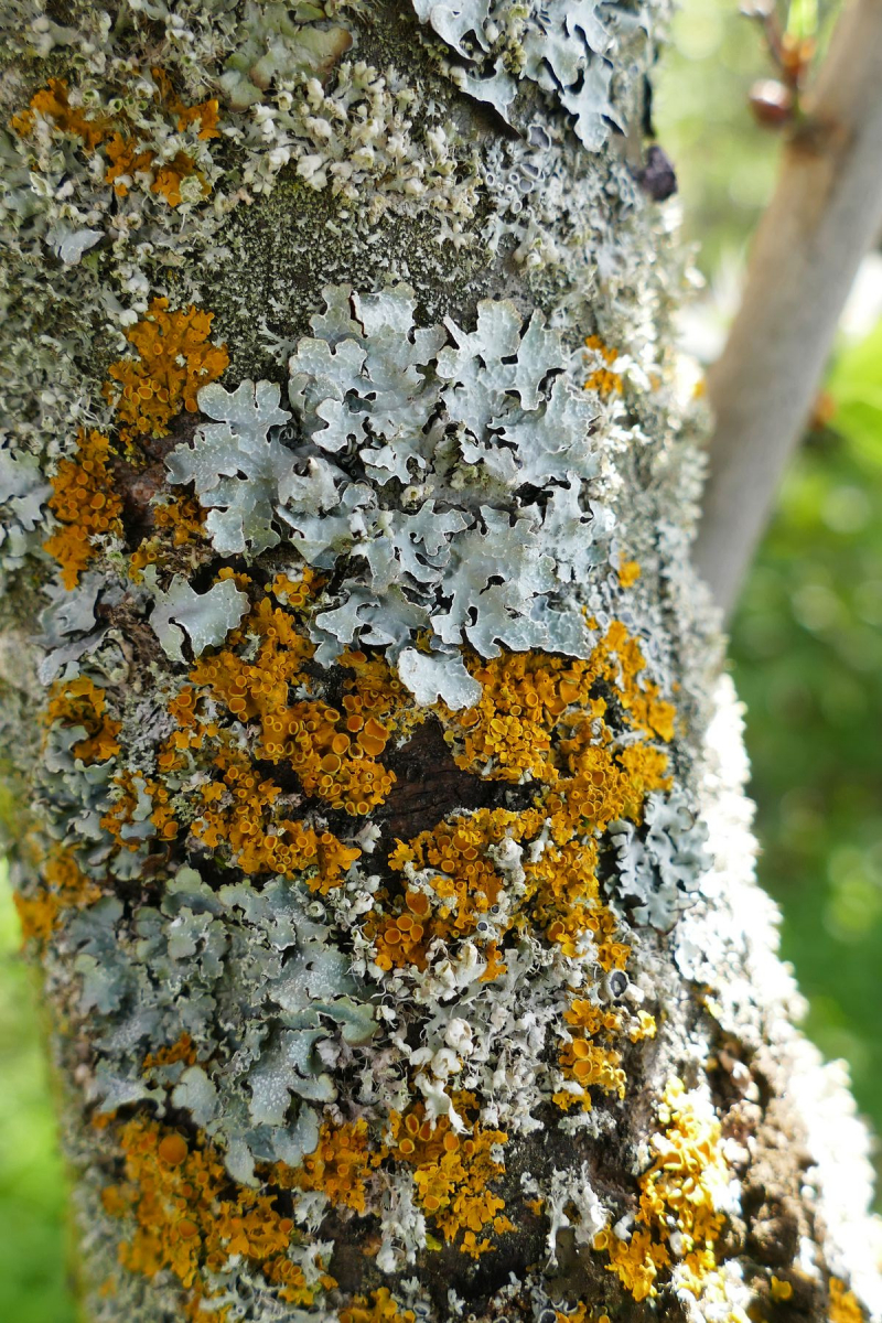 Bild 2 Dicht beflechteter Mirabellenstamm mit Xanthoria parietina, Parmelia sulcata, Punctelia subrudecta, fruchtender Physcia adscendens (und ev. Hypogymnia physodes?)