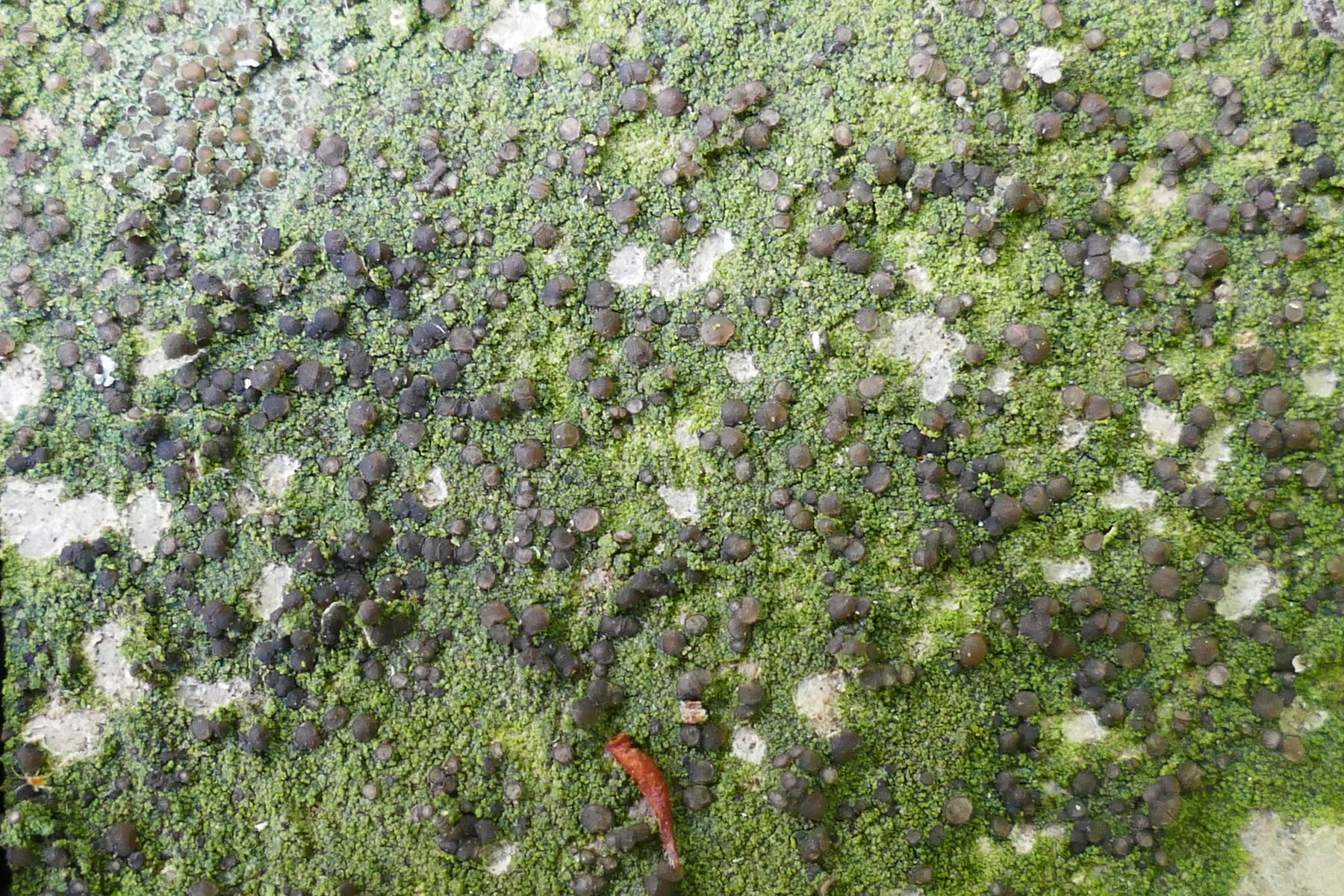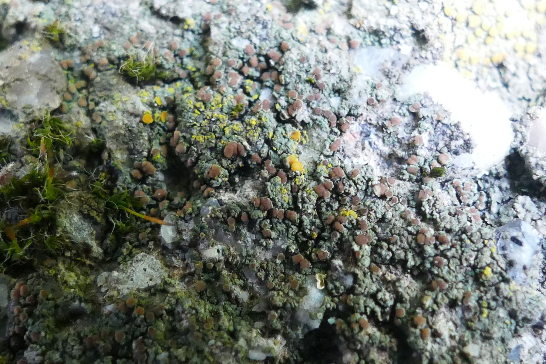 Bild 12b Üppige, gestielte, braune Apothecien auf körnig-grünem Thallus. Die nadelförmigen Sporen führen letztlich zu Bacidina caligans, einem Flechten-Pionier