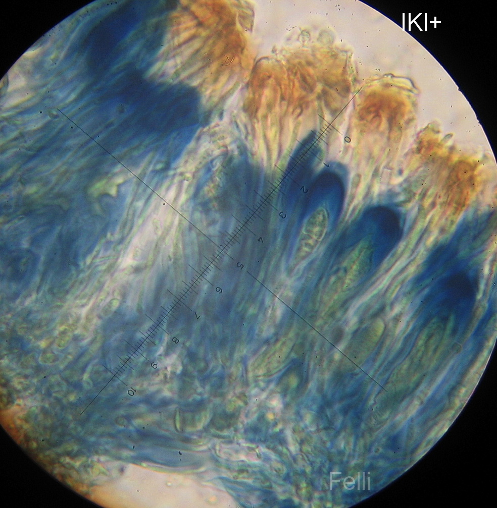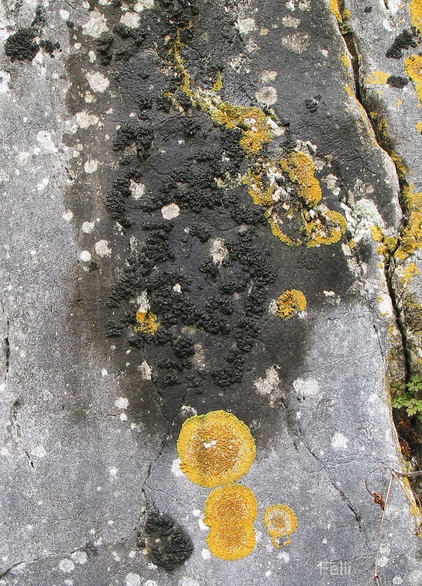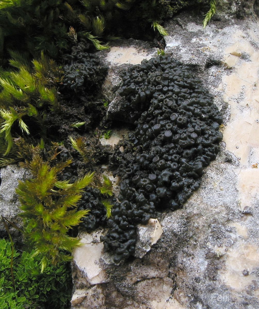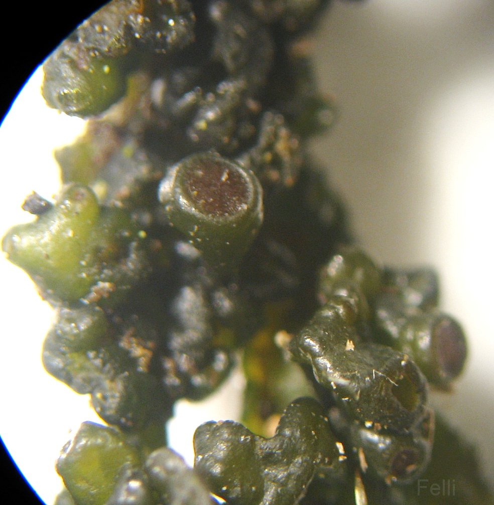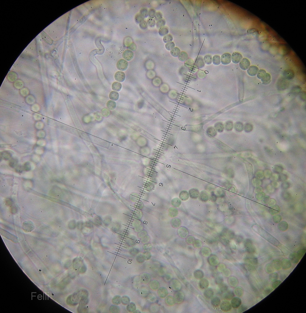 PS: Die olivgrünen Zellketten stammen von dem Phycobionten der Gallertflechte, Nostoc commune, der dem Thallus makroskopisch die Farbe verleiht.