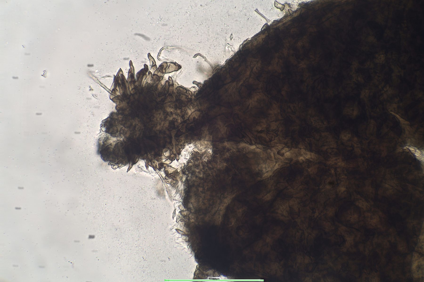 Squamufolien: verklebte Haare, mit dunklen Spitzen am Fruchtkörper in der Gattung Schizothecium (Gattungsmerkmal)