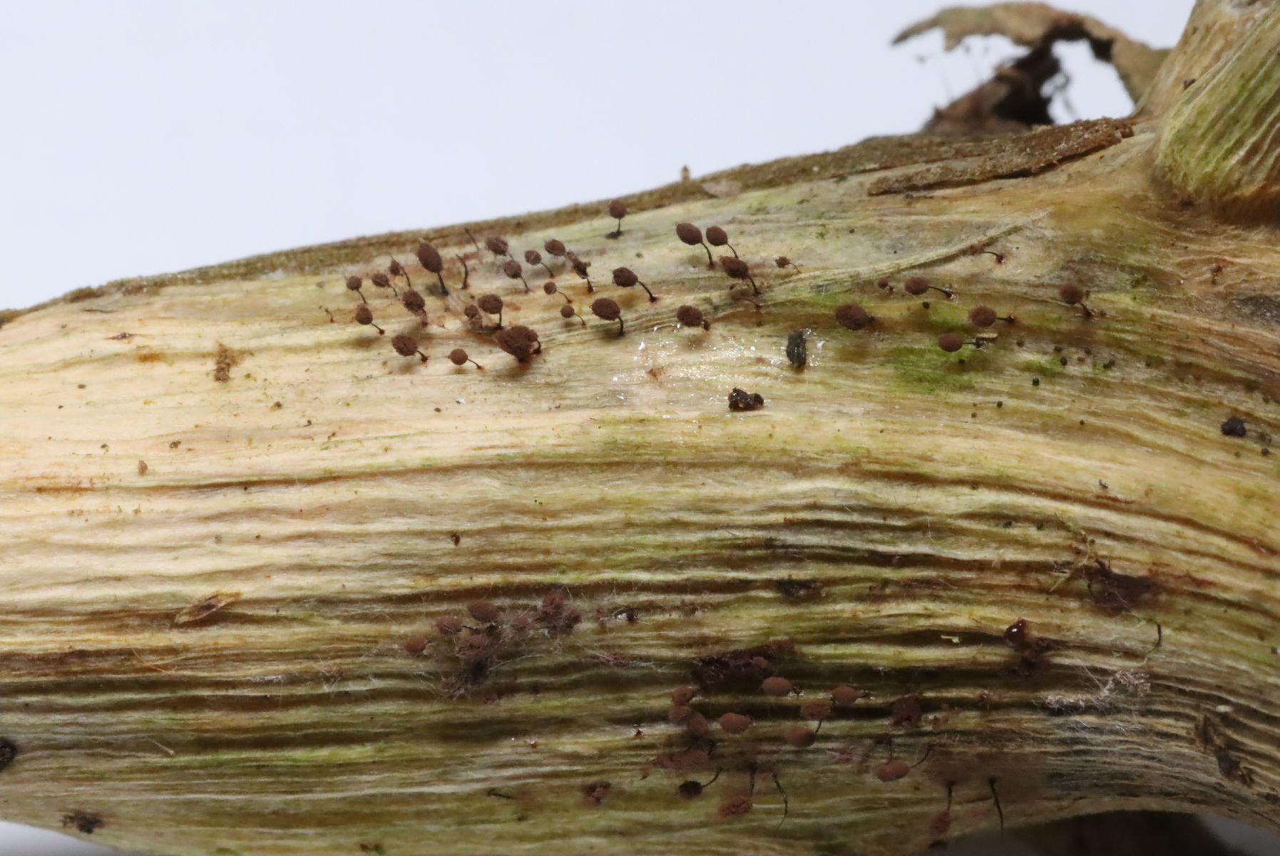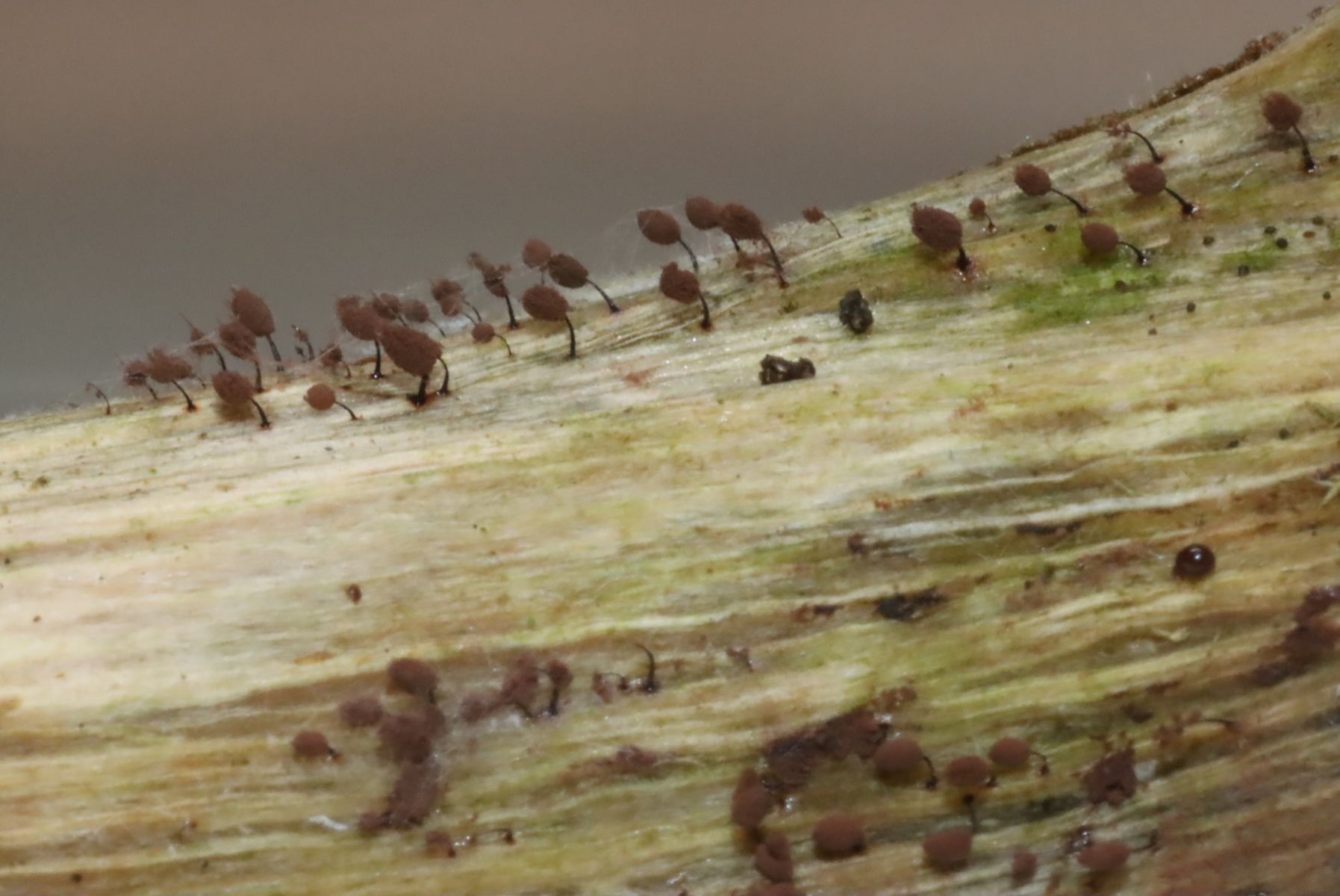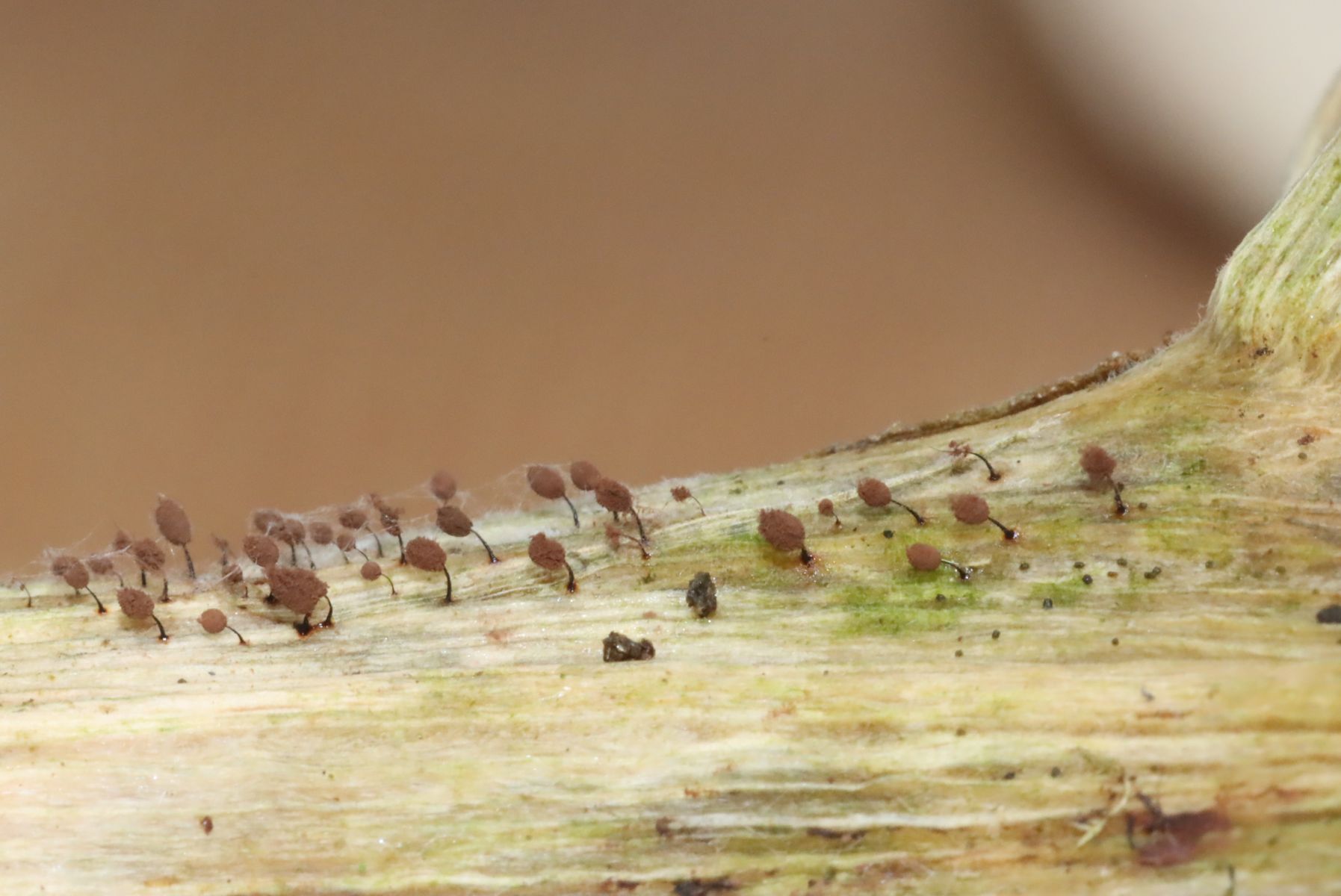 bei einer Wanderung durch die Au hab ich mangels Pilze ein vorjähriges Drüsiges Springkraut entnommen, um mal zu sehen, ob da sich vielleicht Pilze finden lassen. Siehe da, es fanden sich kleine nickende gestielte Schleimpilze, sehr nett anzusehen.