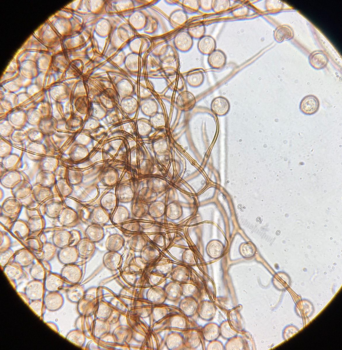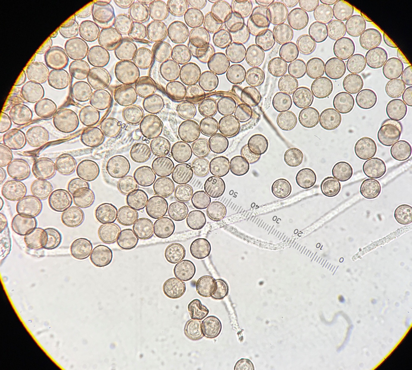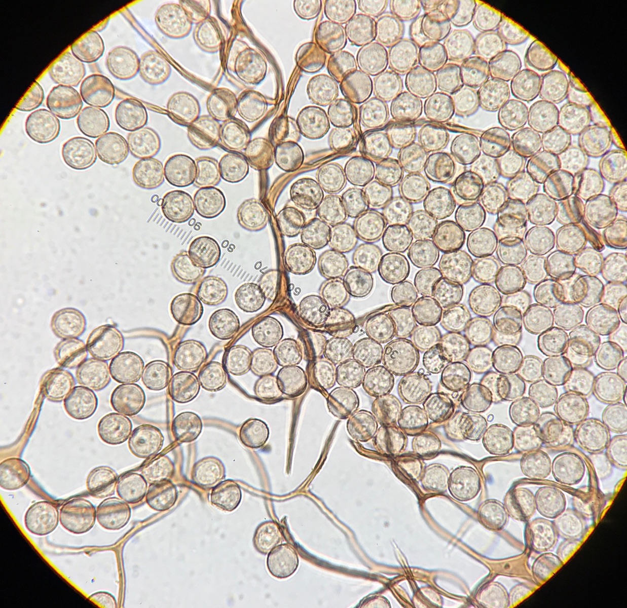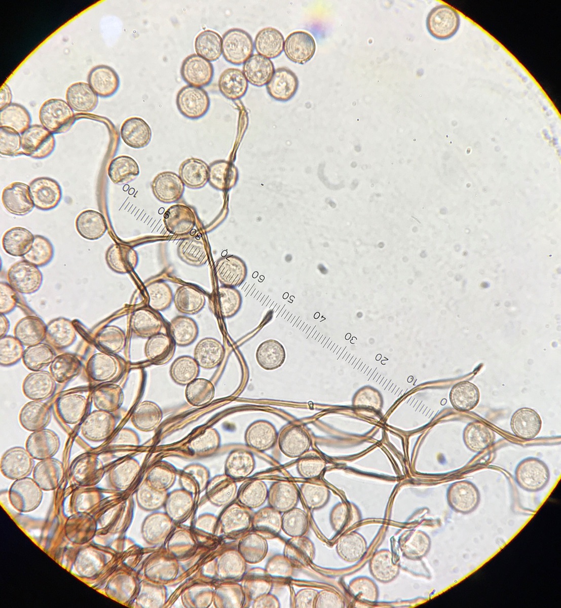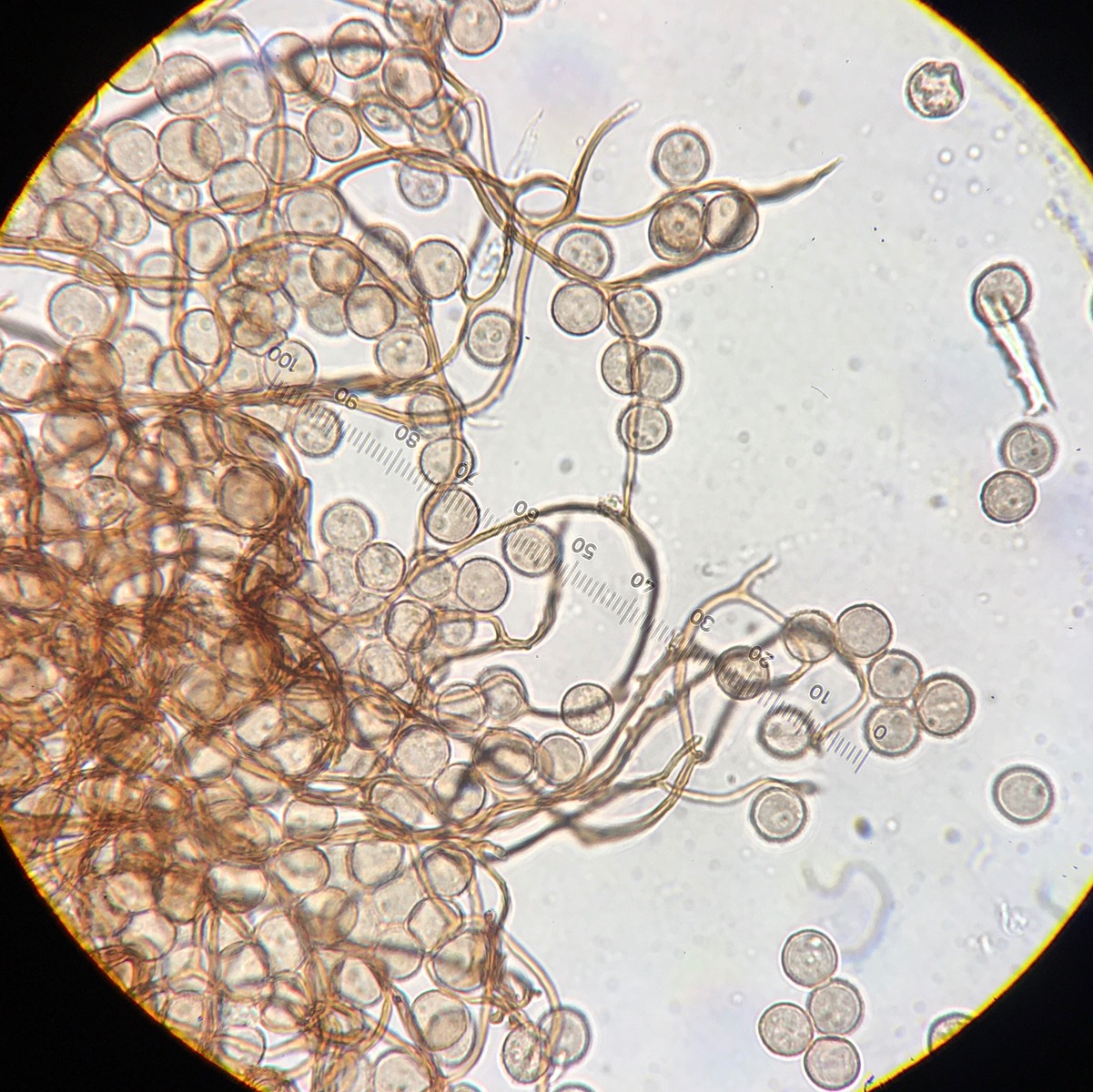 Mikroskopiert hab ich den Fund auch - die Sporen messen 7,5-9 x 6,5-8,5, sind subglobos bis globos und fein rau, wie ich meine. Die Capilitiumfasern sind eher glatt und verzweigt.